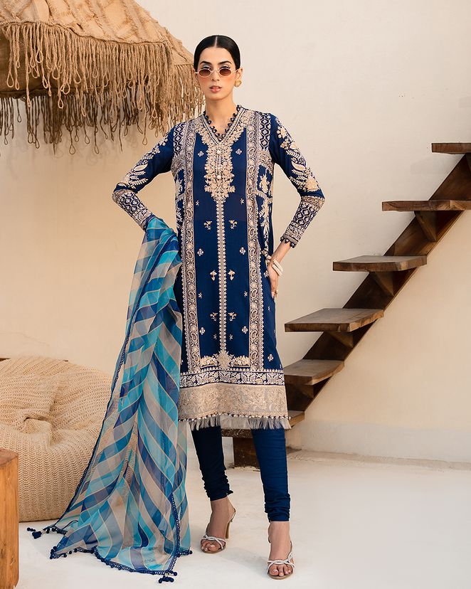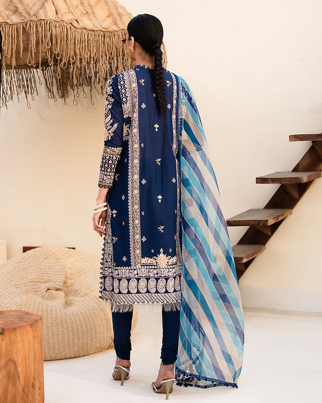 On a canvas of digitally printed airy lawn shirt, lush garden blooms come to life, playing a soulful symphony. The ensemble is completed with cotton dyed pants and a shimmering silver chiffon dupatta, evoking a timeless charm.