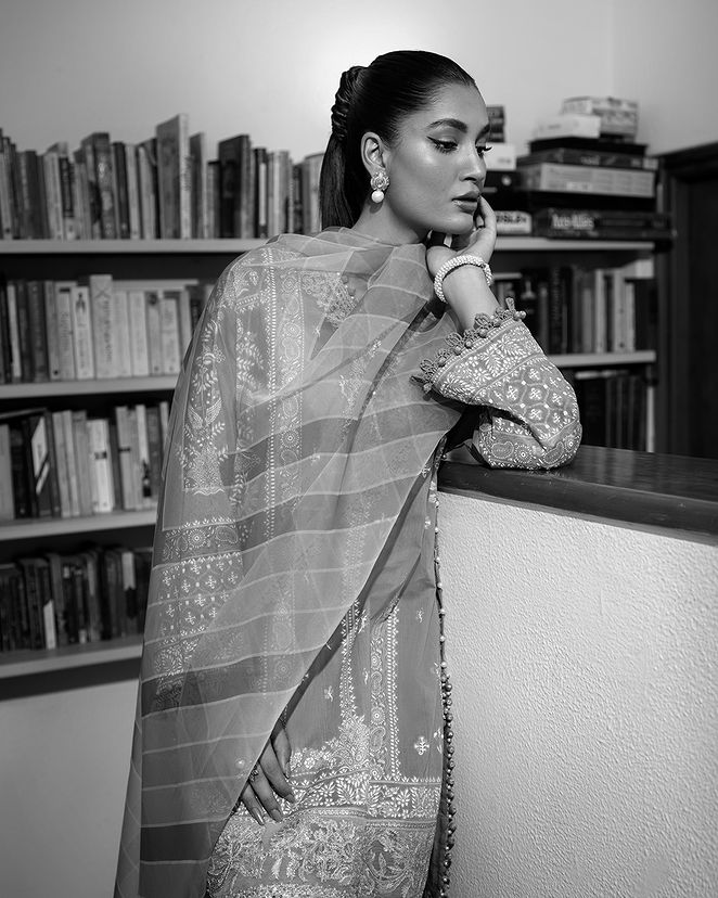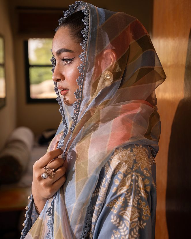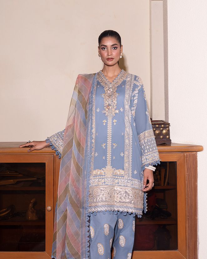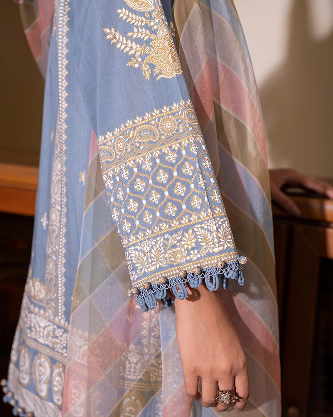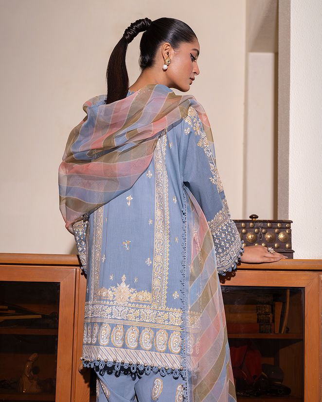 In the depths of zenith blue, a shimmering gold and paste printed shirt blooms with an elegant fusion of lace and floral embroidery. Complemented with cotton dyed pants providing grounding simplicity, and an organza dupatta with geometric prints exuding an air of modern mystique