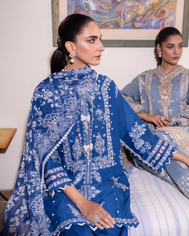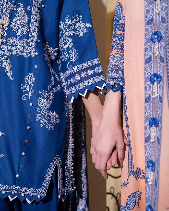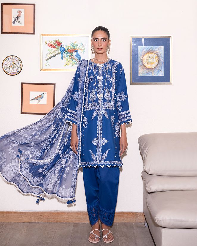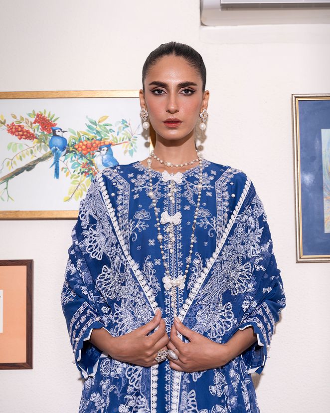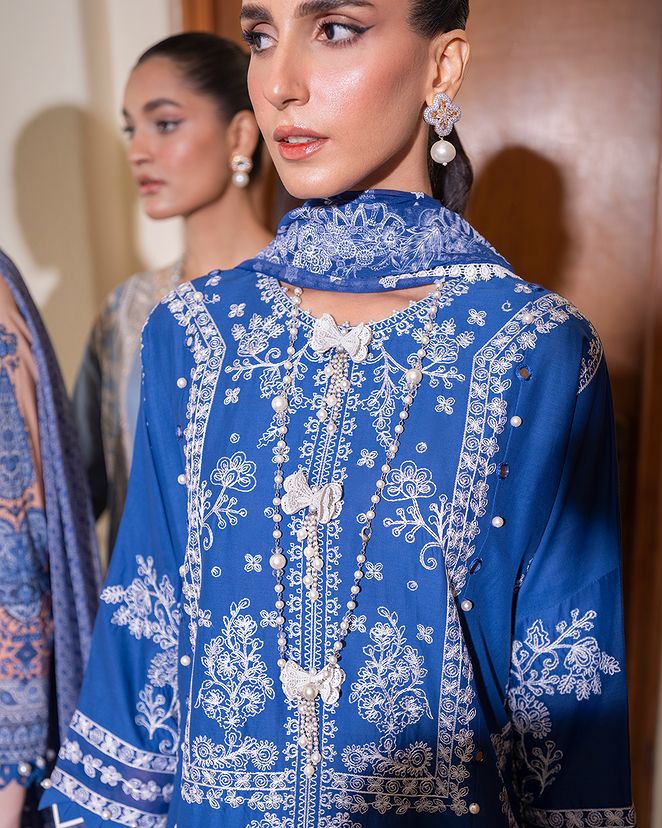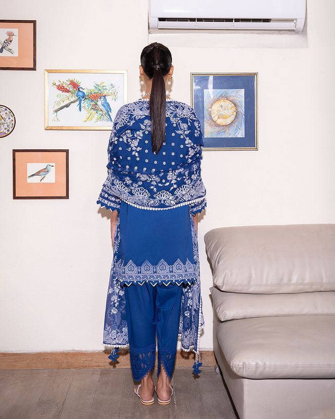Embark on a mystical journey with this azure lawn shirt adorned with intricate Moroccan-inspired embroidery. Paired perfectly with matching cotton dyed pants and a paste printed silver chiffon dupatta that shimmers like the stars in the night sky.