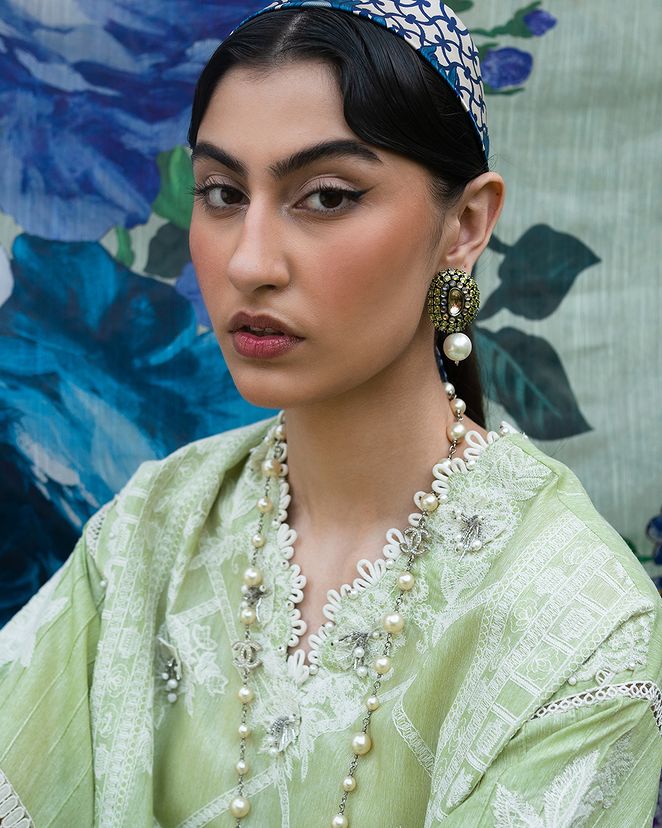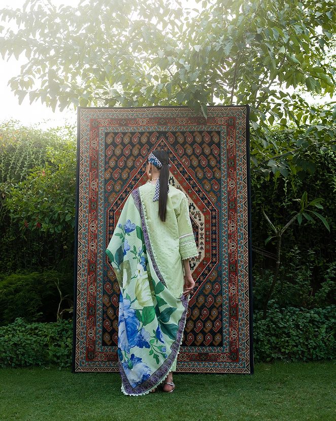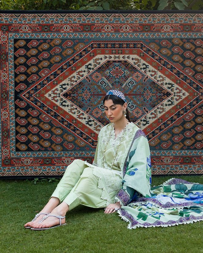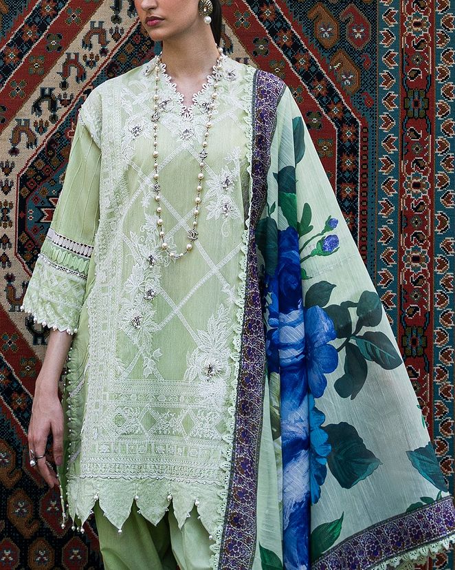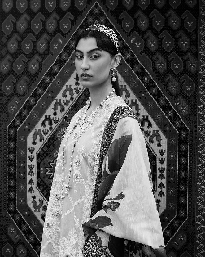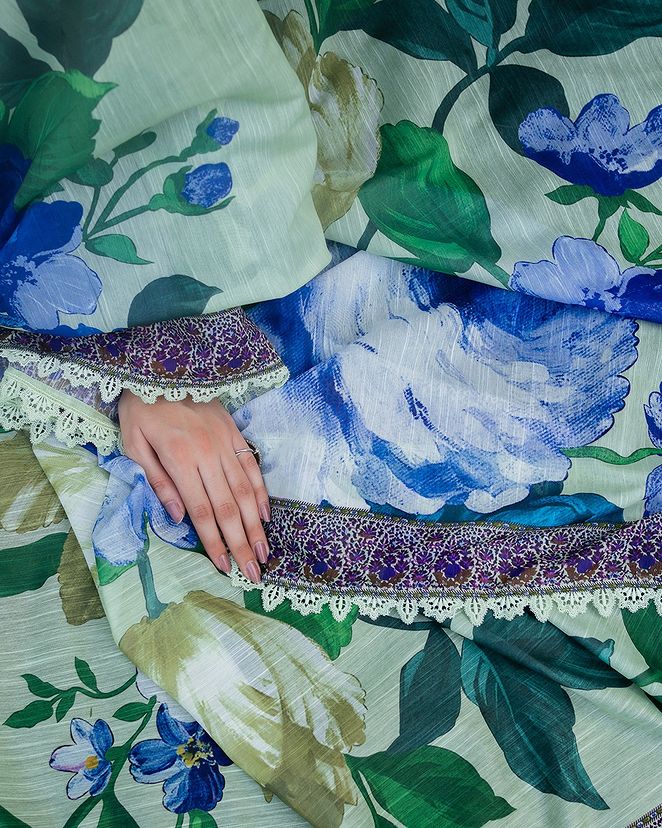 Embrace the artistry of woven chambray, adorned with lace blooms and geometric whispers. Harmonizing with cotton pants and a digital dupatta painted in watercolor reverie, unveiling a profound ensemble where elegance dances with ethereal grace.