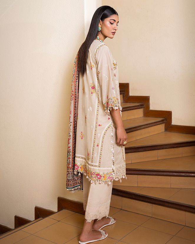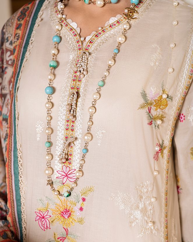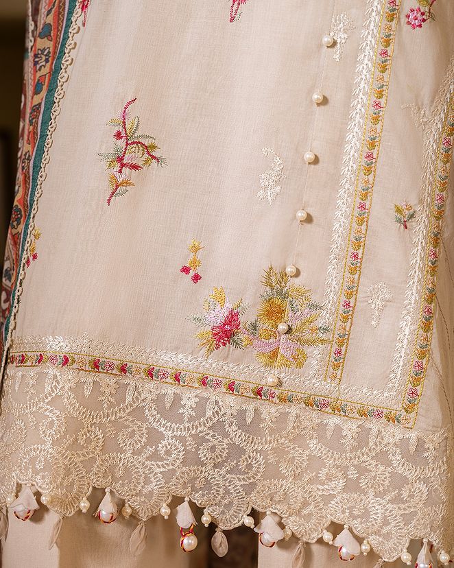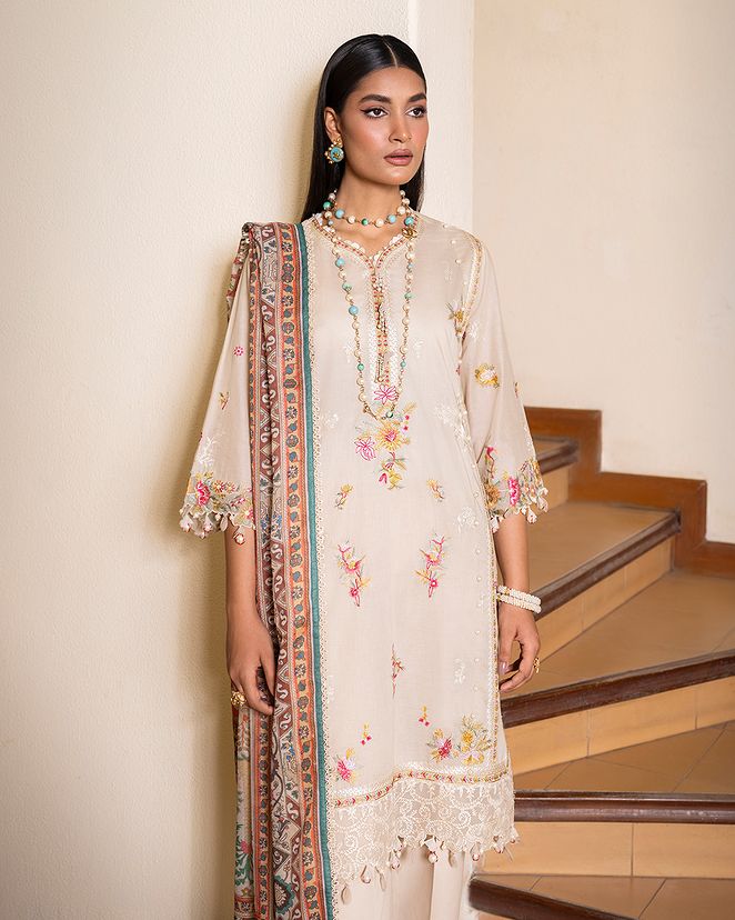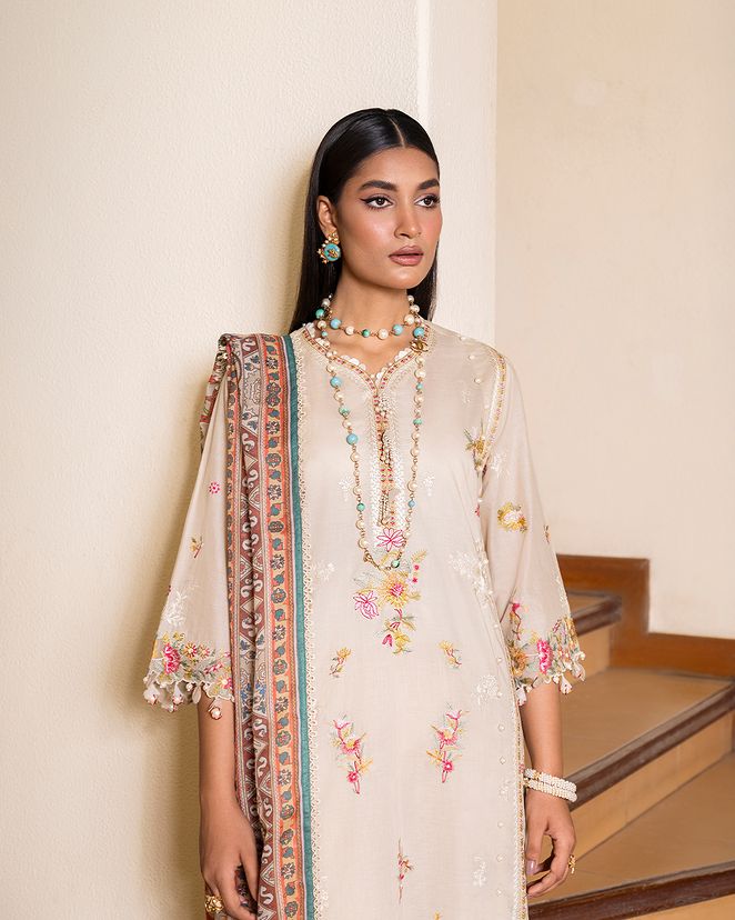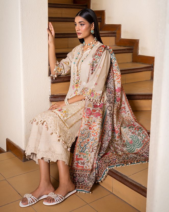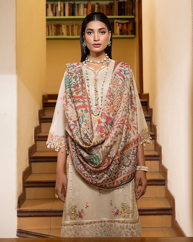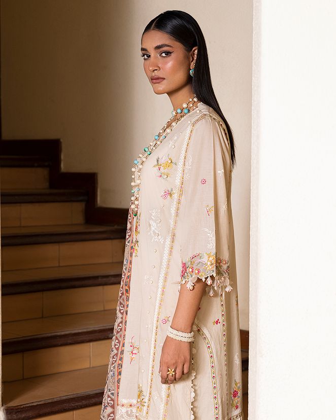 A picturesque blend of delicate tulle lace, blooming florals, and whimsical Jeffries motifs come together on an airy lawn canvas. The ensemble is completed with a beautifully woven digitally printed drape that adds a poetic aura, and matching pants crafted with precision to create a harmonious look.