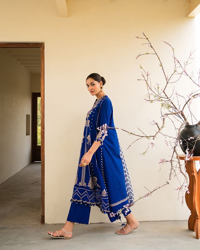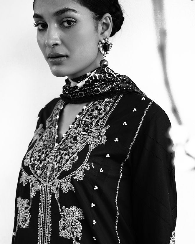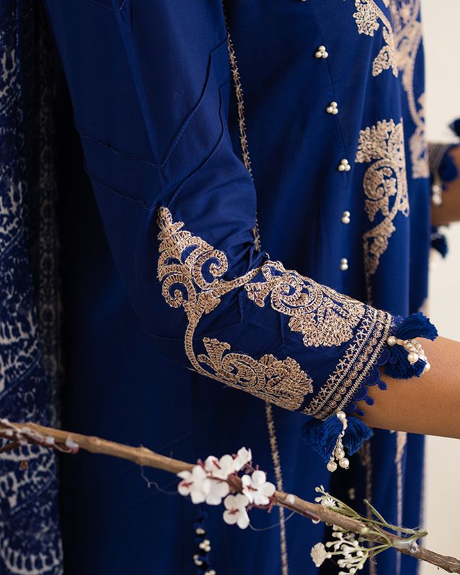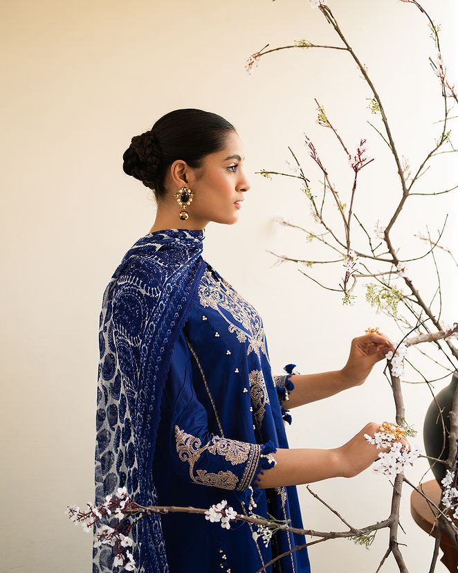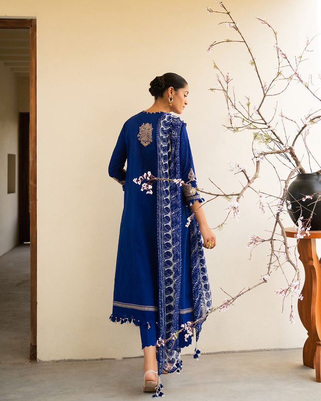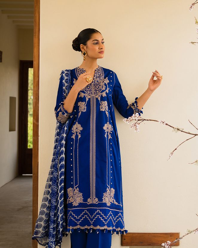 A lawn canvas embellished with mesmerizing Moroccan motifs, radiates an air of cultural magnificence. Complemented by cotton dyed pants and a chiffon dupatta adorned with intricate Indian boti exuding a harmonious blend of diverse art forms.