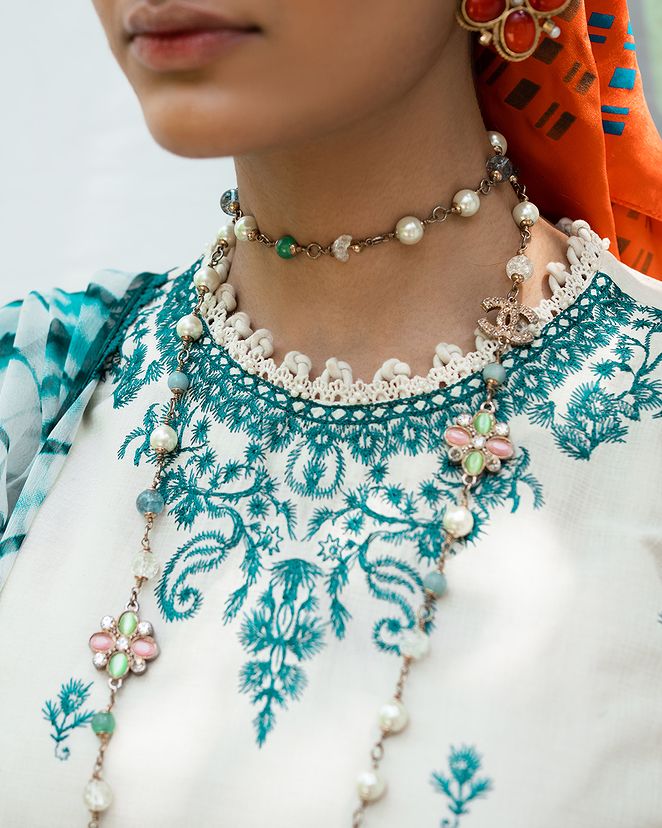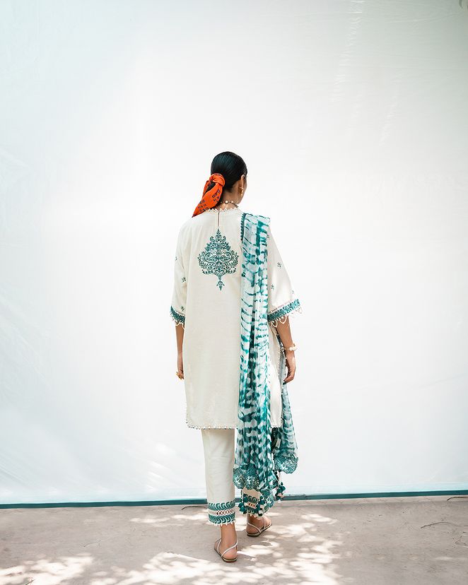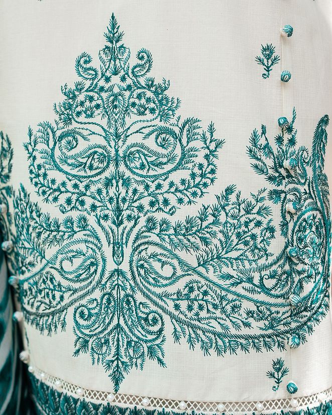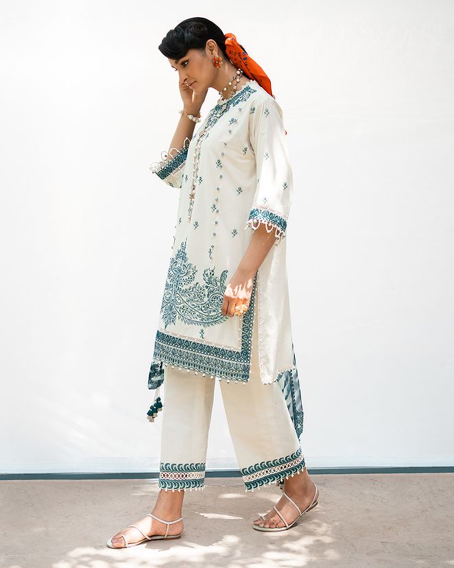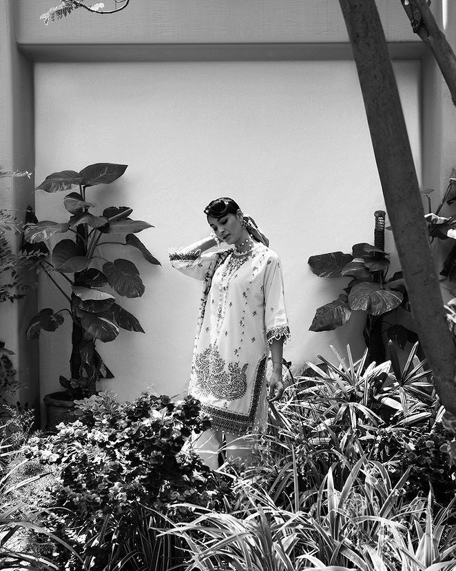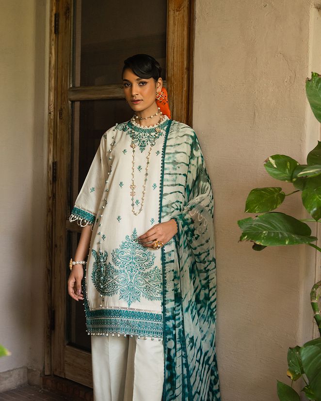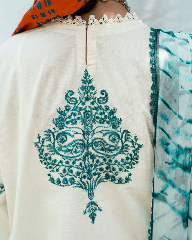 A mesmerizing blend of Egyptian floral embroidery and textured prints adorn this graceful lawn shirt. The matching cotton pants and silver chiffon dupatta with a striking shibori motif adds an empyrean touch where threads of modern elegance paints a canvas of timeless allure.