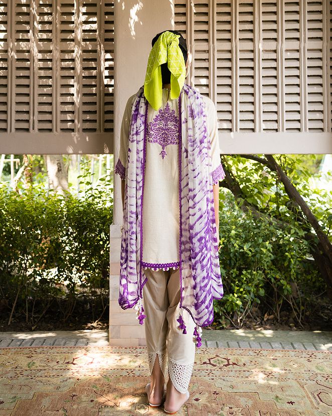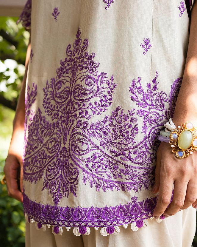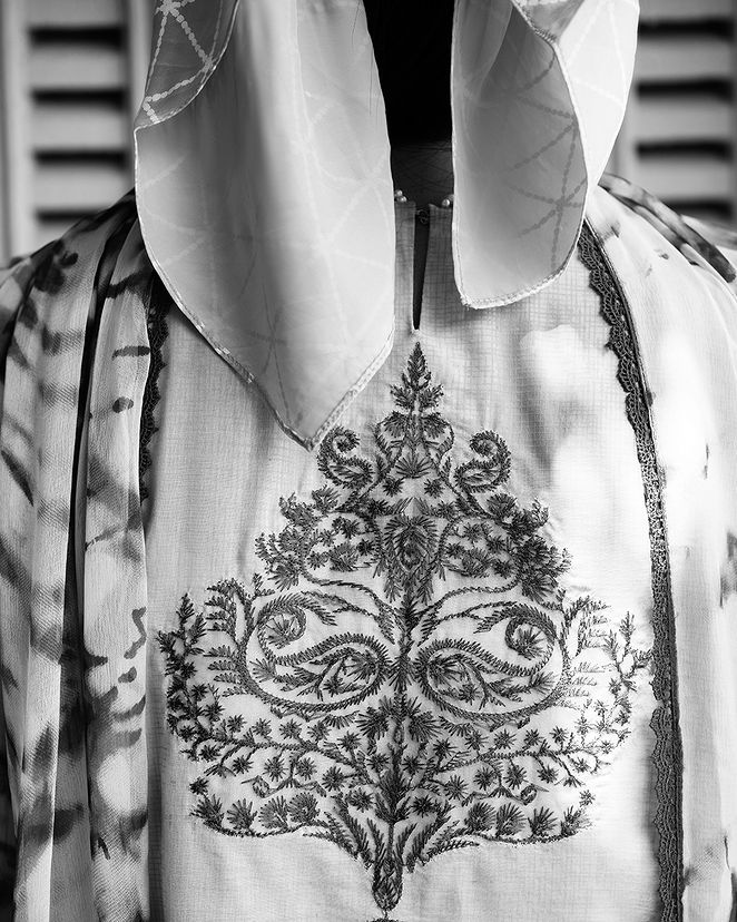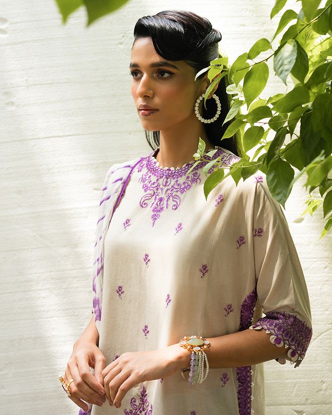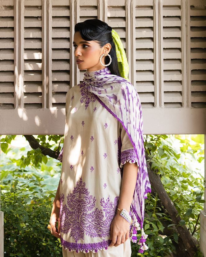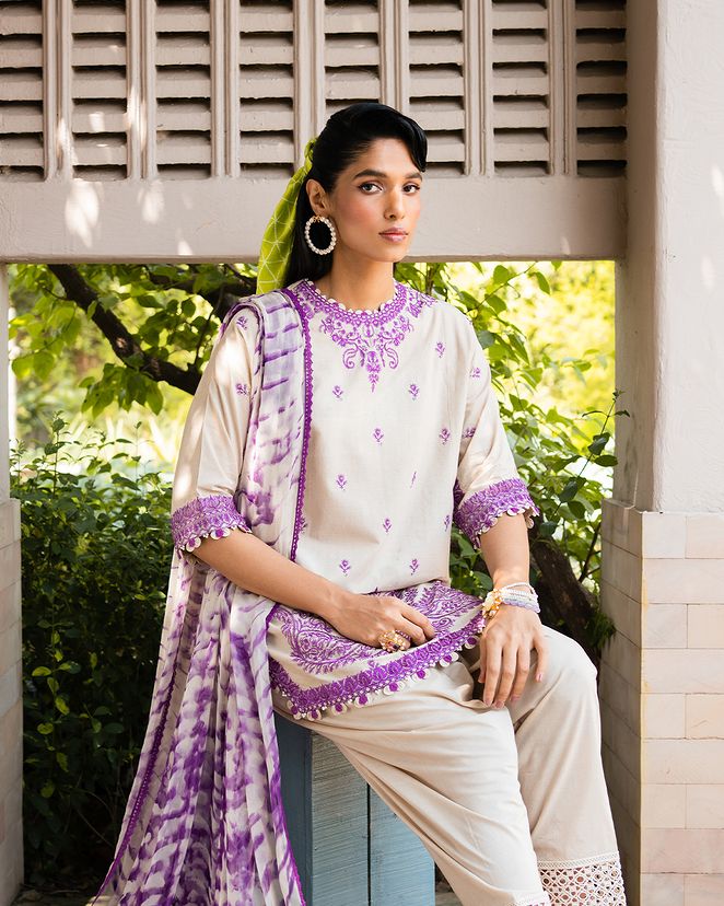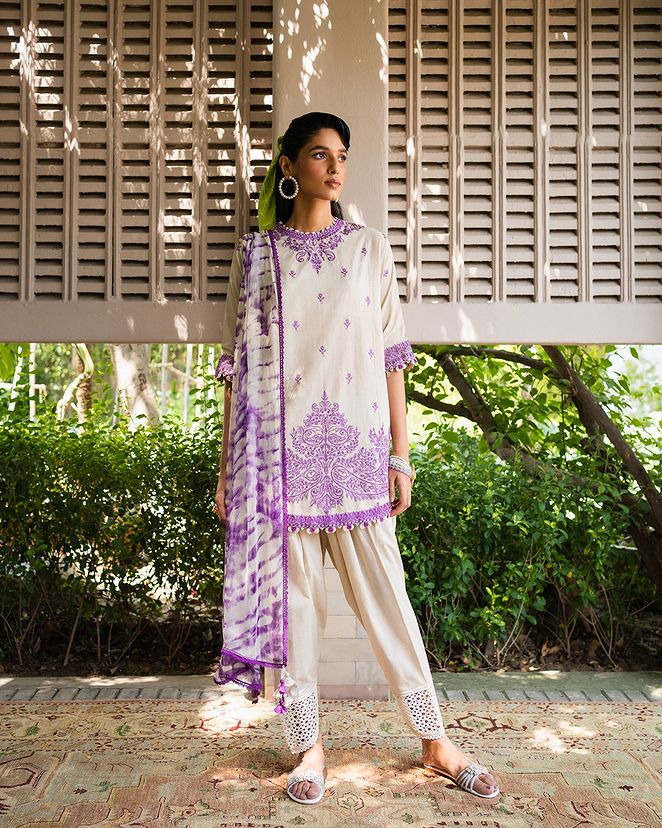 A mesmerizing blend of Egyptian floral embroidery and textured prints adorn this graceful lawn shirt. The matching cotton pants and silver chiffon dupatta with a striking shibori motif adds an empyrean touch where threads of modern elegance paints a canvas of timeless allure.
