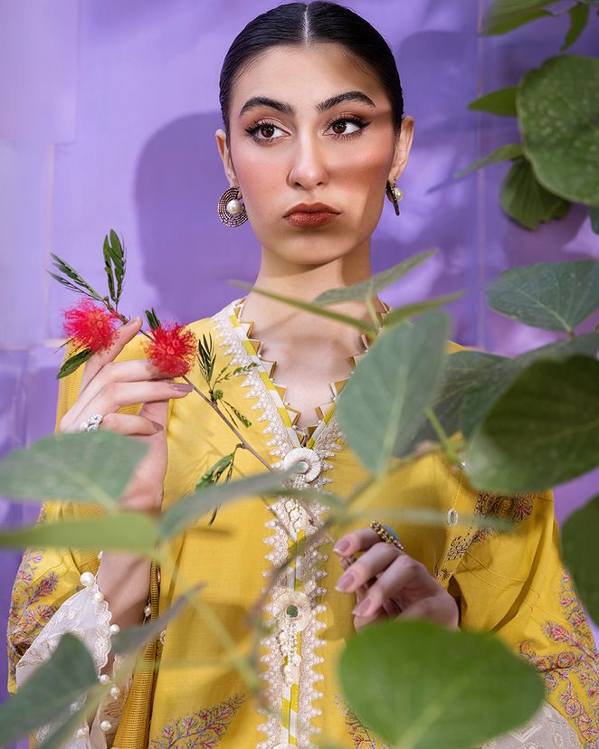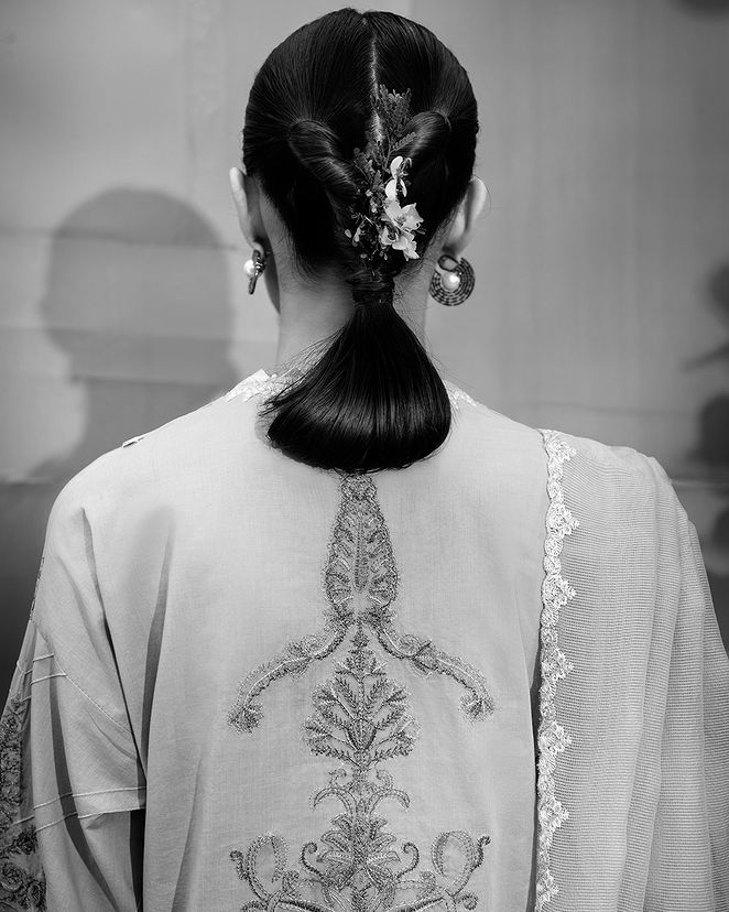 A tapestry of artistry woven into every stitch, this shirt exudes the elegance of Kashmiri shawls. With intricate embroidery inspired by the timeless beauty of the region, it is paired with cotton dyed pants and an exquisite woven net dupatta adorned with delicate floral and trellis motifs, creating a masterpiece of traditional and contemporary design.