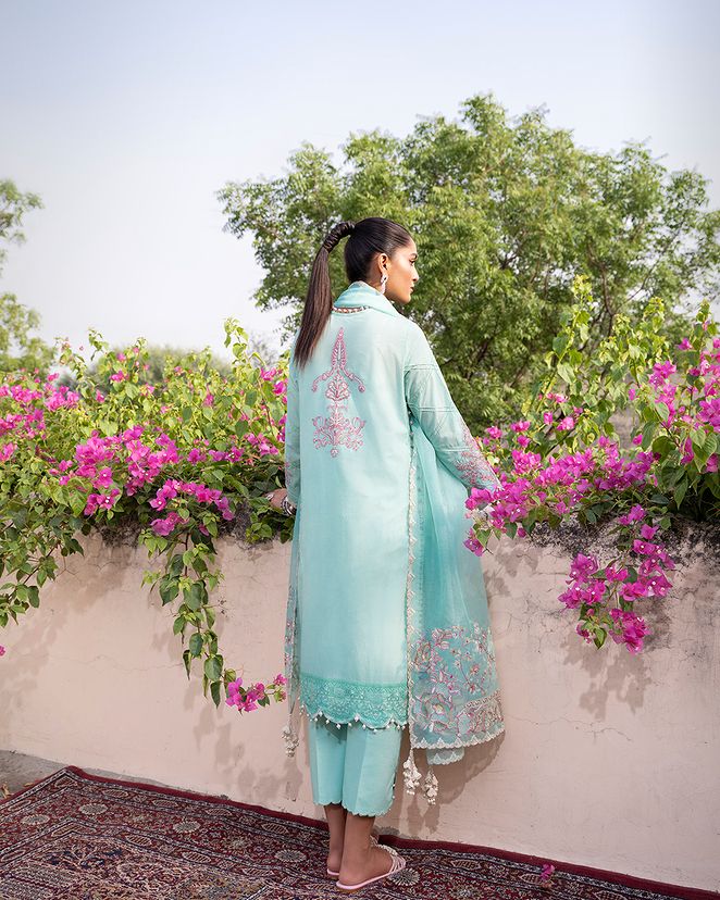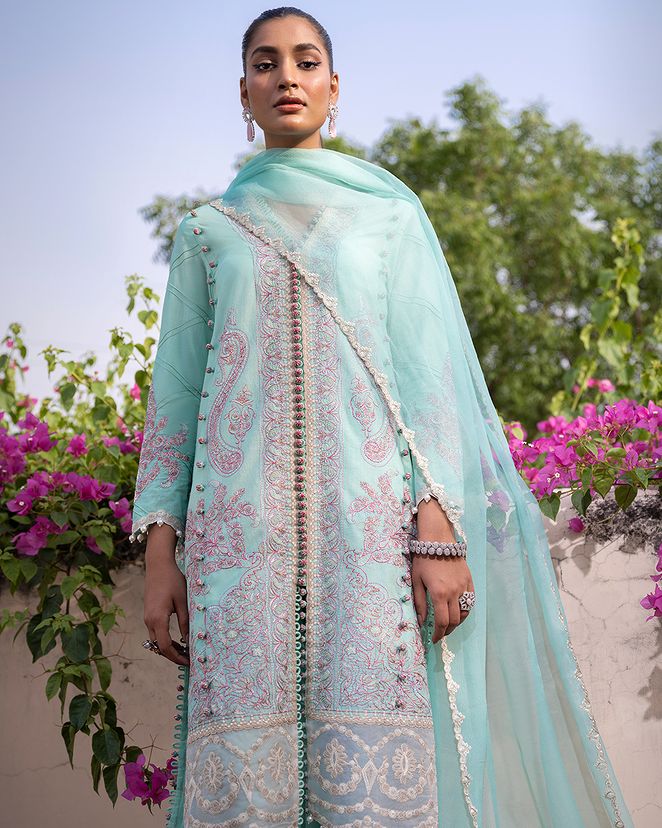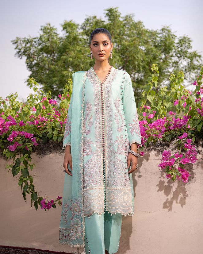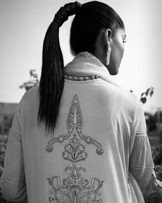 A tapestry of artistry woven into every stitch, this shirt exudes the elegance of Kashmiri shawls. With intricate embroidery inspired by the timeless beauty of the region, it is paired with cotton dyed pants and an exquisite woven net dupatta adorned with delicate floral and trellis motifs, creating a masterpiece of traditional and contemporary design.