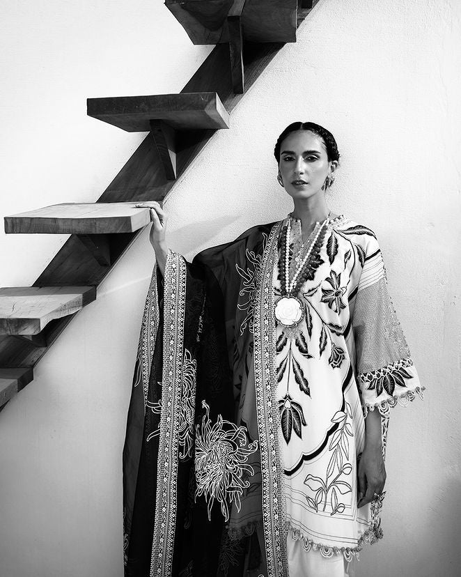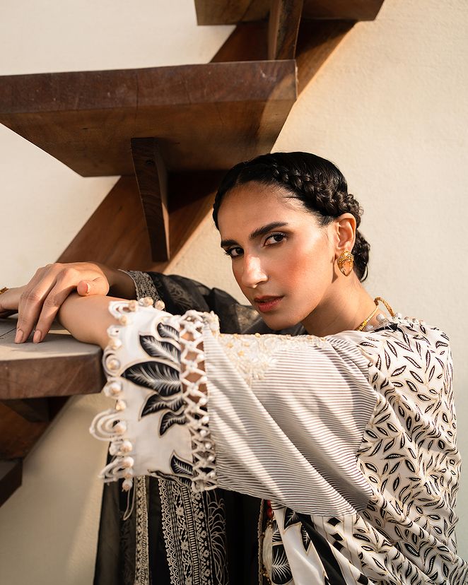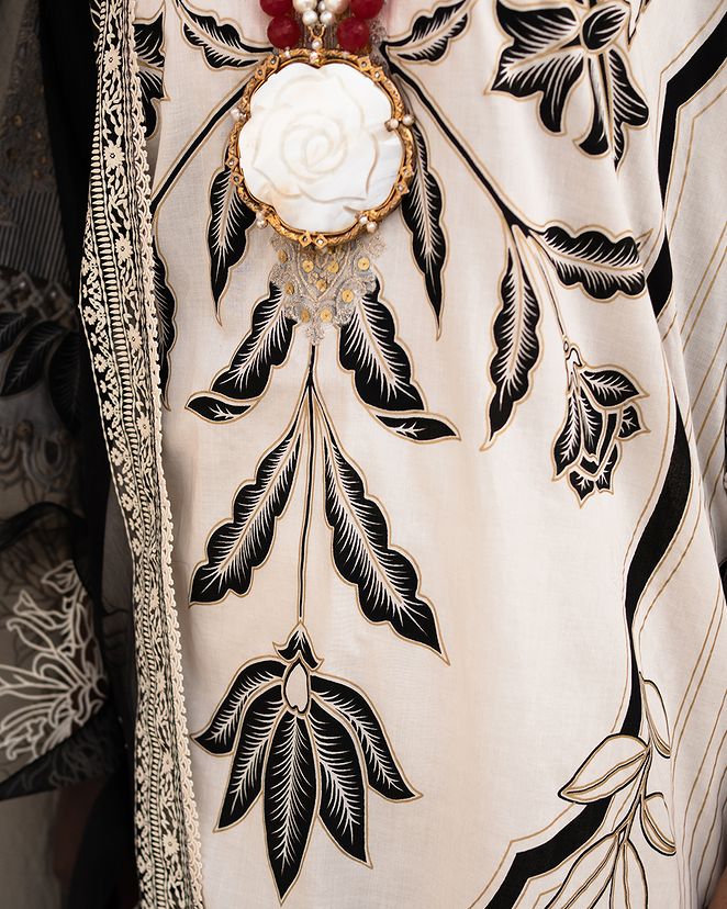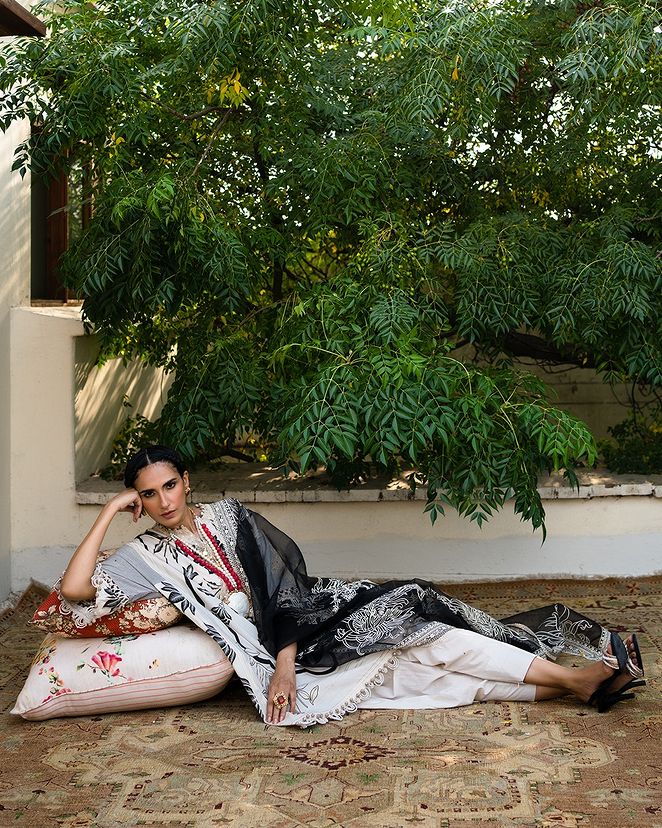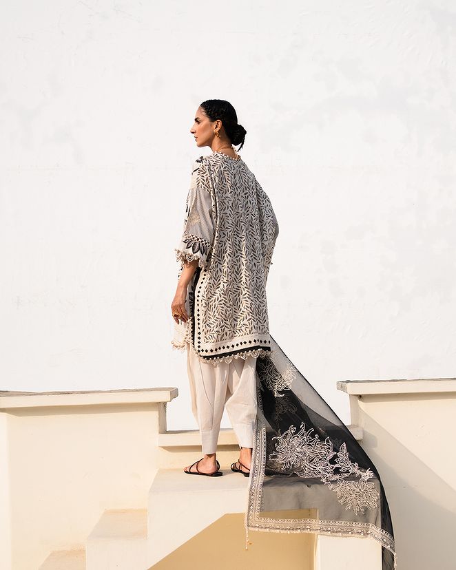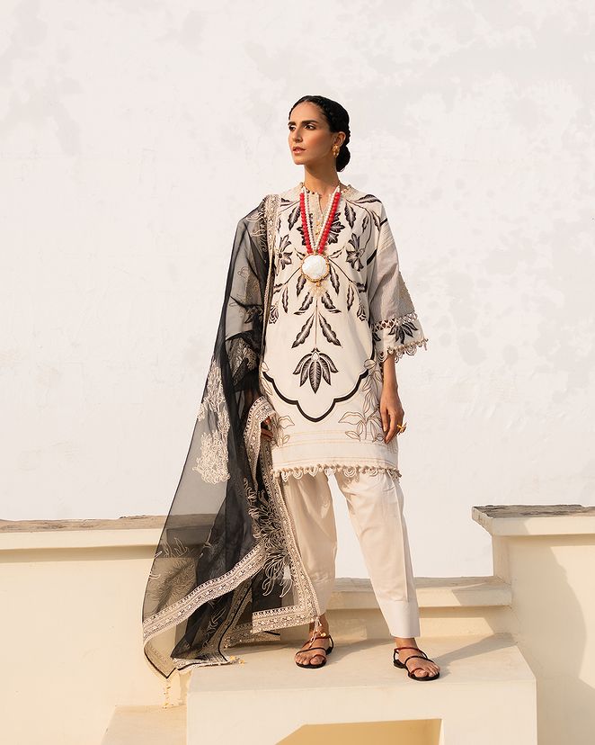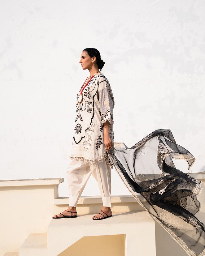Illuminating with a golden ray of sunshine, kissed with delicate hints of paste and adorned with majestic blooms, this silhouette pays homage to the grandeur of the Mughal era. Paired with cotton pants that exude an aura of simplicity, and a diaphanous organza dupatta that floats like a feather, beautifully transcending time and trends.