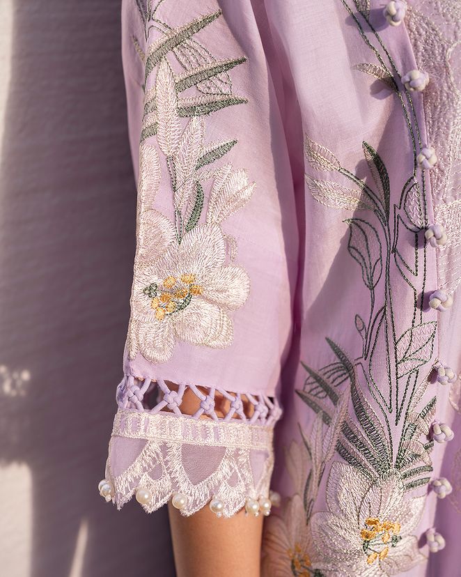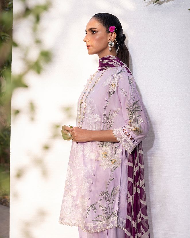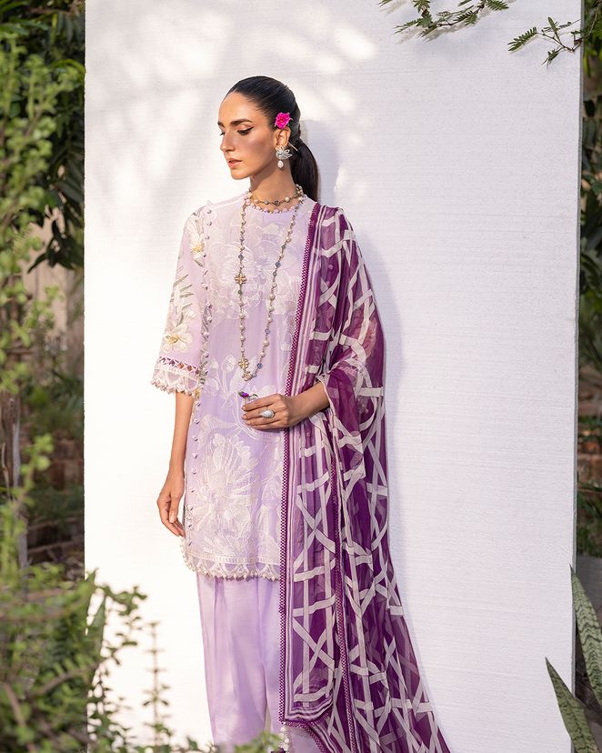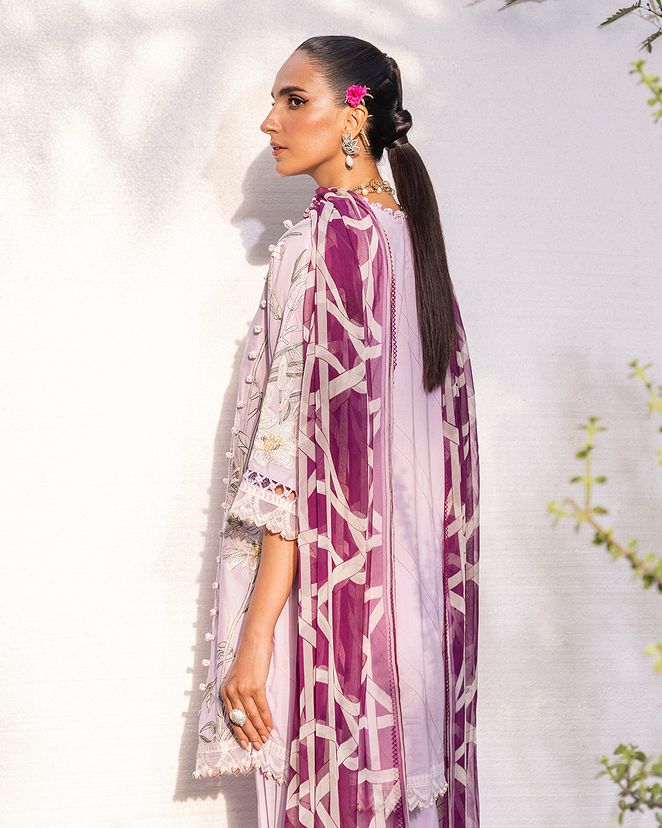 Amidst a garden of art and craft, this dyed lawn shirt blooms with a fusion of bold flowers and trellis, adorned with embroidery inspired by the elegance of French lace and the intricacy of 3D technique. Paired with cotton dyed pants, and a printed silver chiffon dupatta that boasts of geometric-inspired motifs, this ensemble is a masterpiece of artistic fusion.