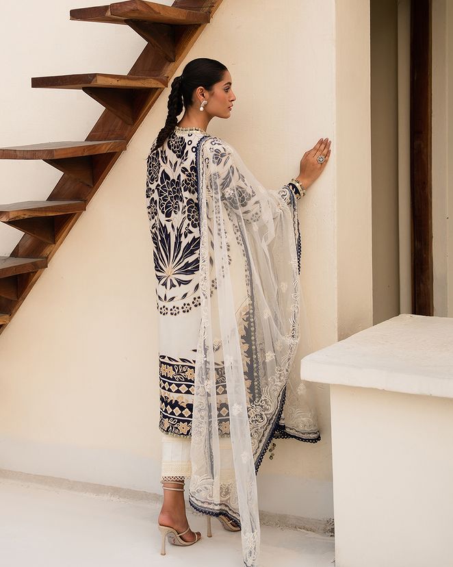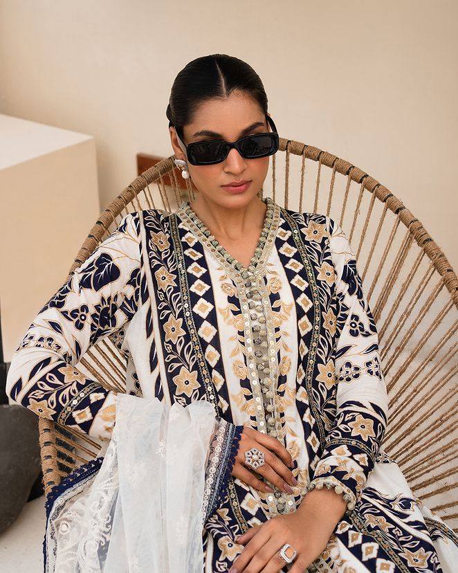 The bold block print, etched with the finesse of a master craftsman, exudes an aura of whimsical charm. Complemented with cotton pants that whisper of simplicity and comfort, and a net dupatta adorned with the grace of french lace.