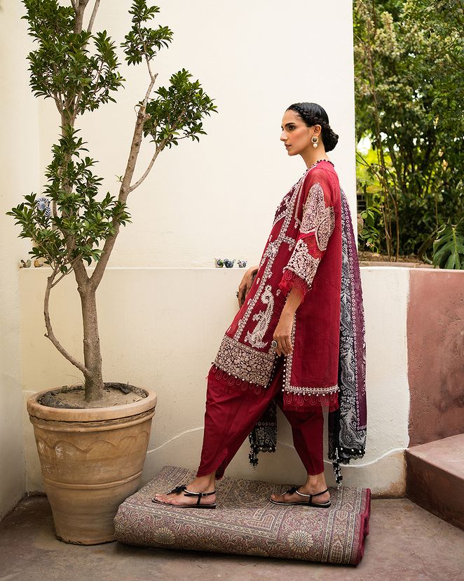 An opulent blend of cultures and craftsmanship, this woven net shirt boasts regal Mughal floral embroidery. Matched with dyed cotton pants and a digitally printed drape that draws inspiration from the serene beauty of Chinese paintings.