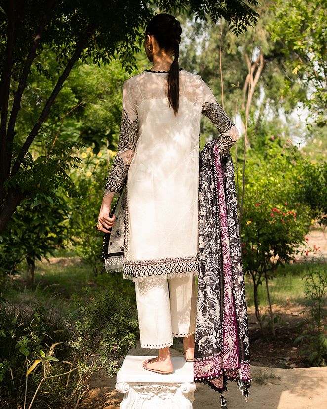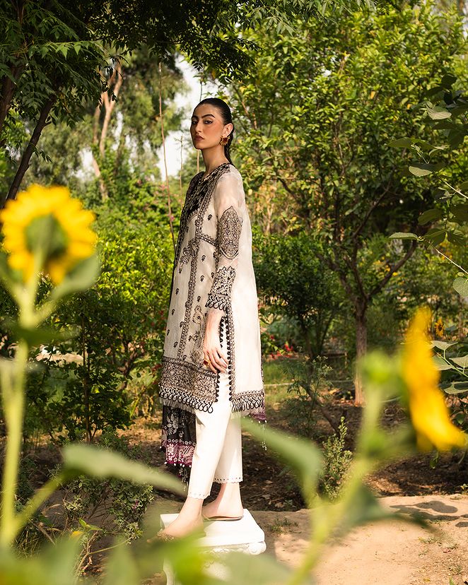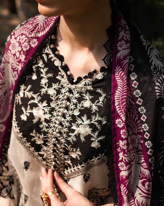 An opulent blend of cultures and craftsmanship, this woven net shirt boasts regal Mughal floral embroidery. Matched with dyed cotton pants and a digitally printed dupatta that draws inspiration from the serene beauty of Chinese paintings.