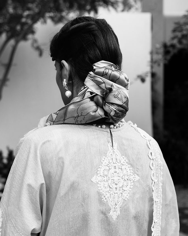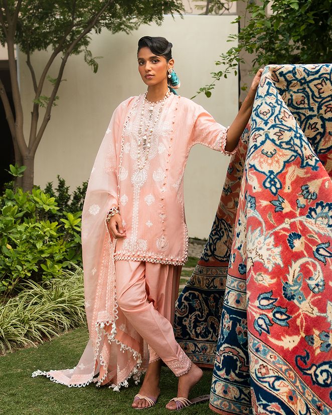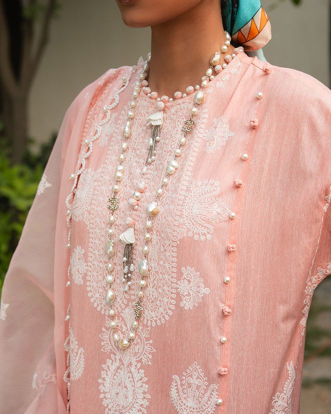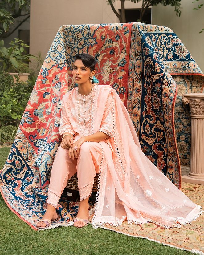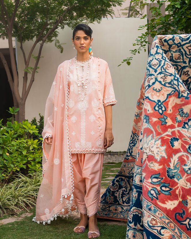 Nature's beauty unfolds in this embroidered chambray, where delicate motifs celebrate the earth's artistry. Paired with cotton pants and a woven net dupatta, the ensemble displays the charm of a blooming landscape.