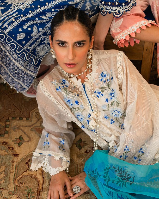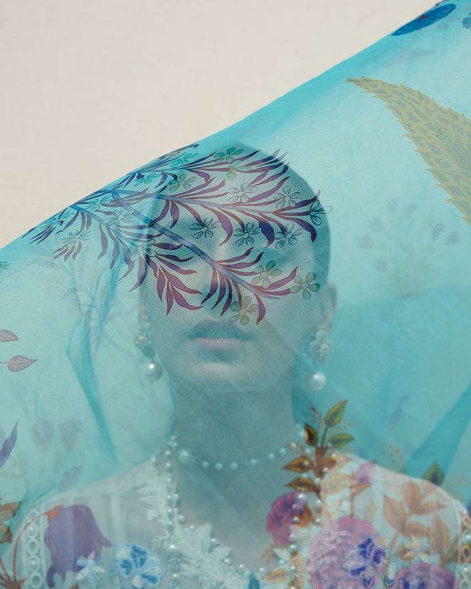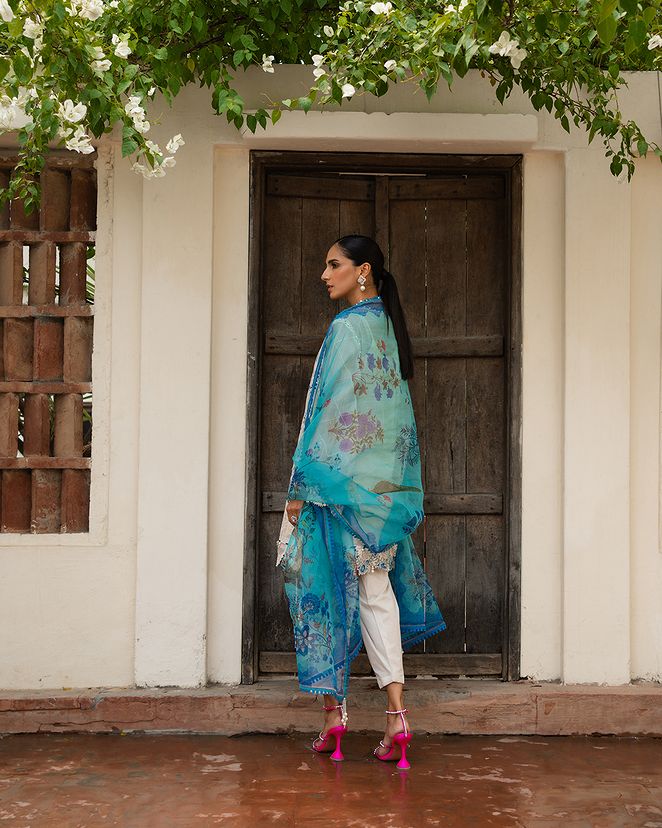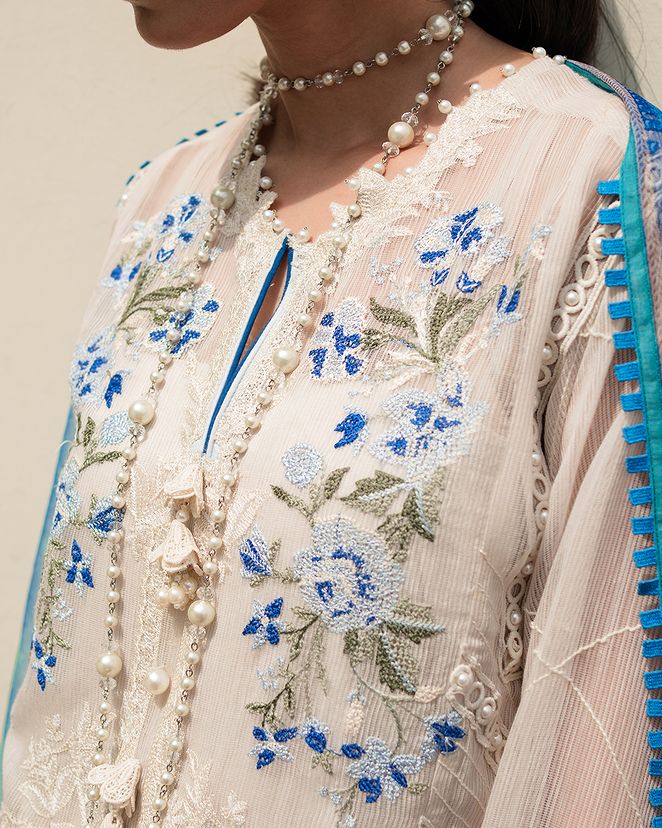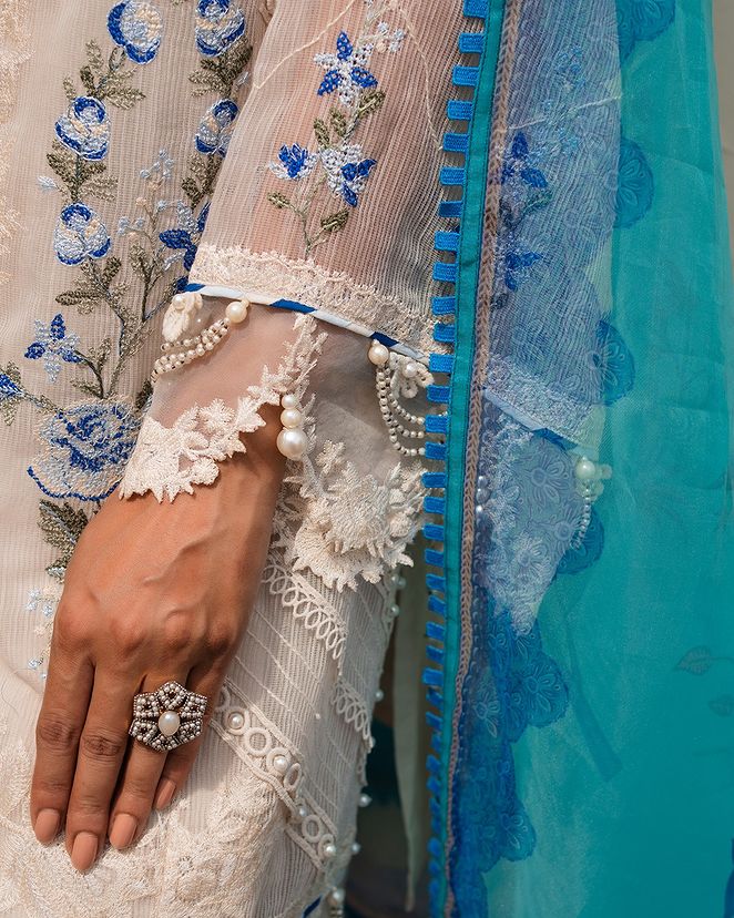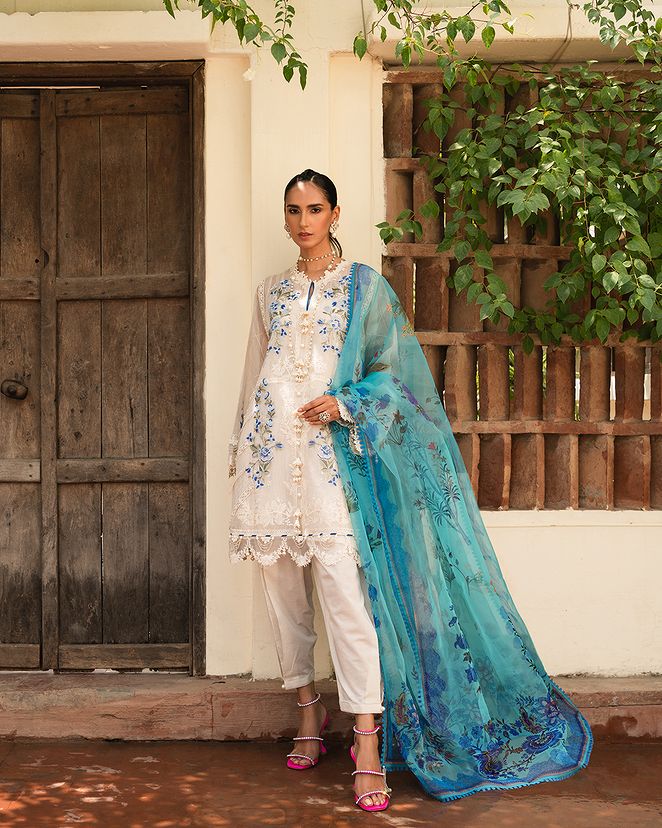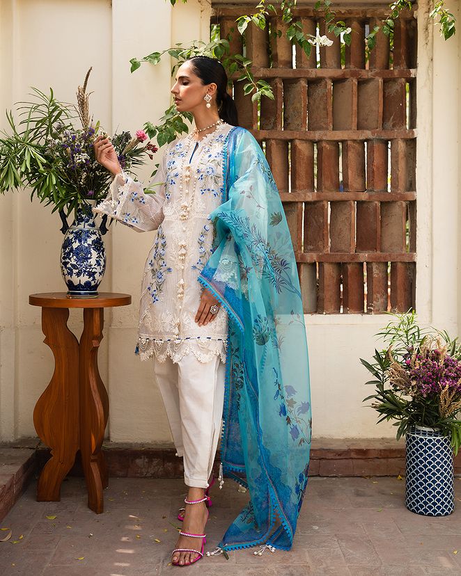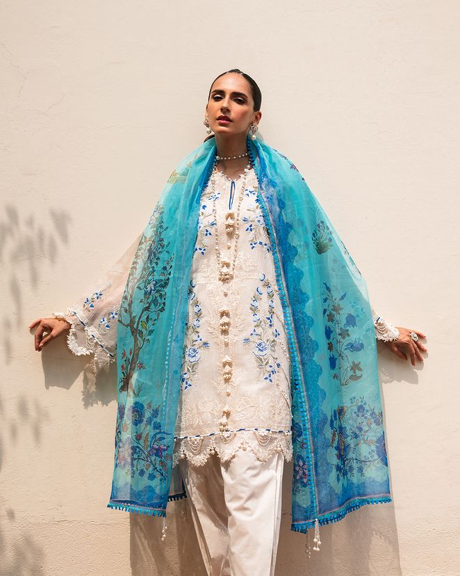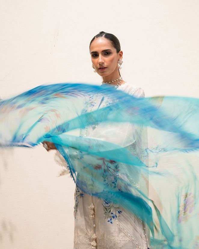 A dreamy woven net shirt, adorned with delicate embroidery of cross-stitched flowers and lace, dances gracefully with a flowy organza dupatta. Paired effortlessly with cotton dyed pants, a canvas of pure elegance is painted