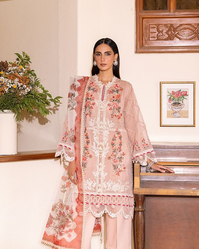 A dreamy woven net shirt, adorned with delicate embroidery of cross-stitched flowers and lace, dances gracefully with a flowy organza dupatta. Paired effortlessly with cotton dyed pants, a canvas of pure elegance is painted.
