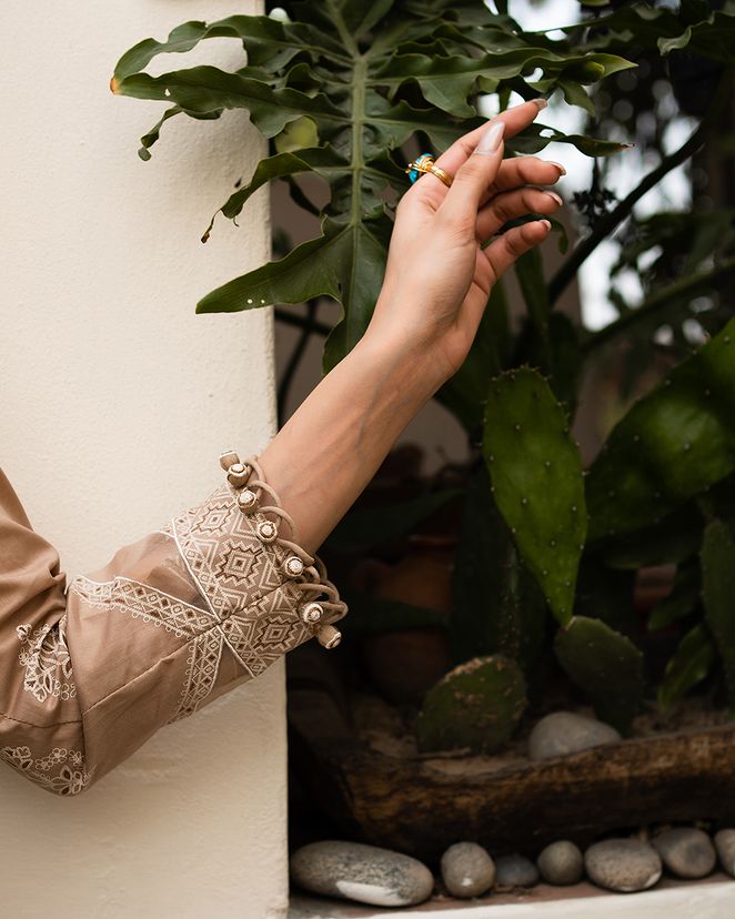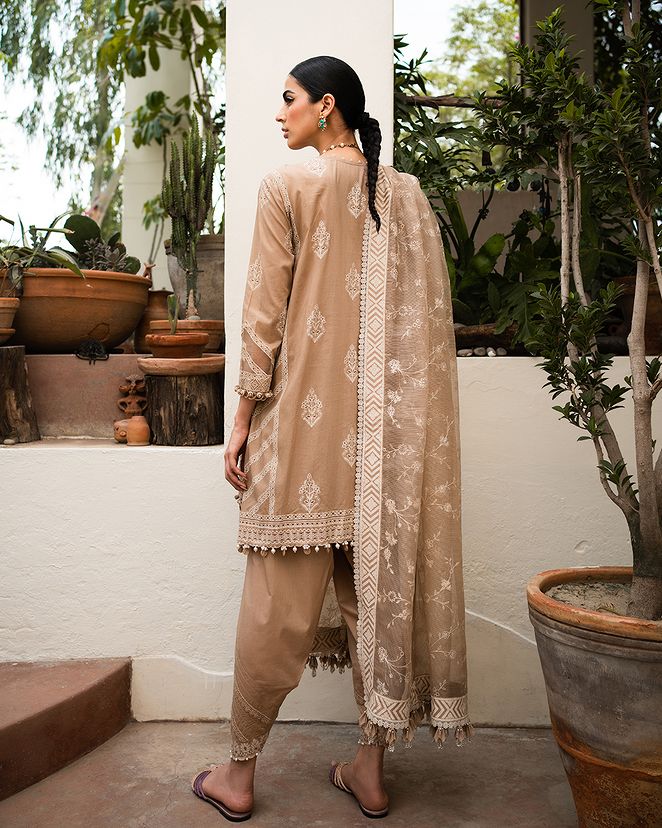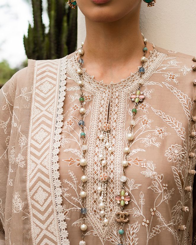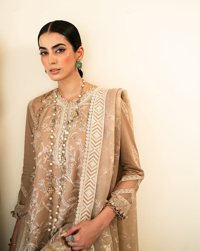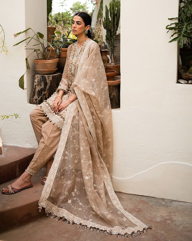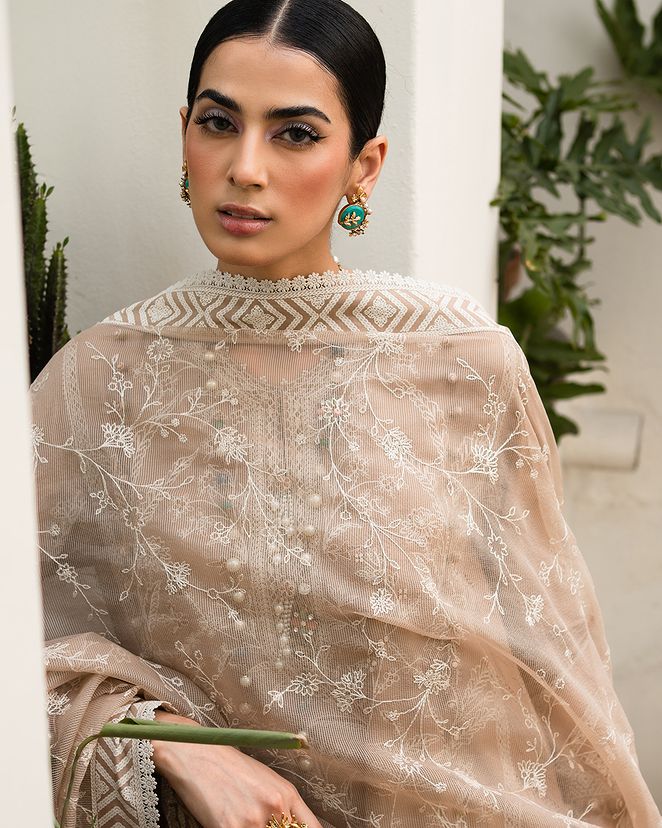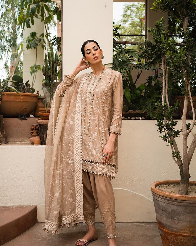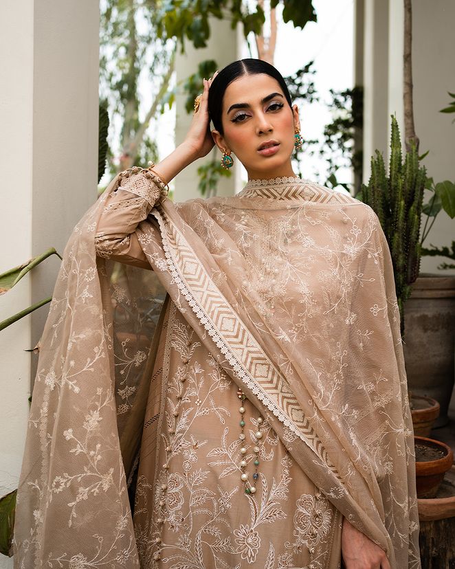 A canvas of European florals come to life on this dyed lawn shirt, elegantly paired with cotton dyed pants and a woven net dupatta, creating a mesmerizing ode to nature's beauty.