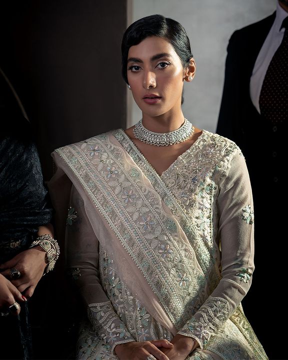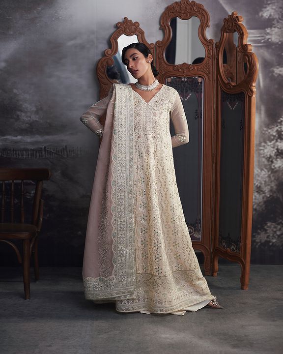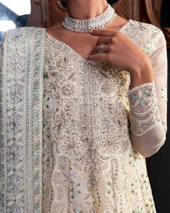 Aaila, a captivating and refined white outfit, is a true testament to the allure of understated elegance. This enchanting ensemble features an embroidered sequin and hand-embellished neckline on delicate organza net, making it a masterpiece of exquisite craftsmanship and meticulous design. The focal point of this extraordinary attire is the intricately adorned neckline. Each sequin and embellishment have been meticulously placed, creating a mesmerizing display of artistry and skill.