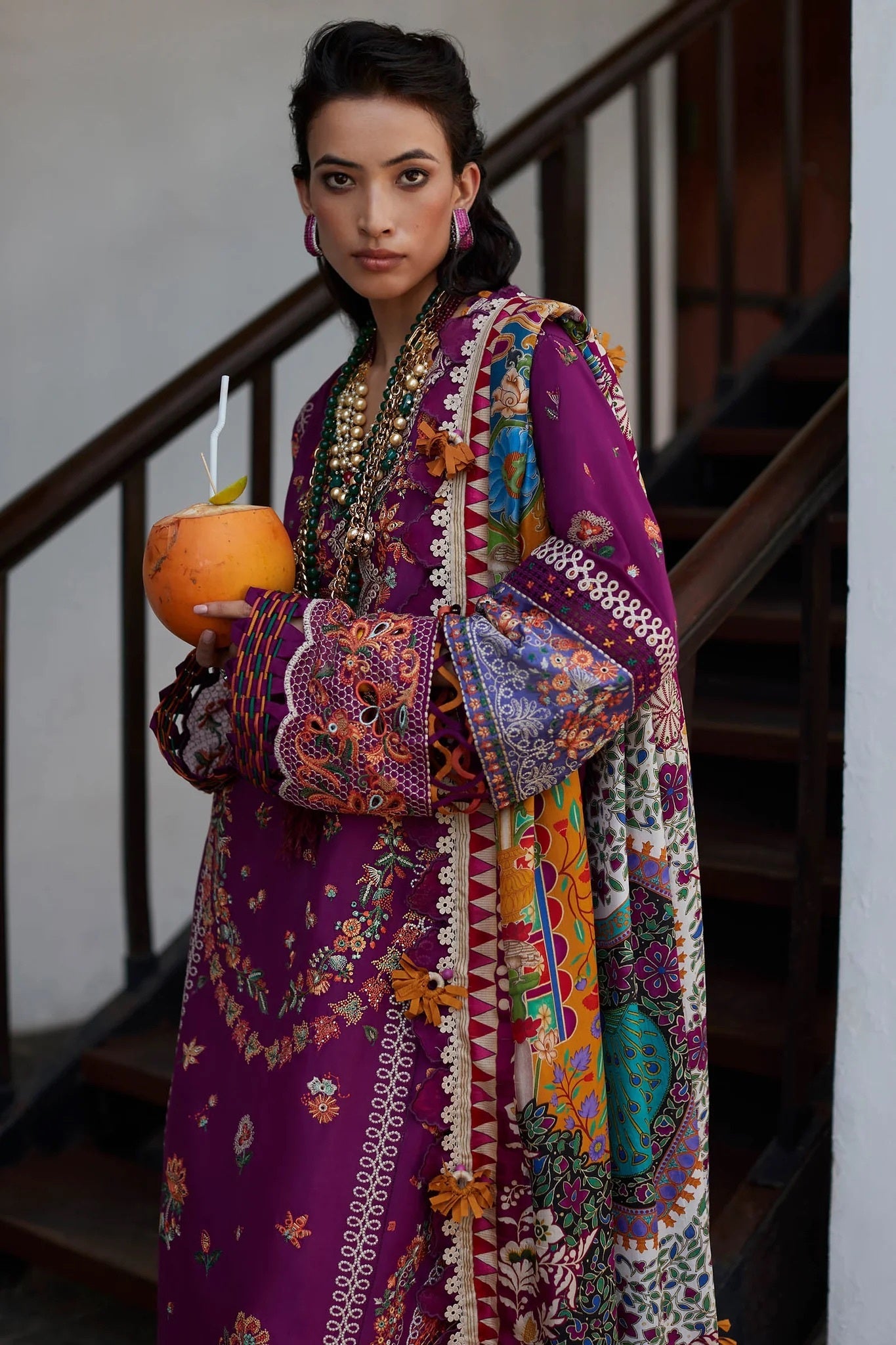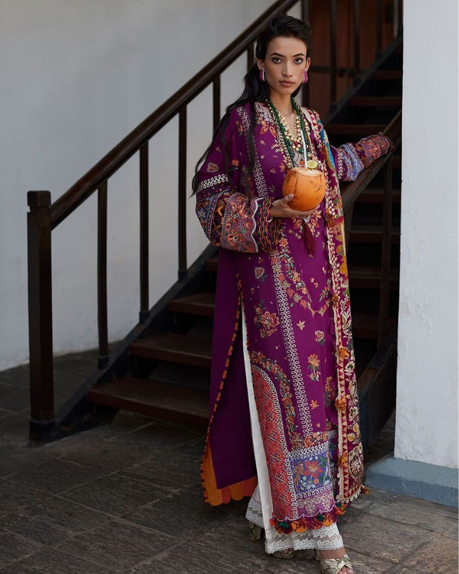 Delicate florals bloom on the deep Mulberry canvas of ‘Aalia’. The shirt features a centre panel adorned with floral tussie-mussie framed with a swirling festoon of bright florals. The shirt is further accentuated with contrasting lilac border layered with flora and fauna and a schiffli border on the slit to lend contrast to the layout. Paired with a sumptuous pure medium silk dupatta, this striking design creates for an ethereally feminine ensemble thats forever wearable.