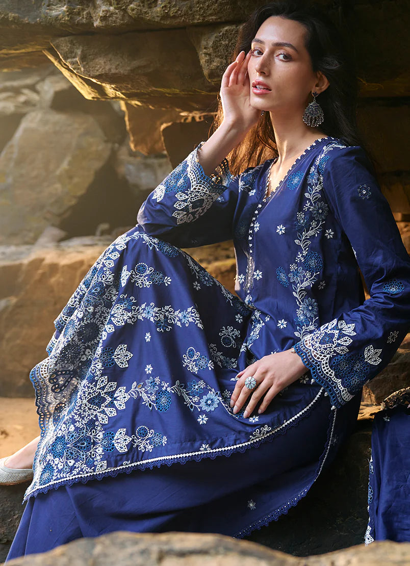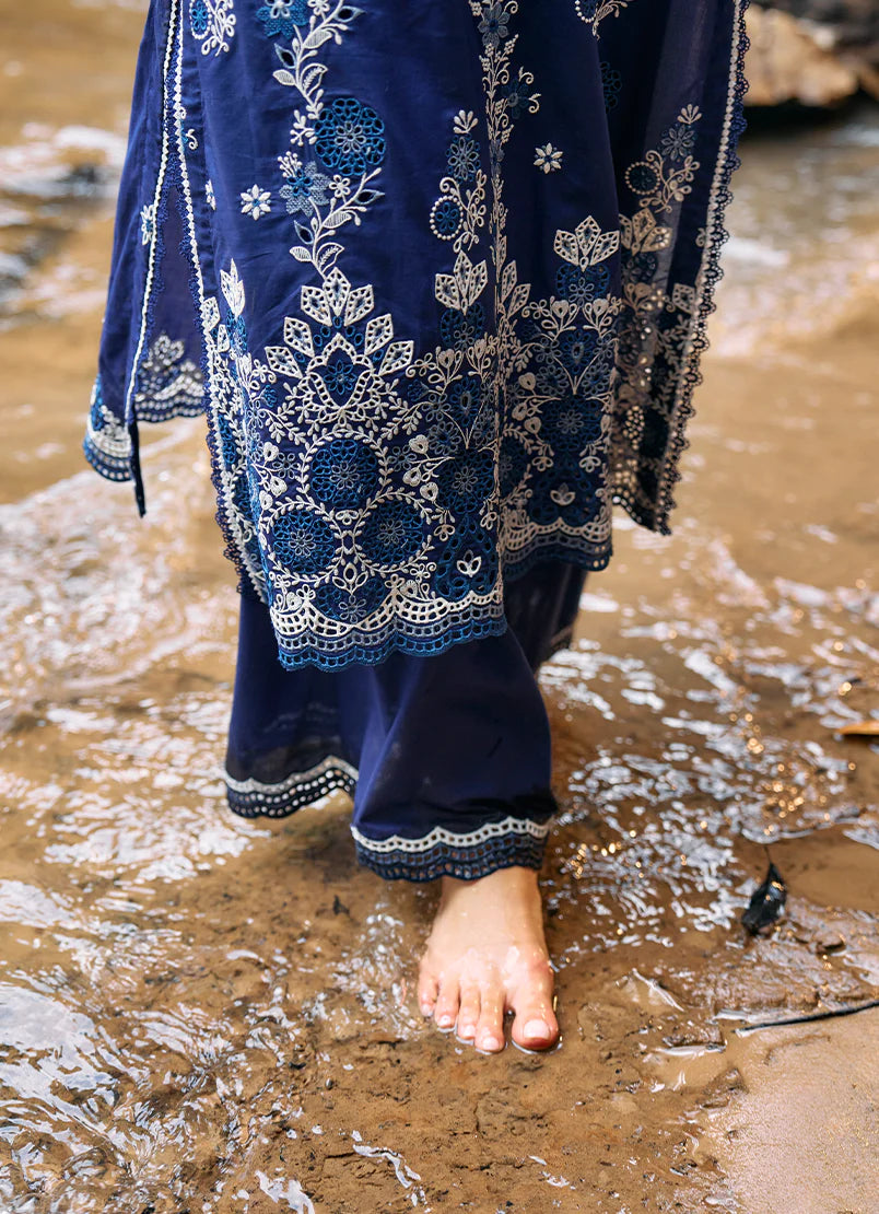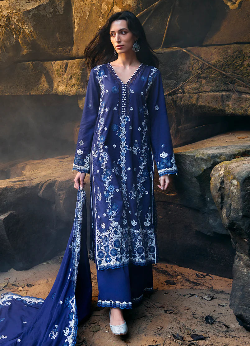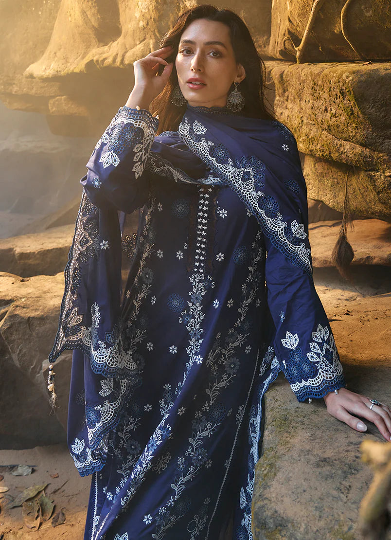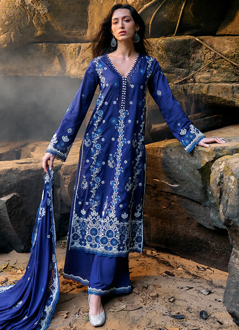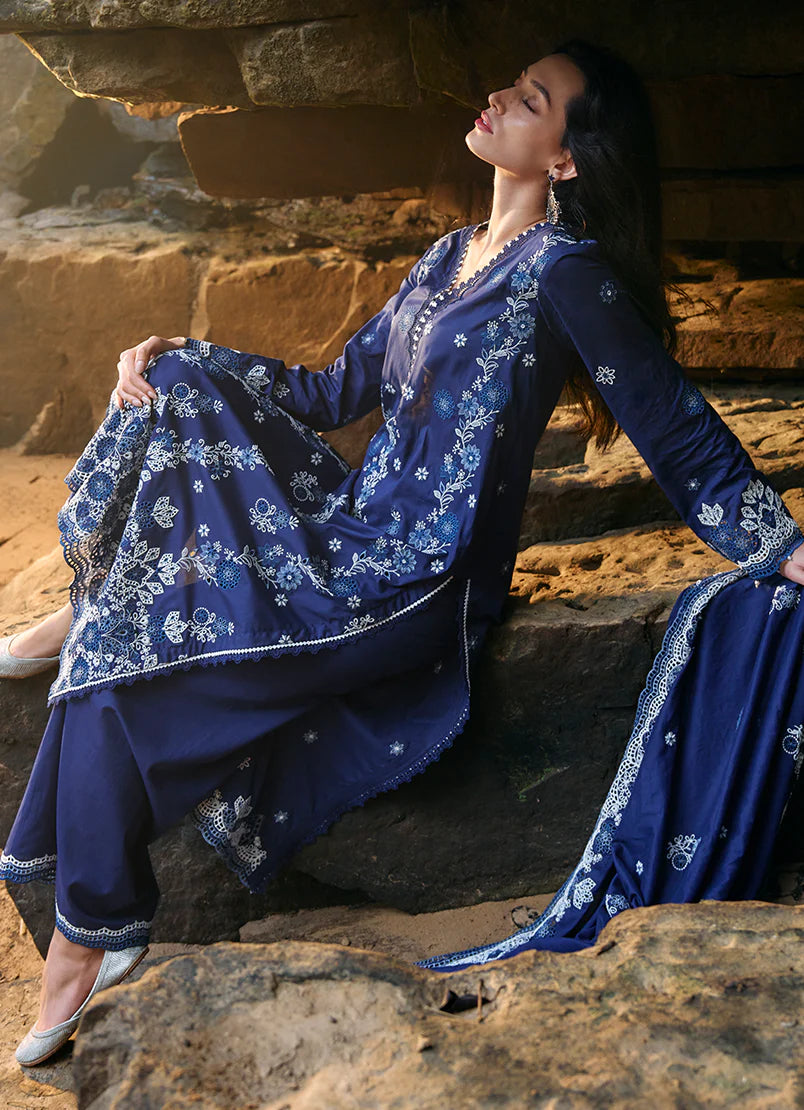 Abiha, stunningly intricate embroidery on midnight blue base fabric on shirt, trousers and dupatta.