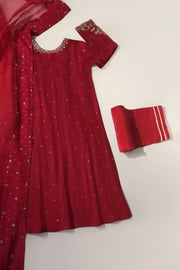 A heavily embellished beautiful three piece for your festive events, adorned with the most stunning hand/ada work of dabka, naqshi, sequins and crystals done by our skilled artisans. Paired with a matching pure embellished organza dupatta and straight pencil pure raw silk trousers. The length of the long Kameez is is 48 inches.