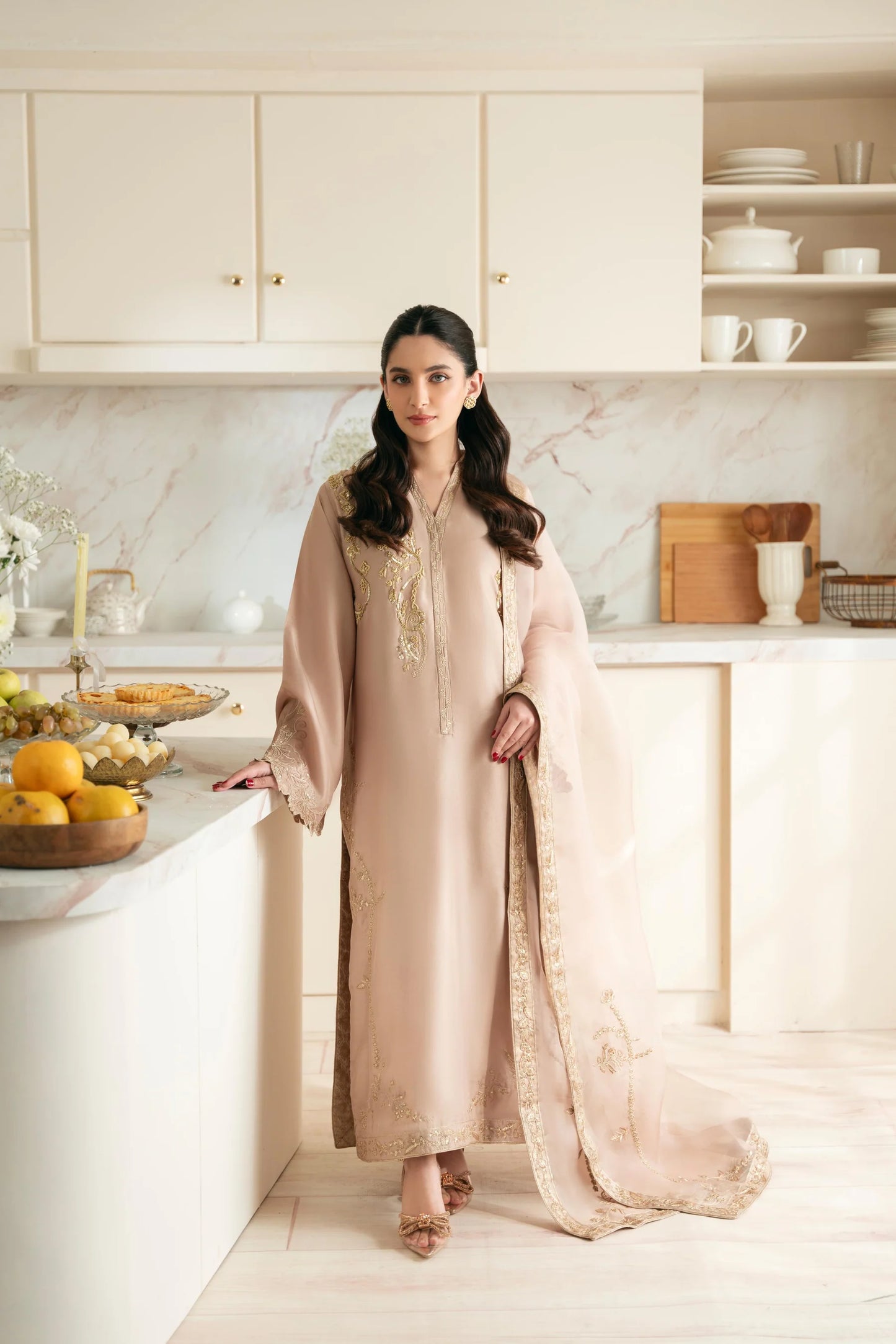 An embellished beautiful three piece on pure coffee beige raw silk 60 gms, the neckline is adorned with hand/Ada work motifs, alongside intricate zari and sequins. Paired with an organza dupatta and pure raw silk izaar as seen with embellished borders.