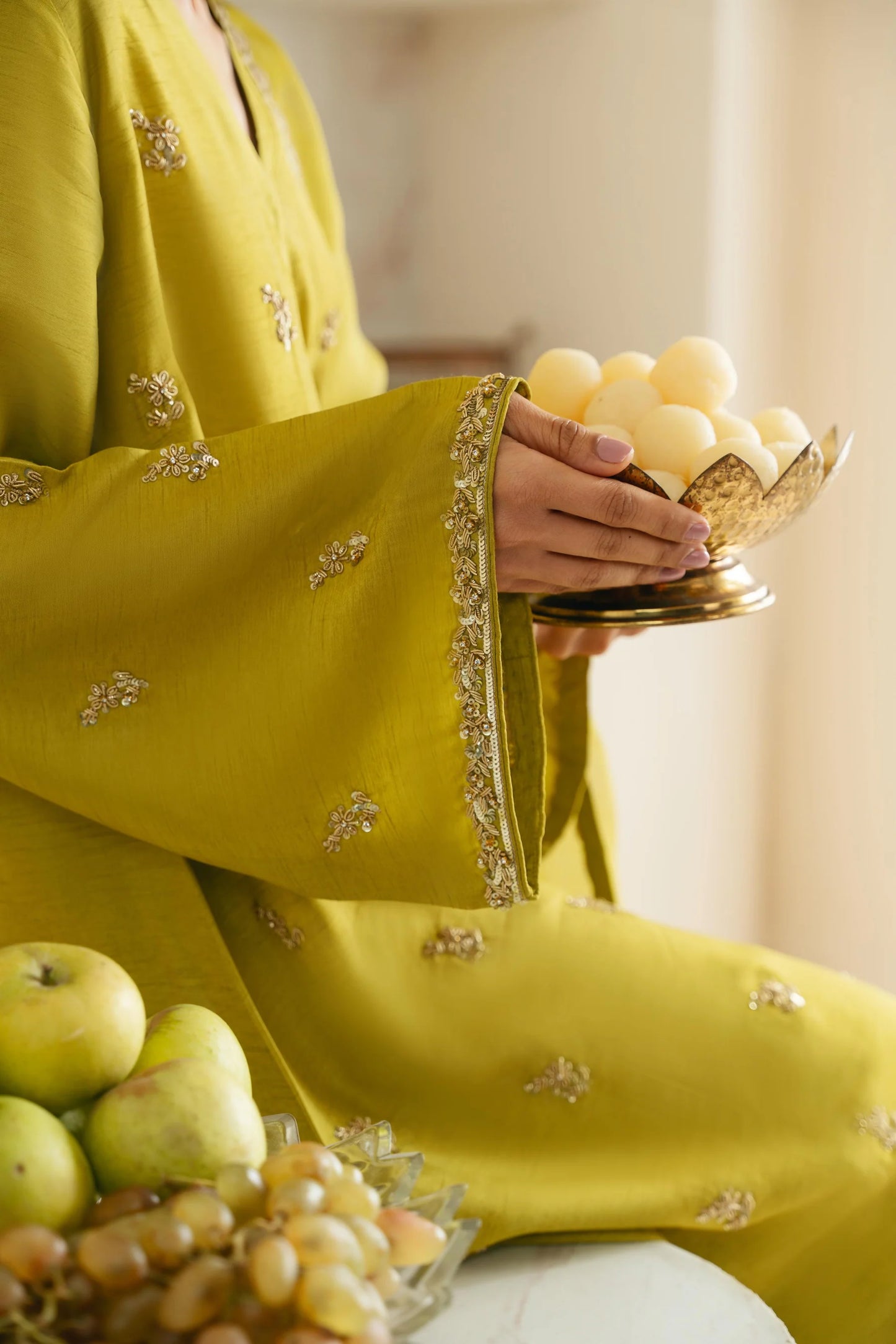 Stand out this celebratory season in Agha Noor’s beautiful hand crafted collection. Curated on dhani green Korean silk, featuring intricate hand/Ada work on a long panelled silhouette as seen, Paired with straight izaar and embellished dupatta as seen for everlasting elegance. An alluring three pieces that is a must have this festive season.