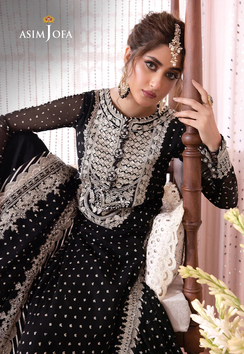 Discover the secrets of the “Chandni Collection”, as Sajal Aly showcases the sleek straight shirt and heavily embroidered lehenga outfit. This design is embellished with silver zari and cupped sequins, creating a poetic simile of a starlit noir sky. The neckline is embroidered with intricate detail, giving it a traditional touch. The lehenga has gorgeous borders running along hem paying homage to our cultural heritage. It features a lushly endowed dupatta framed by embroidered borders which enhances this royal look.
