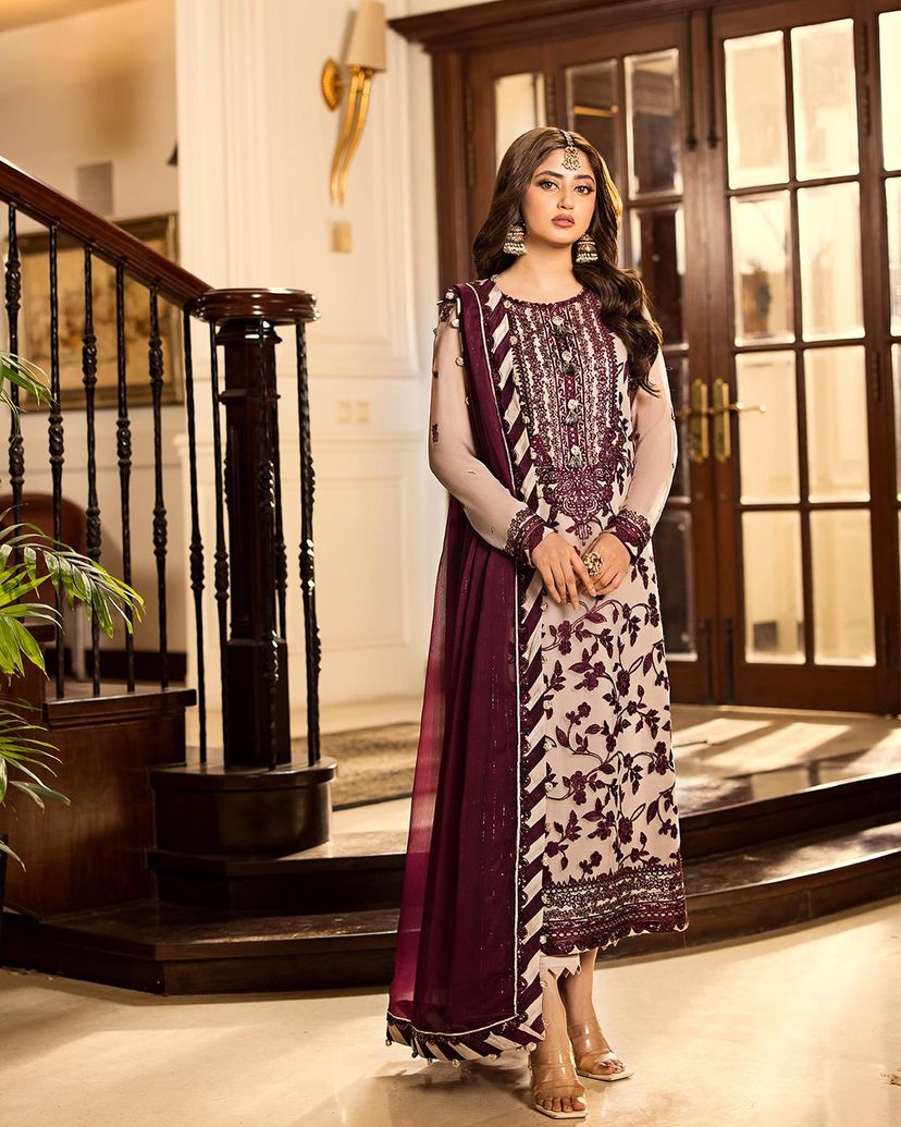 Bring out your most classy and serene self with this charming light buff attire from the ‘Jhilmil Collection’, designed in the most stellar way with a graceful touch of maroon floral aari embroidery together with an enchanting dupatta. This ornate pattern calls attention to the contrast between fragility and opulence. Experience the blissful aura of this piece with Asim Jofa!