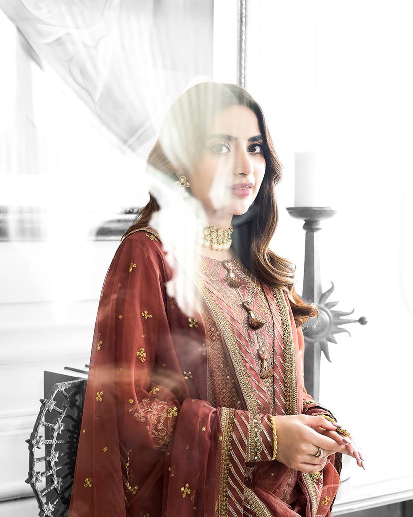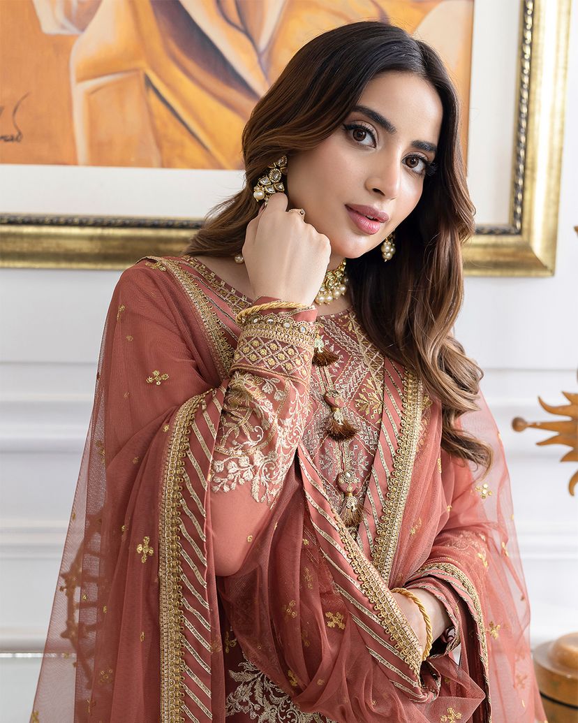 Get ready to embrace the season of festivities in style with this refreshing ensemble from the 'Jhilmil Collection' by Asim Jofa! Radiating elegance and charm, this Tea Pink outfit is designed to elevate your wardrobe and make you shine brighter than ever. Adorned with exquisite zari-work throughout with an elegant border, every detail of this ensemble is crafted to perfection. Complete with a matching dupatta. Carry this beauty with the same grace as Saboor Aly and get ready to steal the show.
