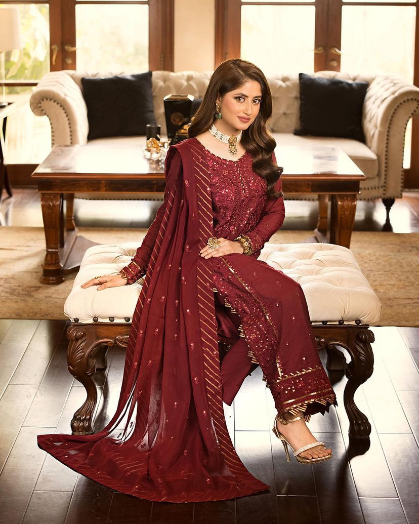 Delve into the breathtaking beauty of the maroon ensemble and leave everyone awestruck. This mesmerizing piece features exquisite threadwork and 7mm sequins embroidery on the neckline and borders, extending to the graceful dupatta, creating a captivating look. Sajal Aly effortlessly exudes charm and grace, bringing this design to life like a fairy tale come true. Be the epitome of elegance and the center of attention in this maroon outfit from the enchanting 'Jhilmil Collection' by Asim Jofa!