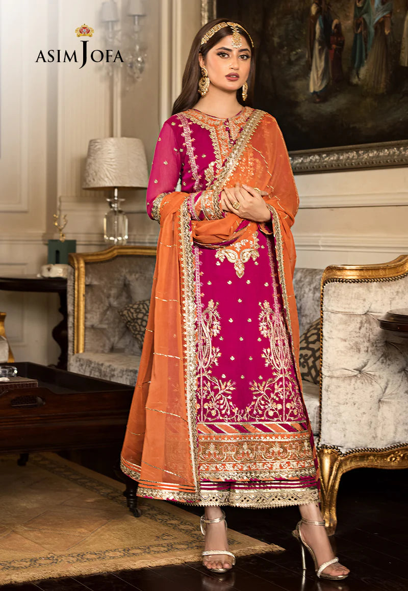 Be mesmerized by the vibrant fuchsia ensemble from the ‘Jhilmil Collection’ by Asim Jofa! Brighten your wardrobe with meticulous zari work that creates a pattern of elegance, and a graceful border that reflects timeless beauty, it comes with a tangerine dupatta that adds a dash of lively charm. Channel the enchanting spirit of Sajal Aly and dazzle everyone, creating a lasting impression of awe and admiration.