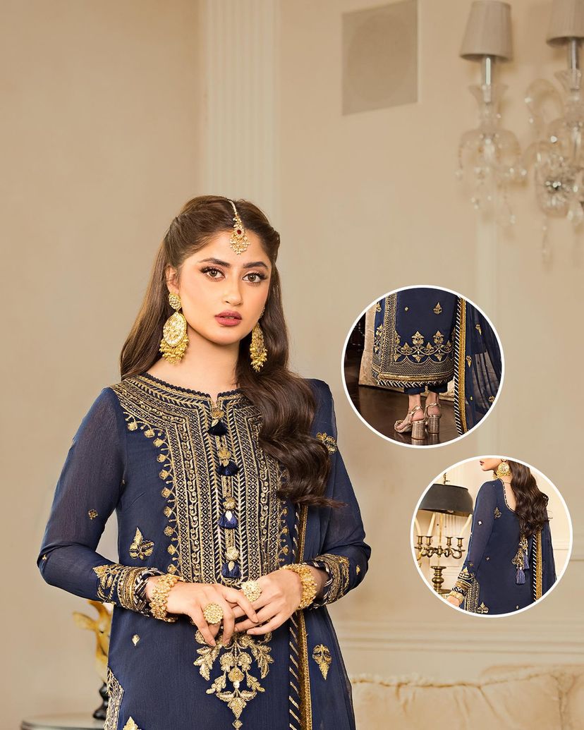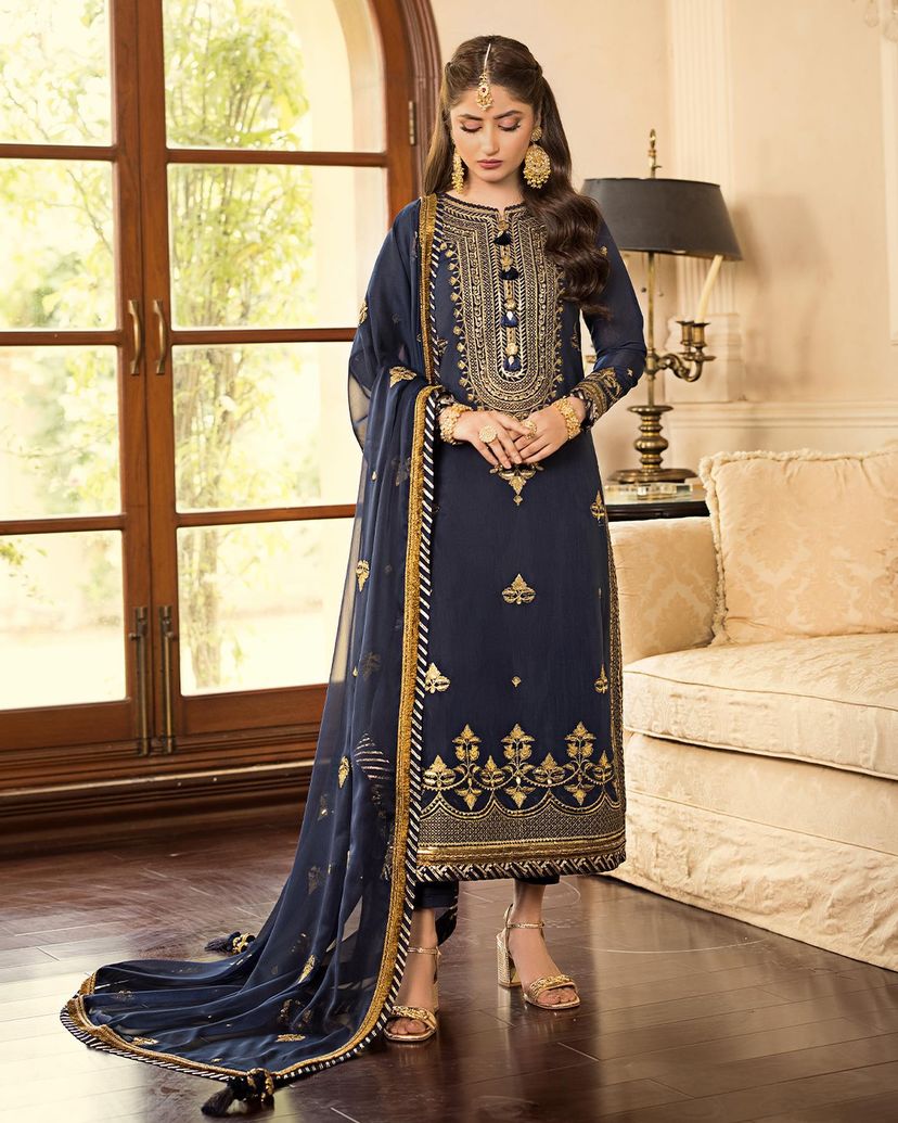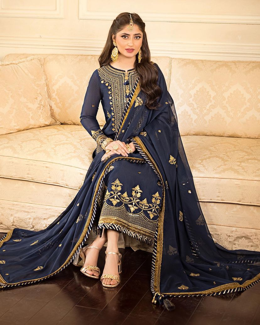 Embody the enchanting allure of Sajal Aly with this navy-blue-hued outfit adorned with exquisite embroidery from the 'Jhilmil Collection.' Inspired by Sajal's grace and elegance, the deep navy-blue color exudes sophistication and poise, while the intricate gold zari embroidery adds a touch of opulence and grandeur. Every stitch reflects meticulous craftsmanship and attention to detail, creating a regal ensemble that effortlessly captures attention. With its classic silhouette and shimmering embellishments, this outfit is a true testament to Sajal's timeless beauty.