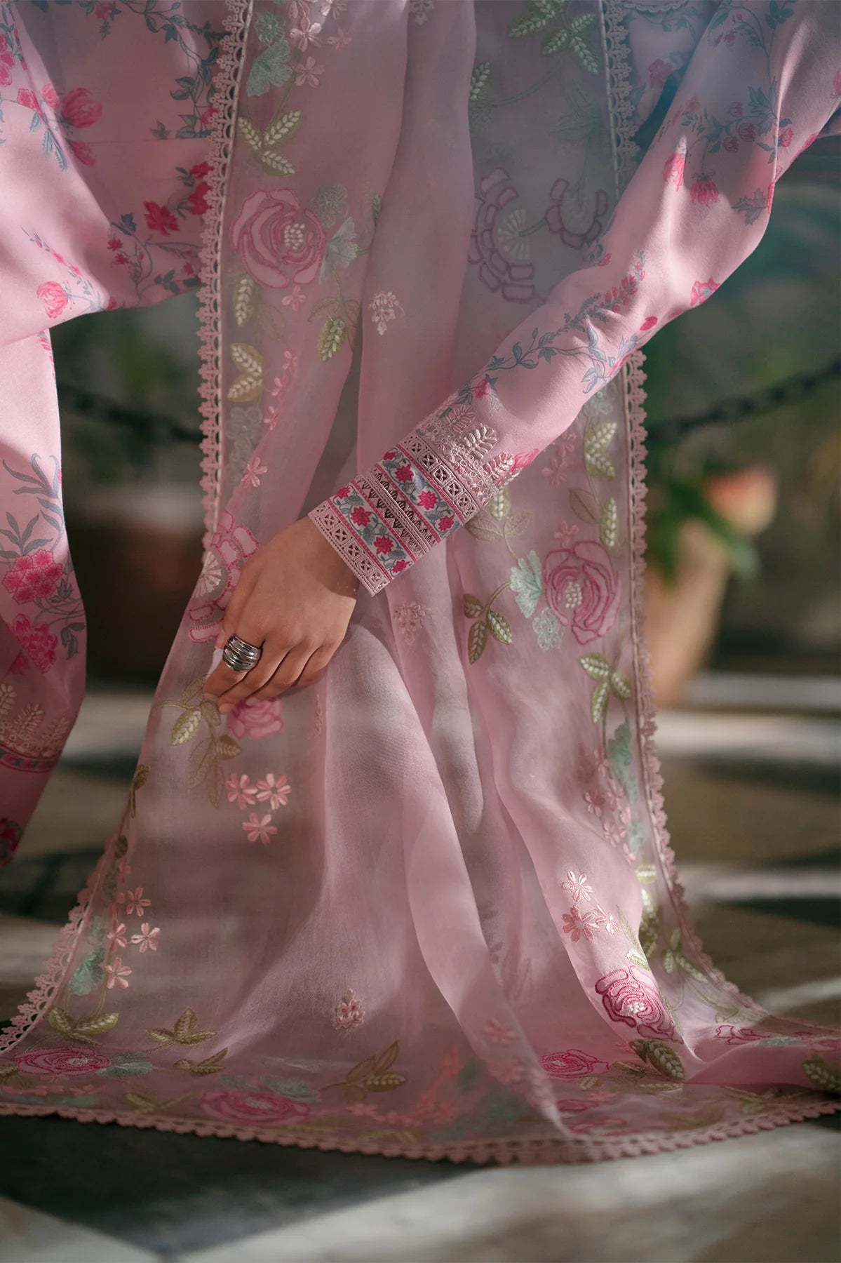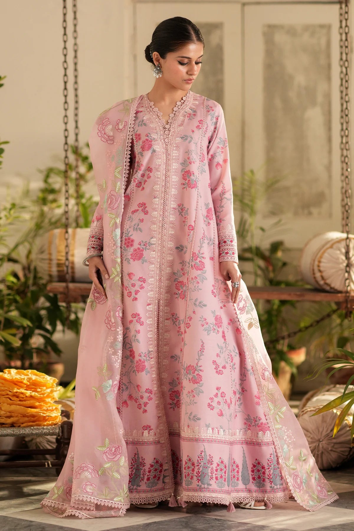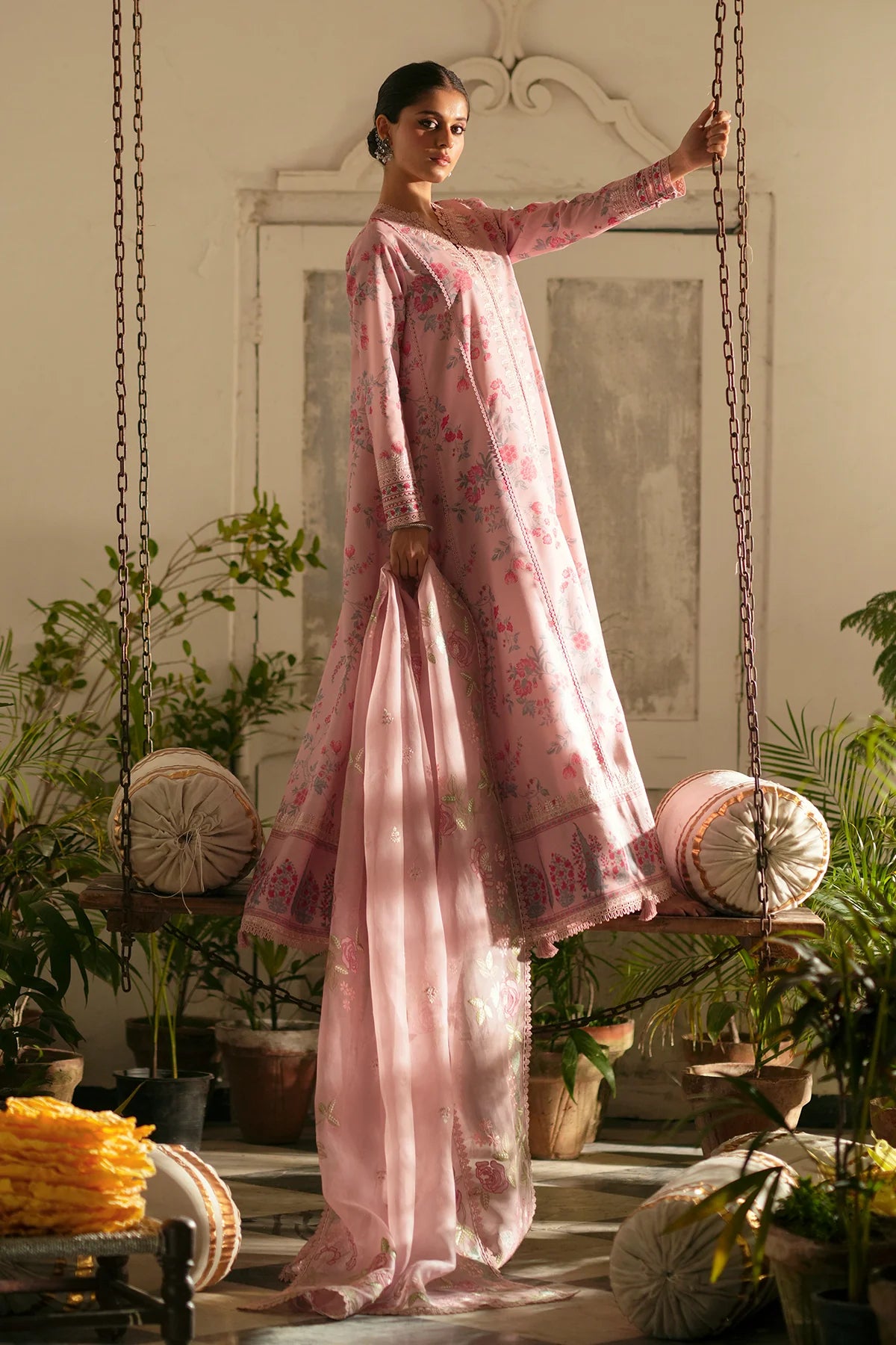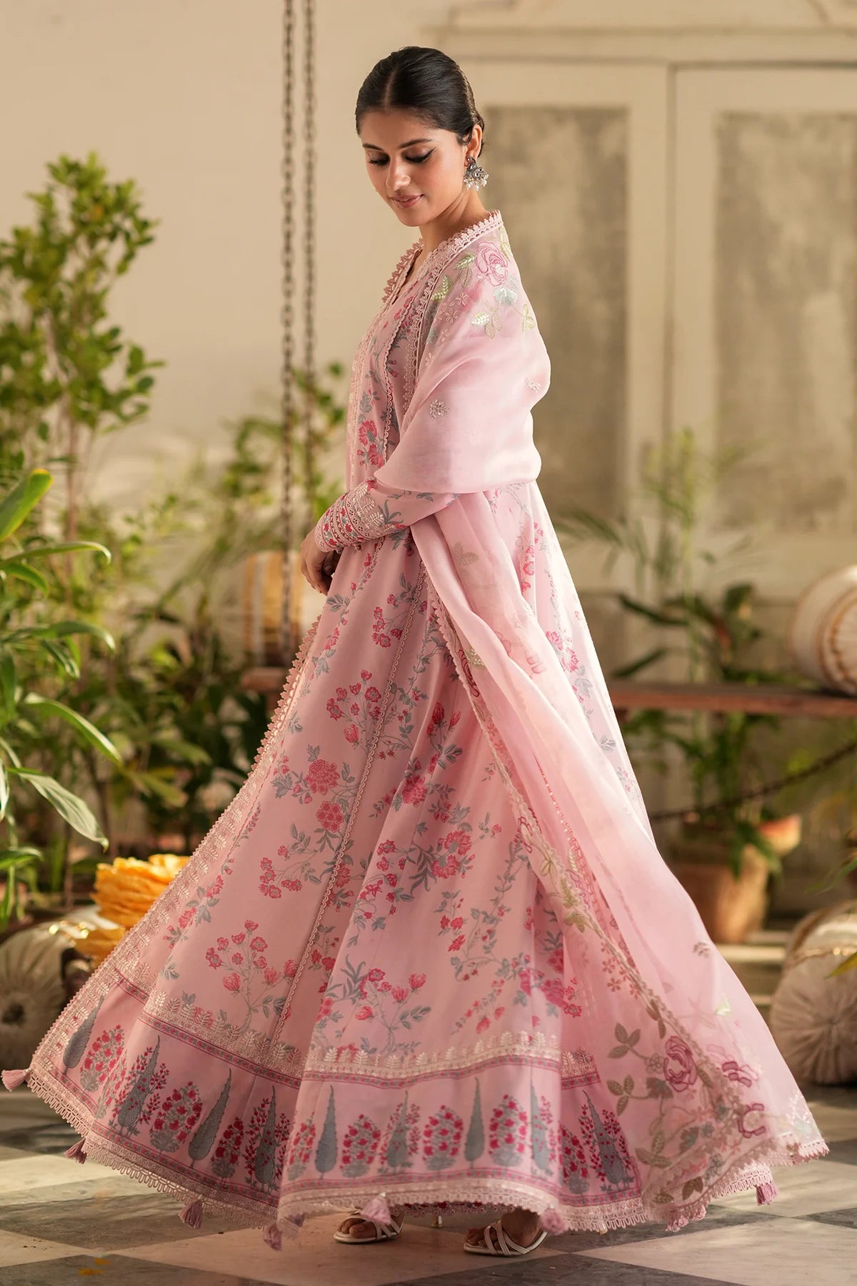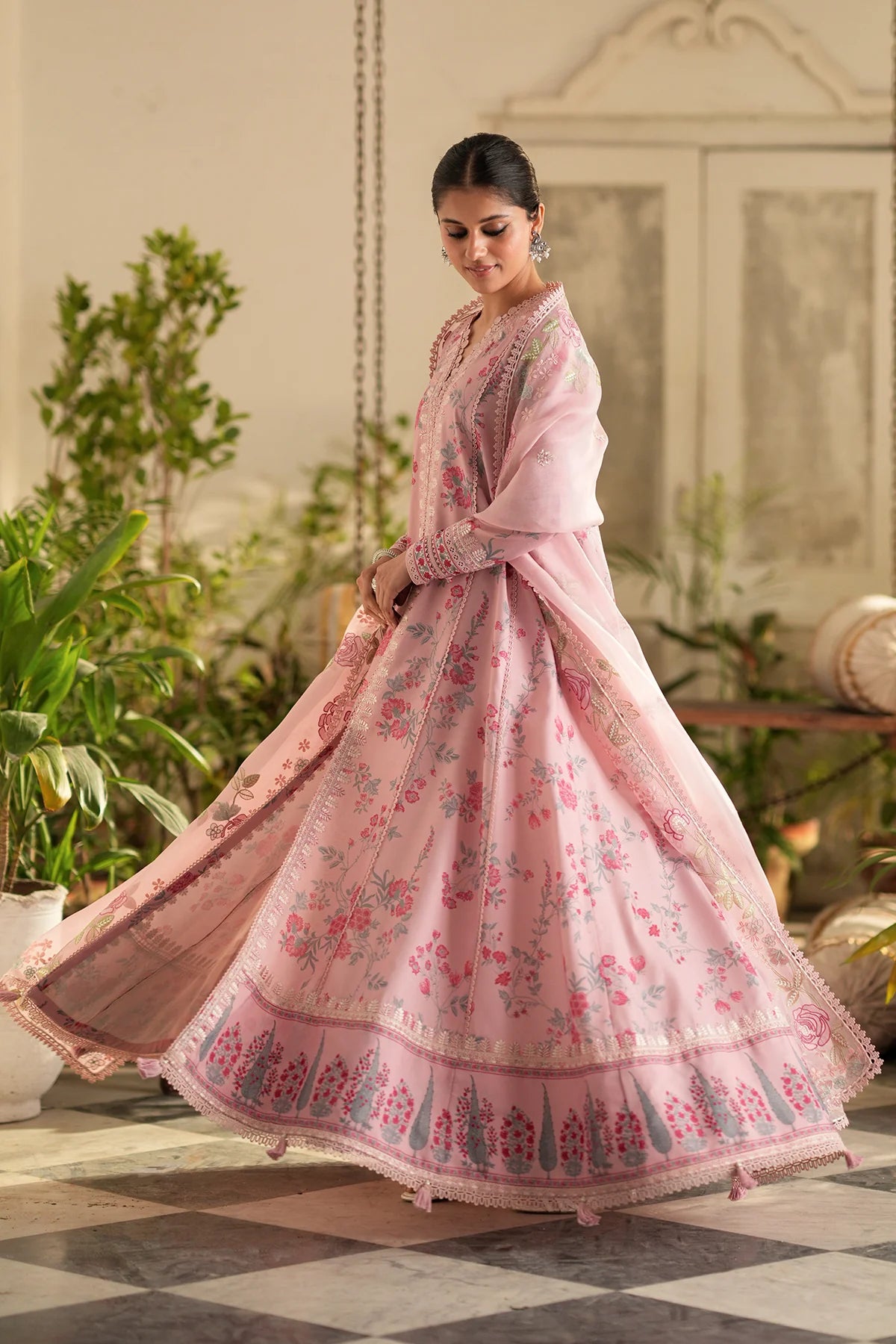 This pastel pink Kalidar features delicate floral prints in soft shades of pink, blue, and green. Its flowy silhouette exudes effortless grace, making it a timeless choice for any occasion. Paired with an intricately embroidered organza dupatta and classic azaar pants, this ensemble is the epitome of elegance.