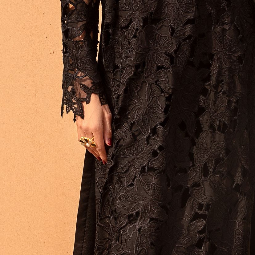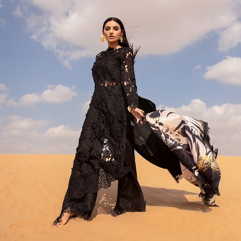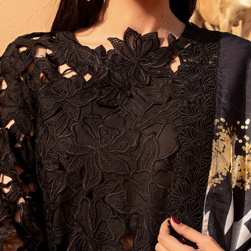 Alaya | Step into modern sophistication with our laser-cutwork embroidered ensemble. The shirt front on dyed lawn showcases intricate cutwork detailing, echoed on the sleeves for a contemporary touch. Complementing the design, the shirt back is elegantly crafted on a dyed lawn. Adding a luxurious element, the ensemble features an embroidered sleeve and front borders on dyed organza, accompanied by a foil-printed silk dupatta. Paired with dyed cotton trousers, this ensemble blends modern aesthetics with timeless charm.