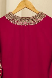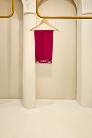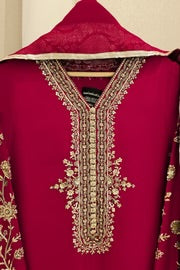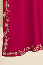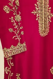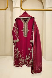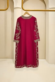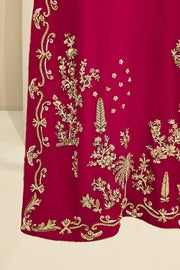 This beautiful design embodies the very essence of ethereal elegance curated on ( pure 60gms ) crimson maroon raw silk. Heavily embellished with gold zardozi work, each stitch is a testament to generations of artistry, whispering tales of heritage and tradition. The Alaya masterpiece comes together with a contrasting soft tissue matching dupatta and embellished trousers as seen, delicately adorned with gold ada/handwork. Our signature elegance, stitched into every seam.