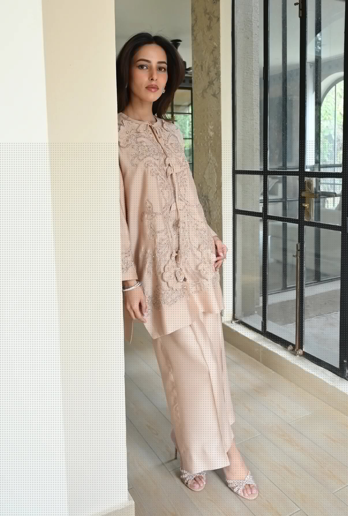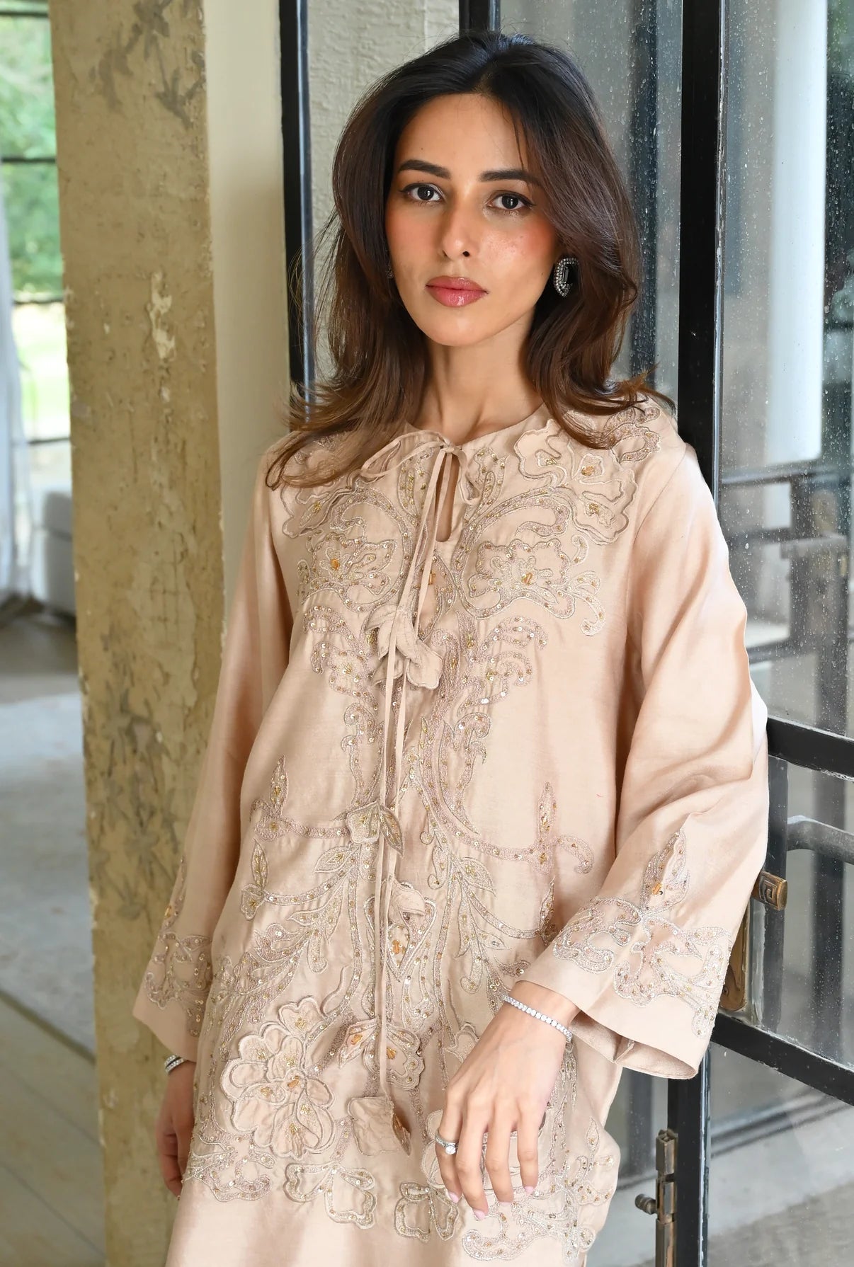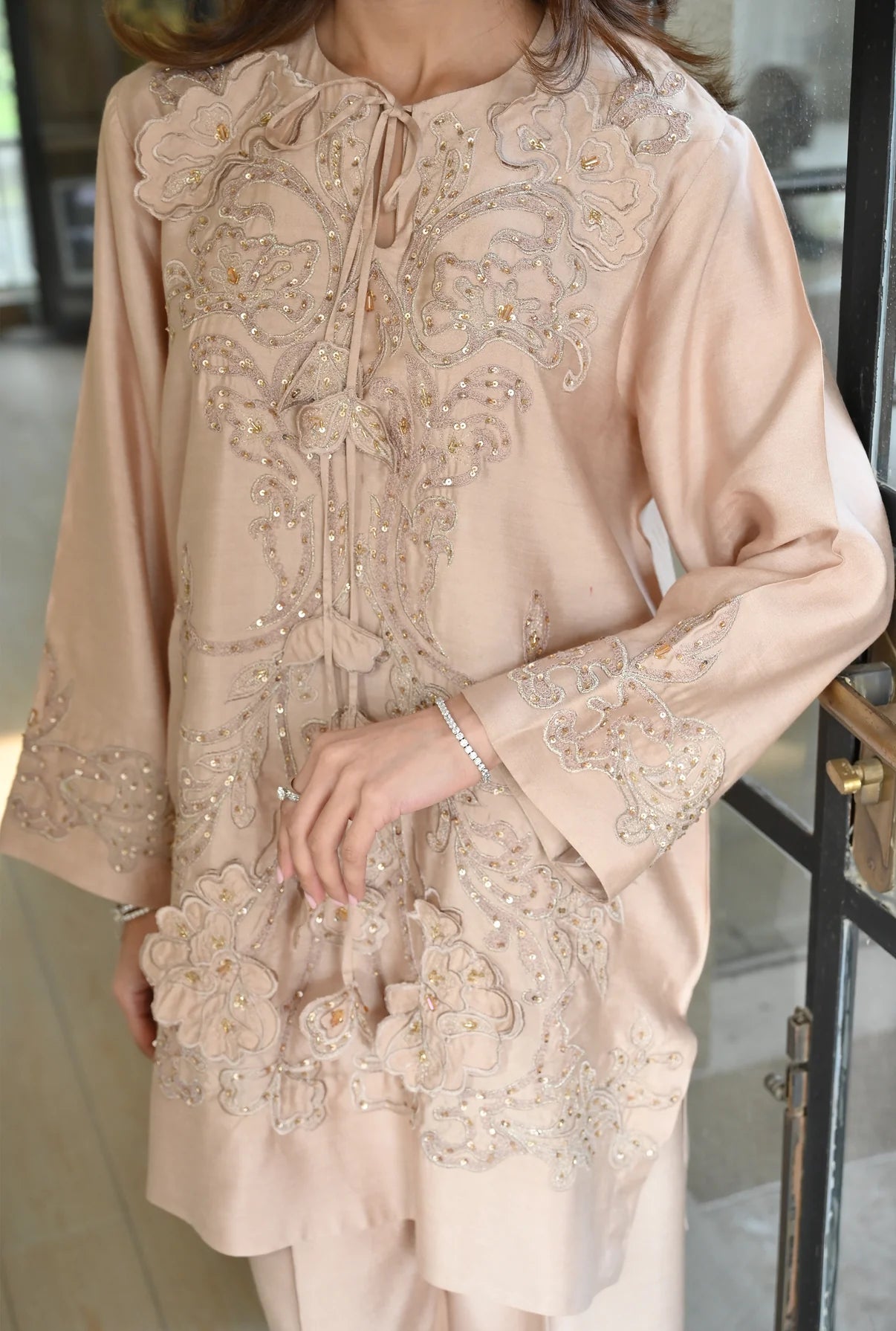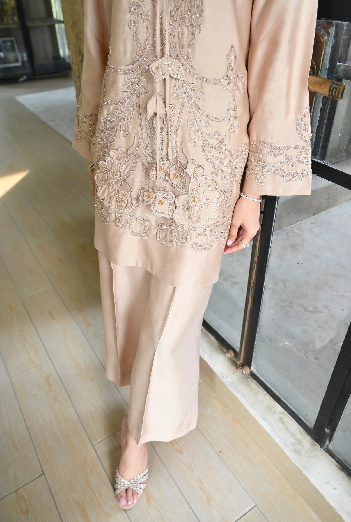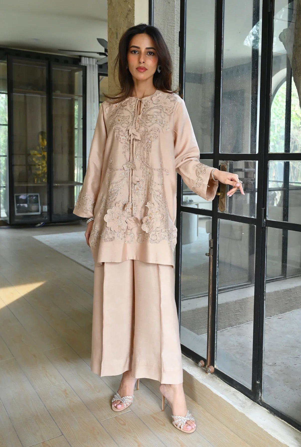 This 2-piece set comes in a warm, sandy beige tone, tailored from Pure Kora Silk. The front of the shirt is heavily worked with tonal appliqué and fine hand embroidery, featuring floral patterns that are further highlighted with shimmering sequins for a touch of sparkle. The neckline is a unique feature of this piece, designed with a delicate tie-up detail and handworked tassels that add a playful yet artisanal feel. To balance the detailed shirt, it’s paired with matching wide-leg trousers that offer a clean, flowing look.