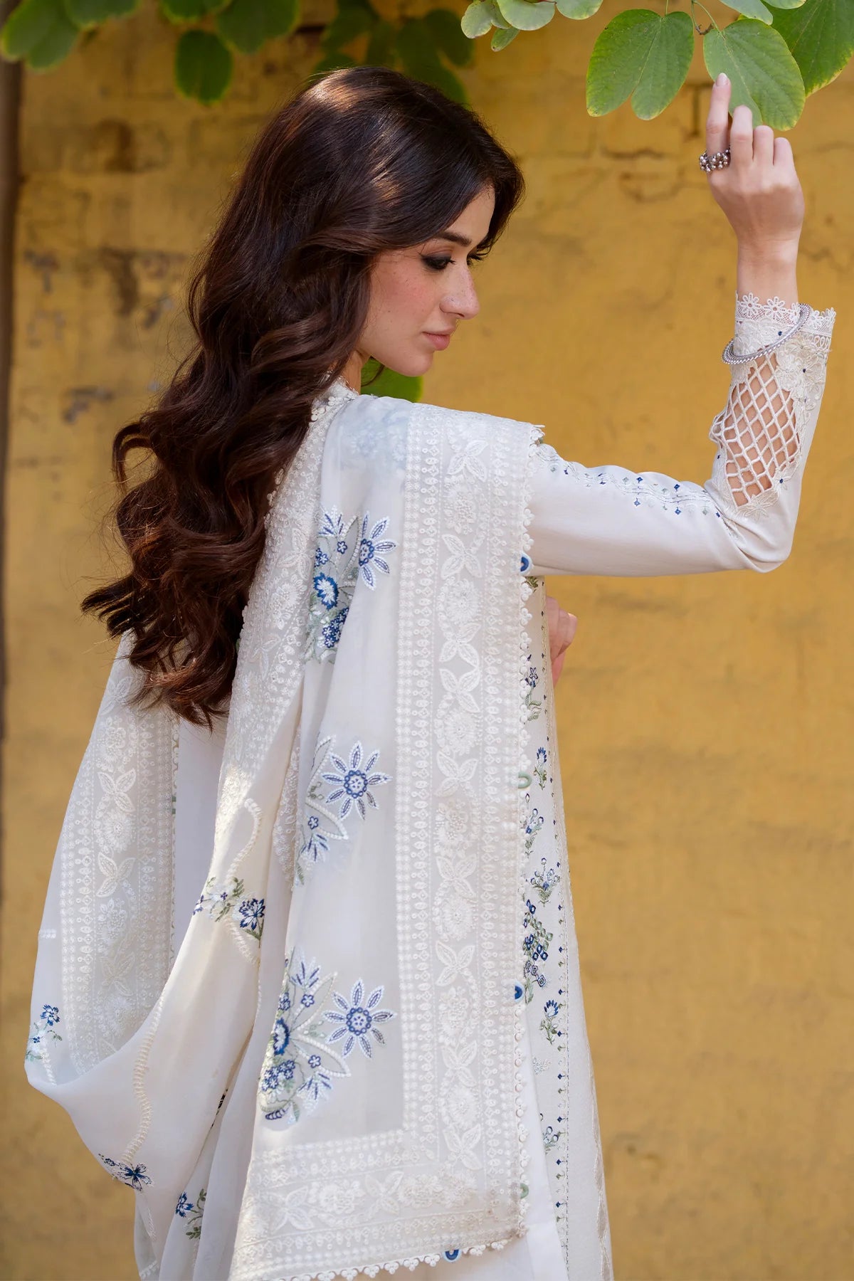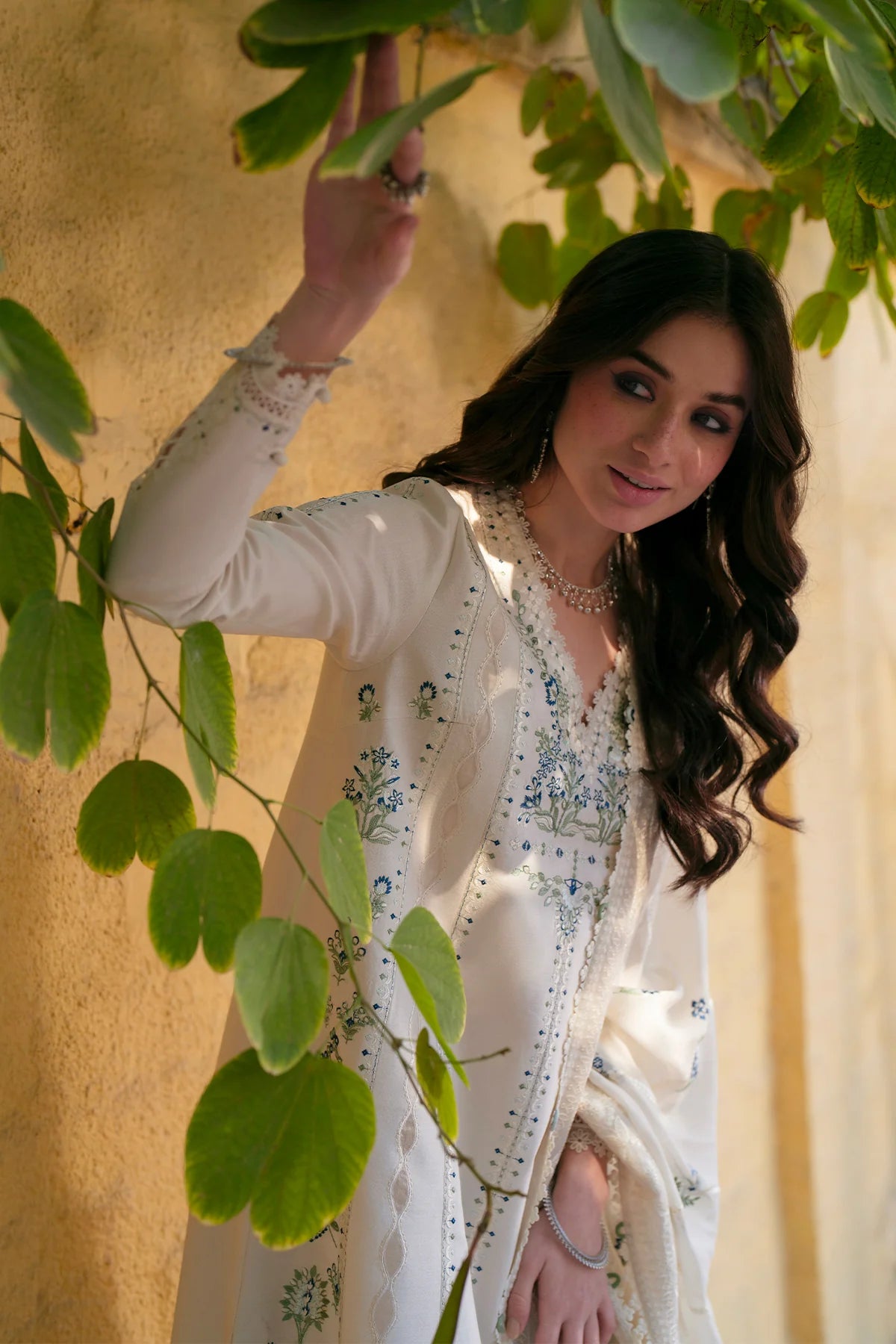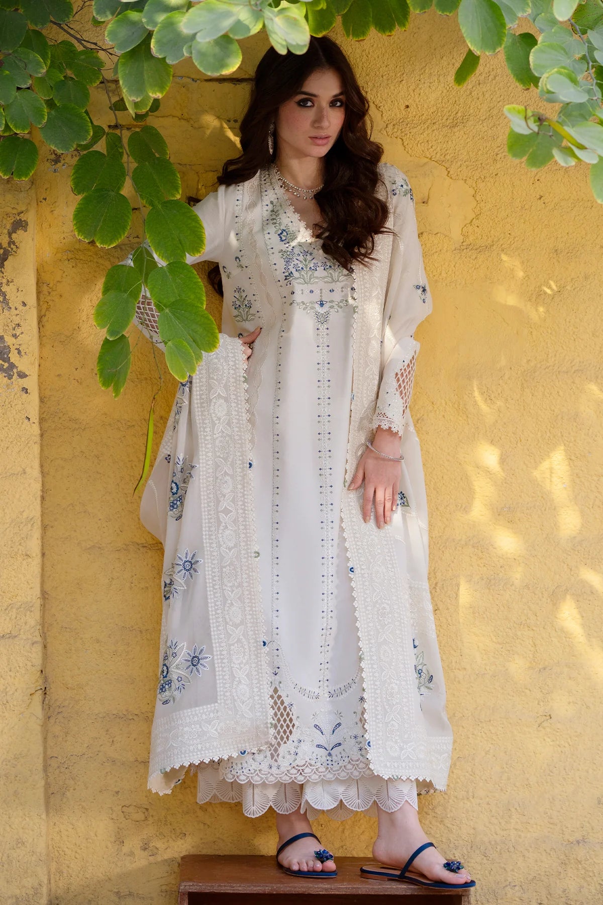 A timeless white kurta adorned with intricate embroidery in stunning shades of blue, beautifully crafted with delicate laser-cut detailing. Paired with elegantly embroidered chiffon dupatta and chic culottes, this ensemble is a perfect blend of sophistication and craftsmanship.
