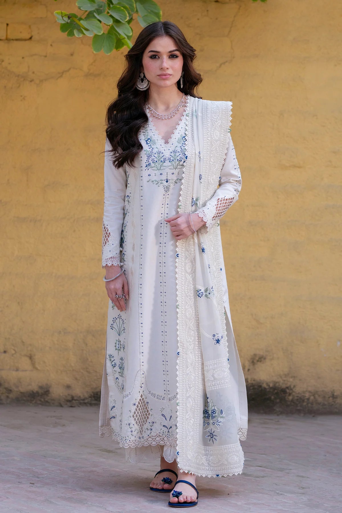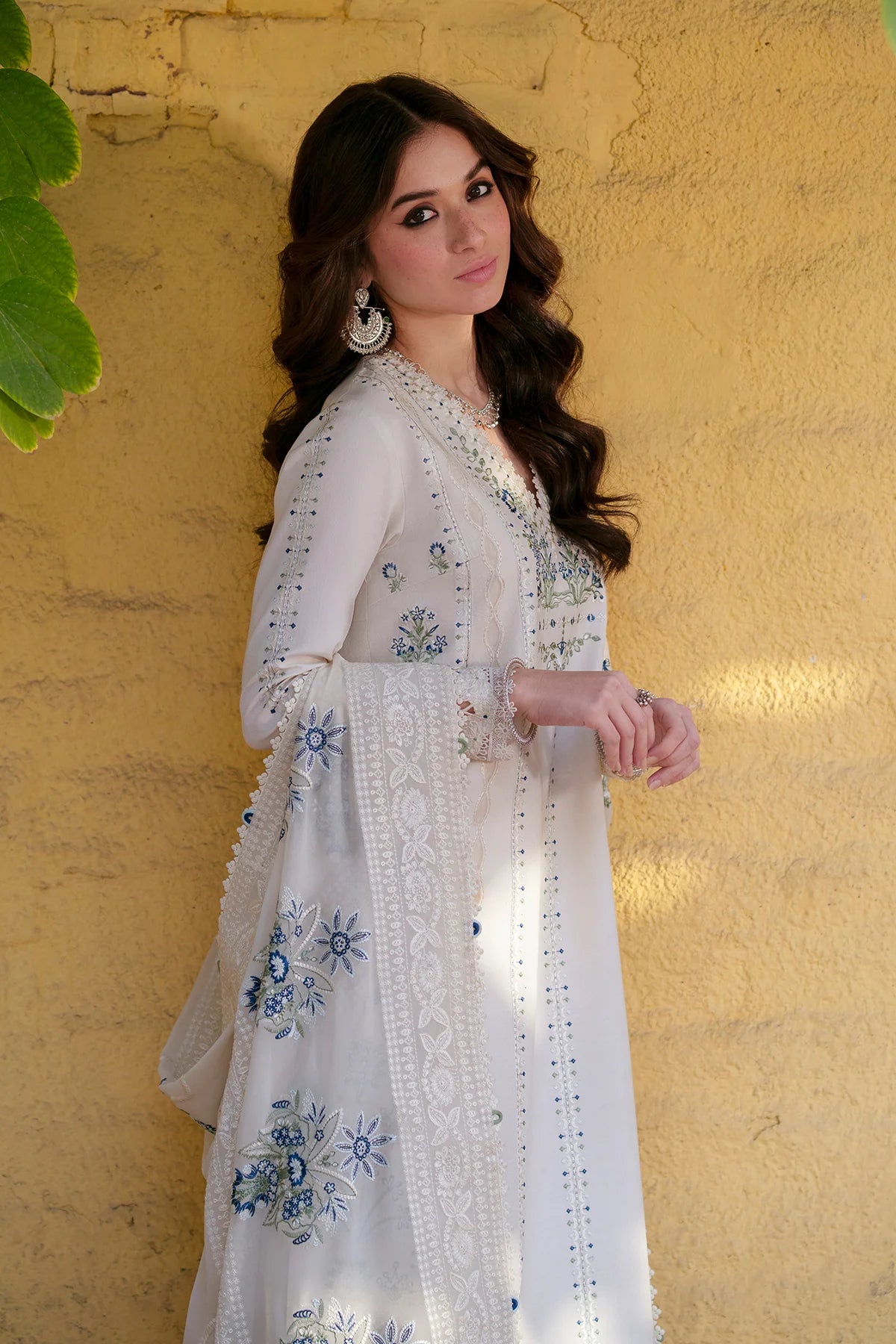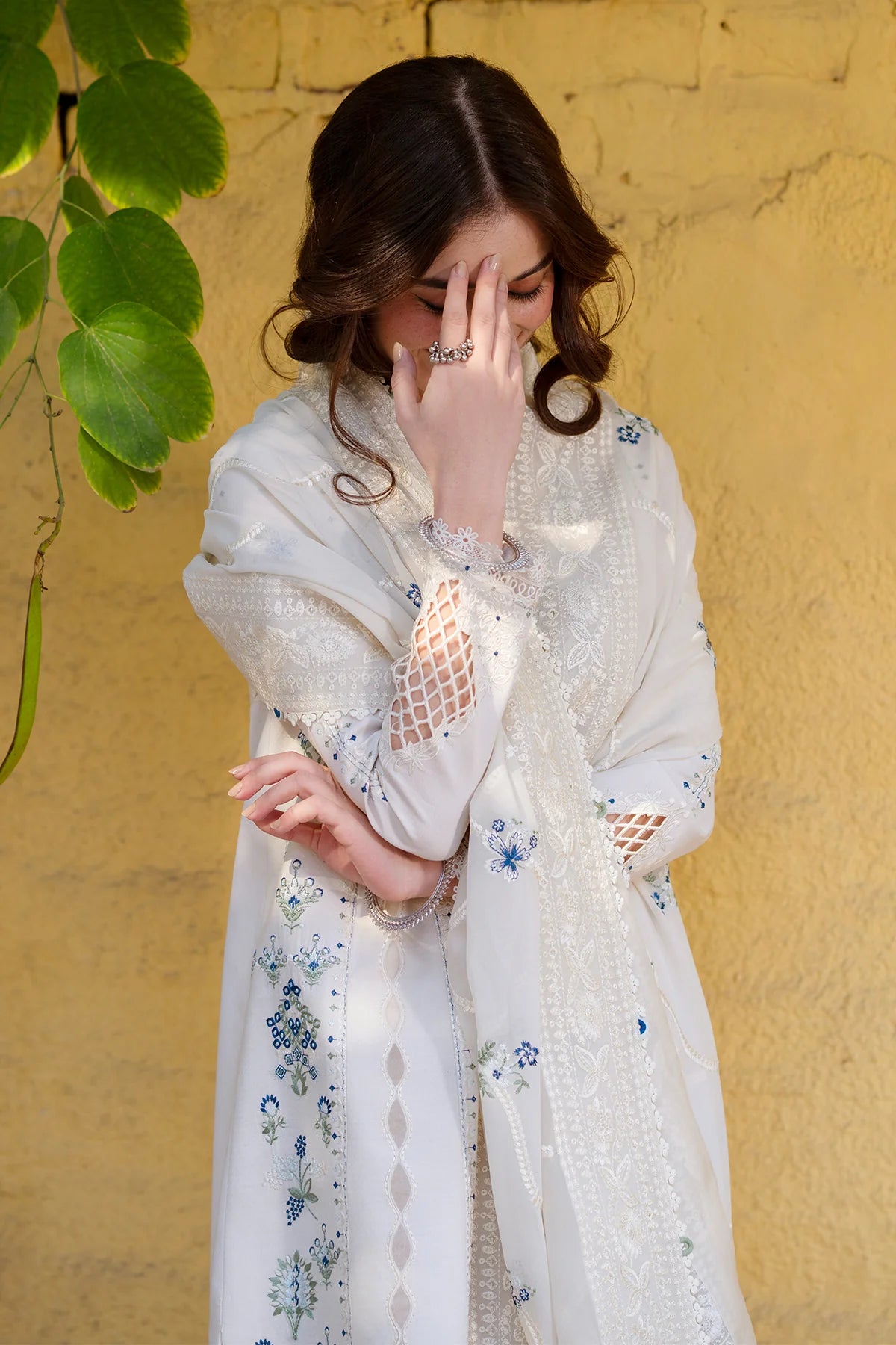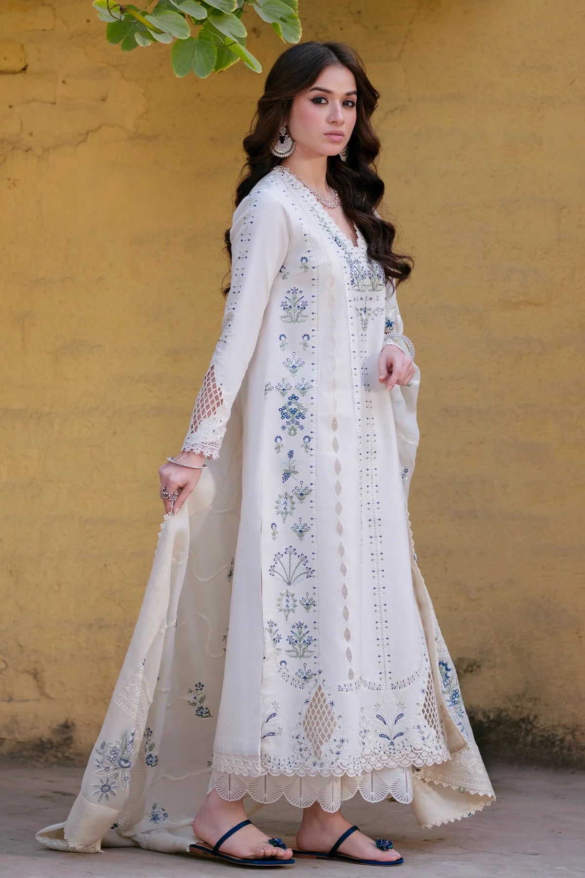 A timeless white kurta adorned with intricate embroidery in stunning shades of blue, beautifully crafted with delicate laser-cut detailing. Paired with elegantly embroidered chiffon dupatta and chic culottes, this ensemble is a perfect blend of sophistication and craftsmanship.