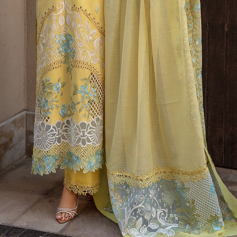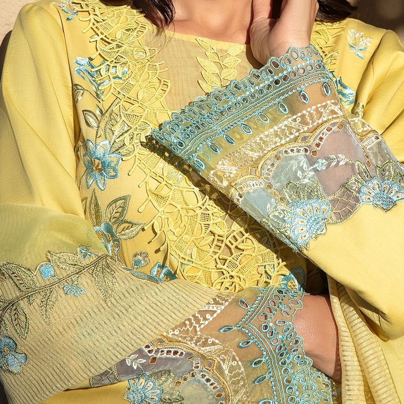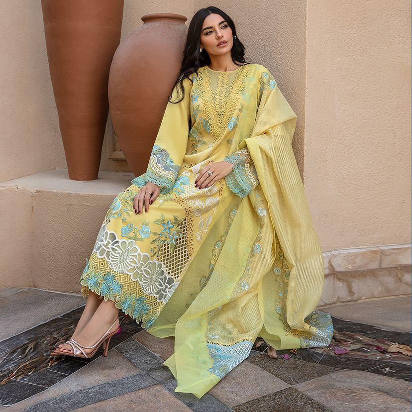 Amani | Dive into elegance with our exquisite ensemble featuring an intricately embroidered shirt front on dyed lawn, complemented by a matching dyed lawn shirt back and sleeves. The ensemble boasts a touch of luxury with embroidered borders on dyed organza, along with additional embroidered patches and motifs for added finesse. The embroidered dupatta, gracefully crafted on dyed organza, includes a pallu for added allure, while dyed khaddi net enhances its beauty. Paired with comfortable dyed cotton trousers, this ensemble is a celebration of detailed craftsmanship and sophistication, perfect for any occasion.