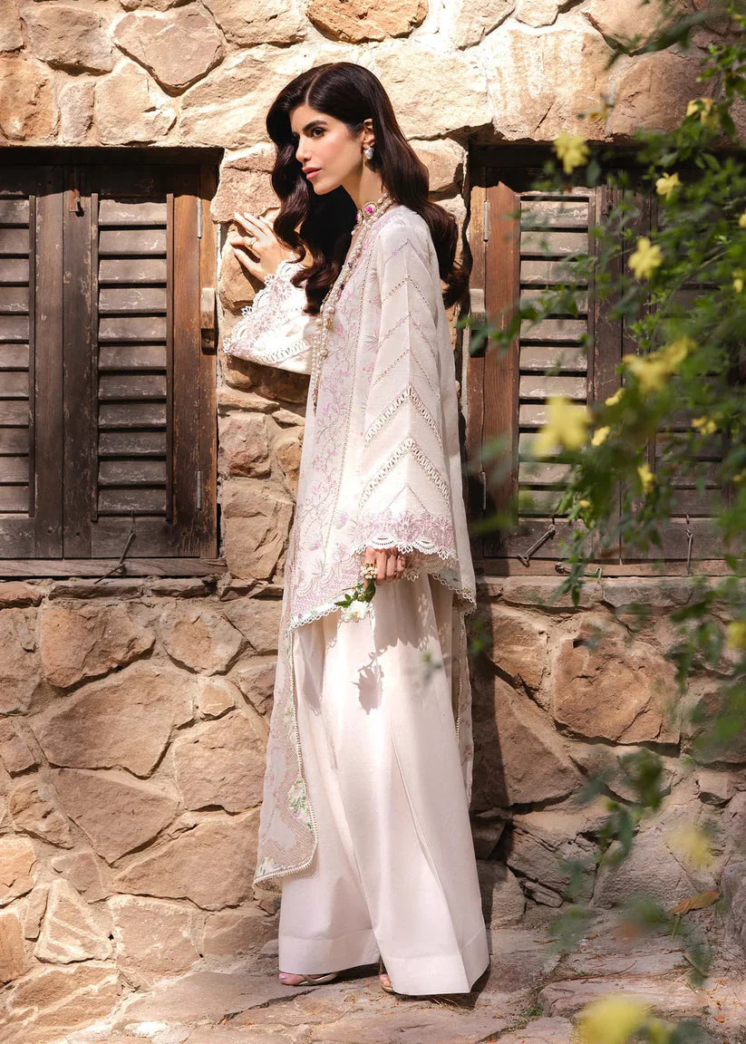 This stunning three-piece ensemble showcases exceptional craftsmanship, blending traditional and modern elements with precision. The premium white jacquard lawn shirt features intricate embroidery, schiffli work, and delicate lace detailing, all expertly applied to create a soft, feminine look. Techniques used include embroidery, schiffli work, lace trimming, and loop stitching, which adds texture and visual interest to the design. The beautifully tailored white farshi shalwar provides a flowing silhouette, while the white chiffon embroidered dupatta features printed borders and delicate embroidery, tying the entire look together with elegance.