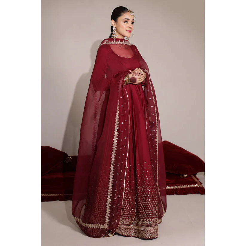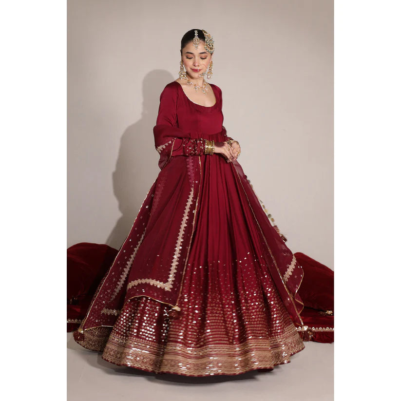 Anari Red shamooz Silk anarkali adorned with sequins and tilla embroidery and a heavy back tassel paired with a churidar trouser and organza embroidered and tasseled dupatta.