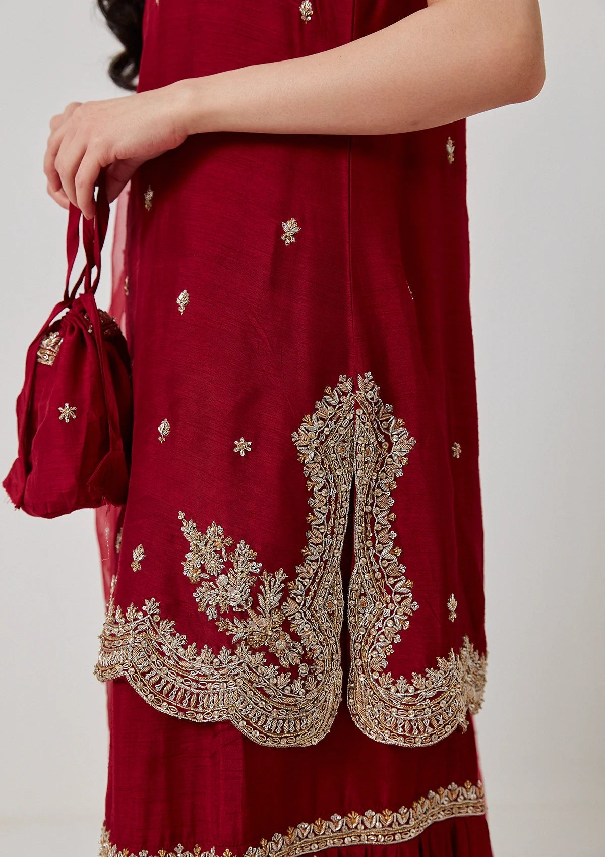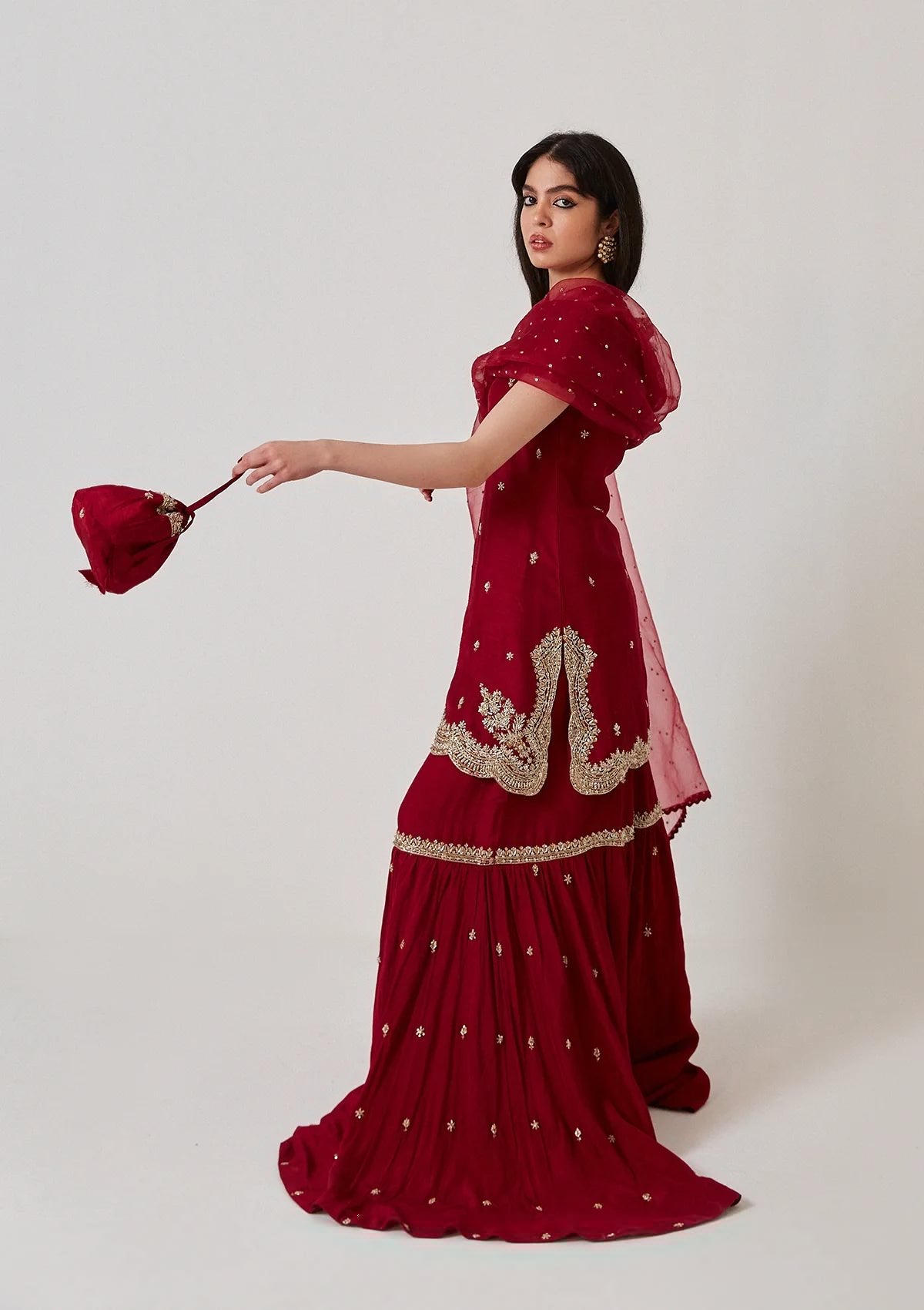 Aria is an ode to old school ghararas depicting nostalgia. Shirt and gharara are made on korean raw silk and are embellished by hand. Duppatta is on semi-organza, with heavy spray of diamantées like a beautiful starry night. We’ve kept the designing clean, no iota of fuss and effortless, blending in past and present to create something timeless.