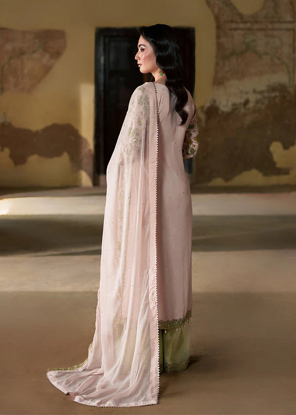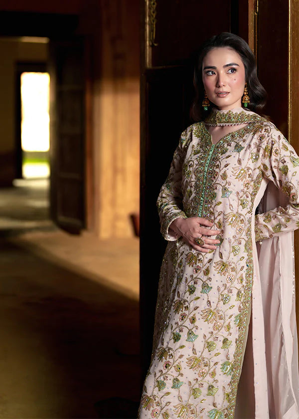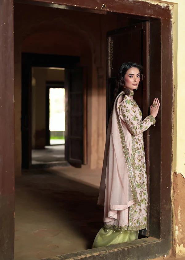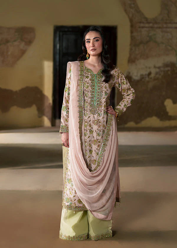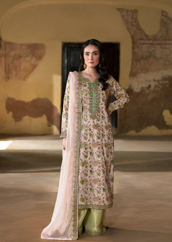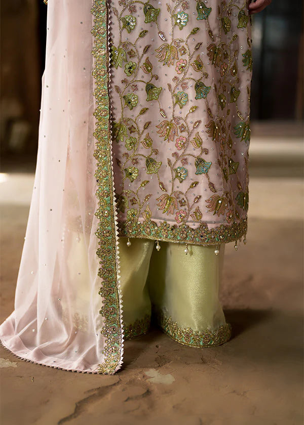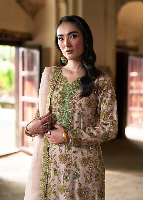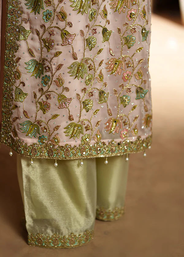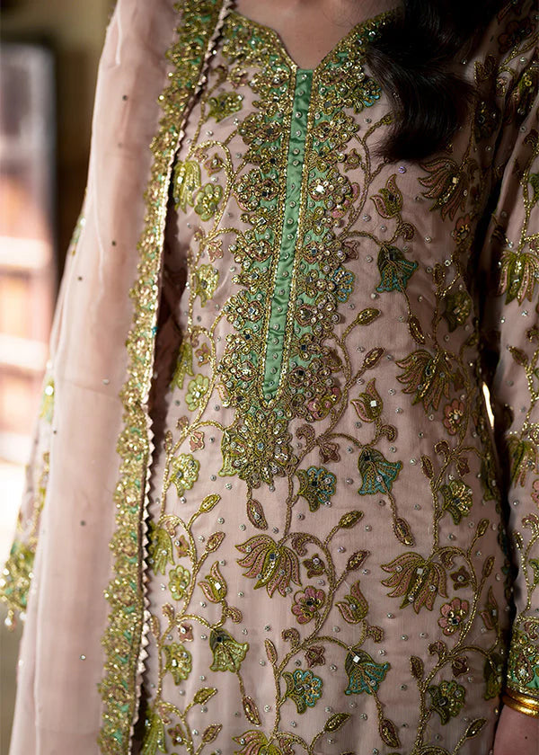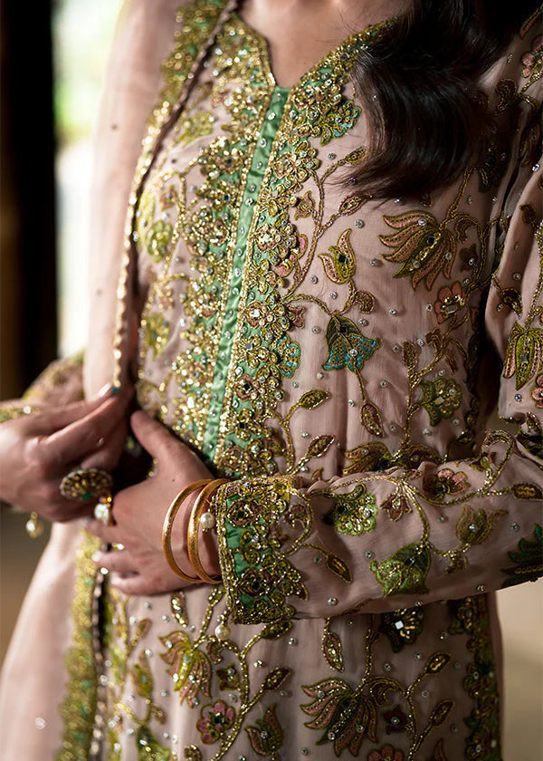 Where delicacy meets devotion, hand-embroidered blooms unfurl across a canvas of blush, kissed with hues of green that whisper of springtime royalty A creation that breathes grace, woven for moments meant to be cherished forever.