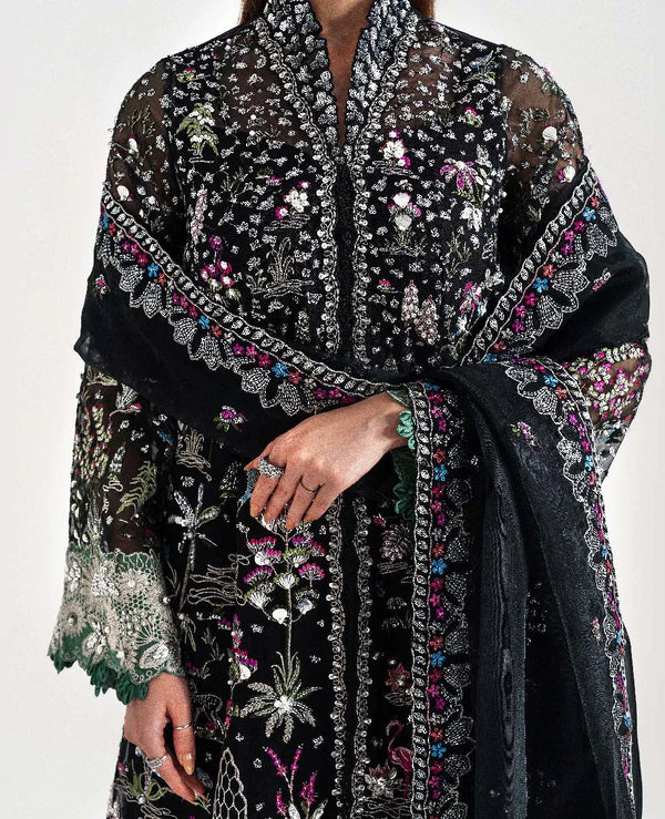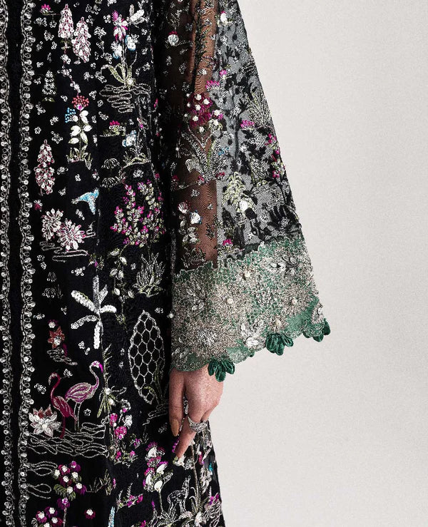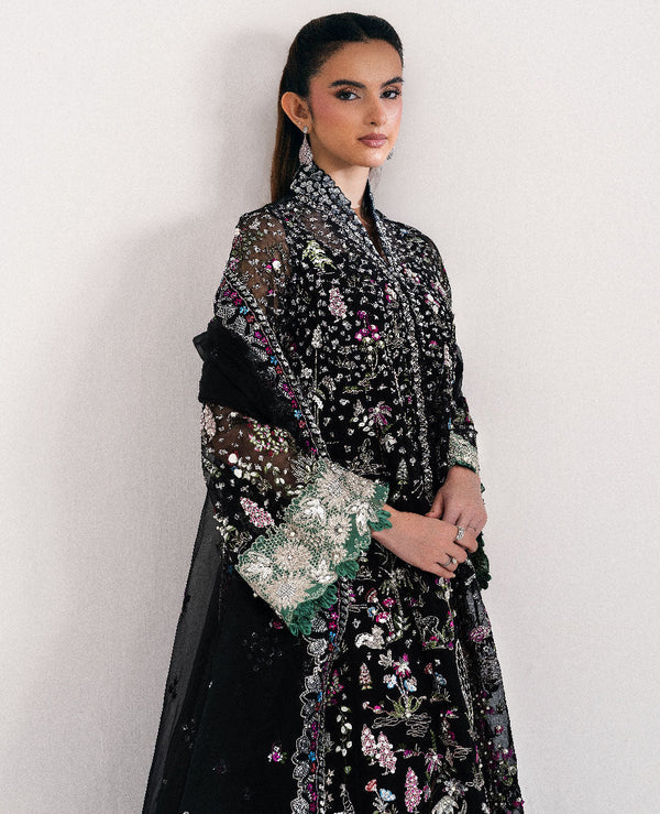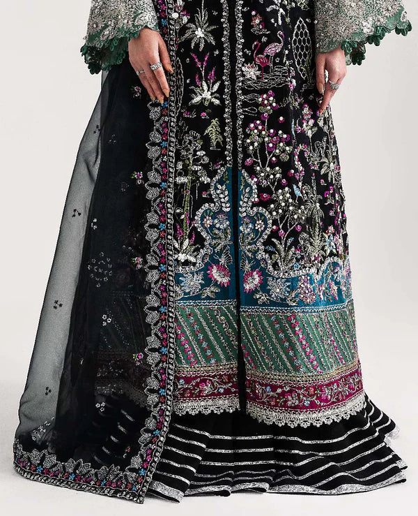 A black, six-paneled organza shirt adorned with intricate shikargah motifs intertwined with delicate florals cascading across the panels. Serene blue arches complement two hem borders in green and hot pink, finished beautifully with lace. The shirt features a sequin collar, while the sleeves are richly decorated with sequins and floral embroidery, highlighted by a green border and looped detailing at the cuffs. The organza dupatta showcases a sequin spray at the center, framed by a four-sided floral border. Completing the ensemble are black raw silk lehnga trimmed with gotta borders at the hem.