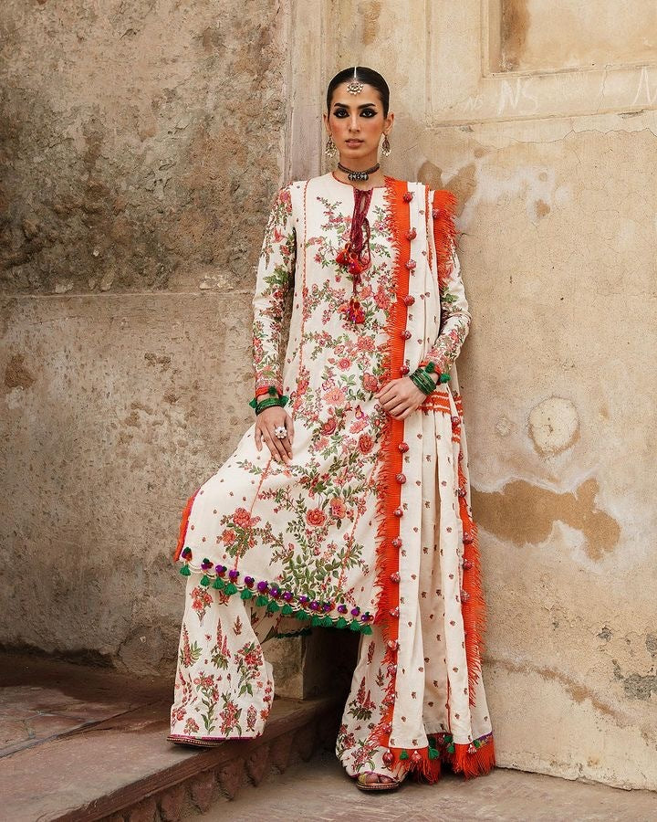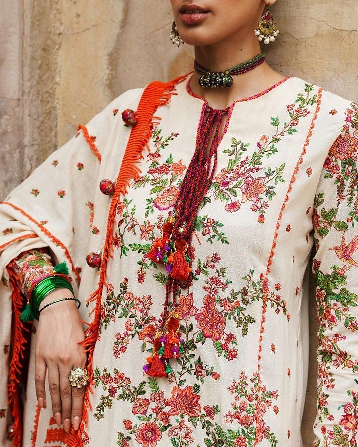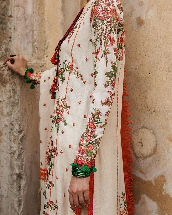 Embrace the essence of timeless elegance with our Bellis ivory attire from the Karandi AW'23 collection. The vivid orange and green floral embroidery creates a stunning visual. Paired with an equally embroidered Karandi shawl, this ensemble harmoniously creates a symphony of beauty and style.