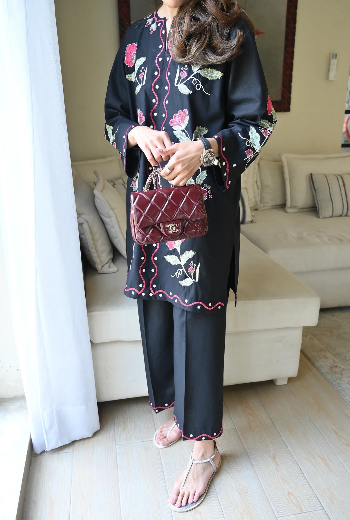 This 2-piece set comes in a crisp white color, made from Soft Linen that feels light and airy, perfect for a relaxed day out. The shirt features a simple round neckline with a clean slit, while the front and sleeves are detailed with beautiful floral embroidery. Paired with matching minimally detailed trousers, this ensemble is an easy, go-to choice for a fresh and effortless casual look.