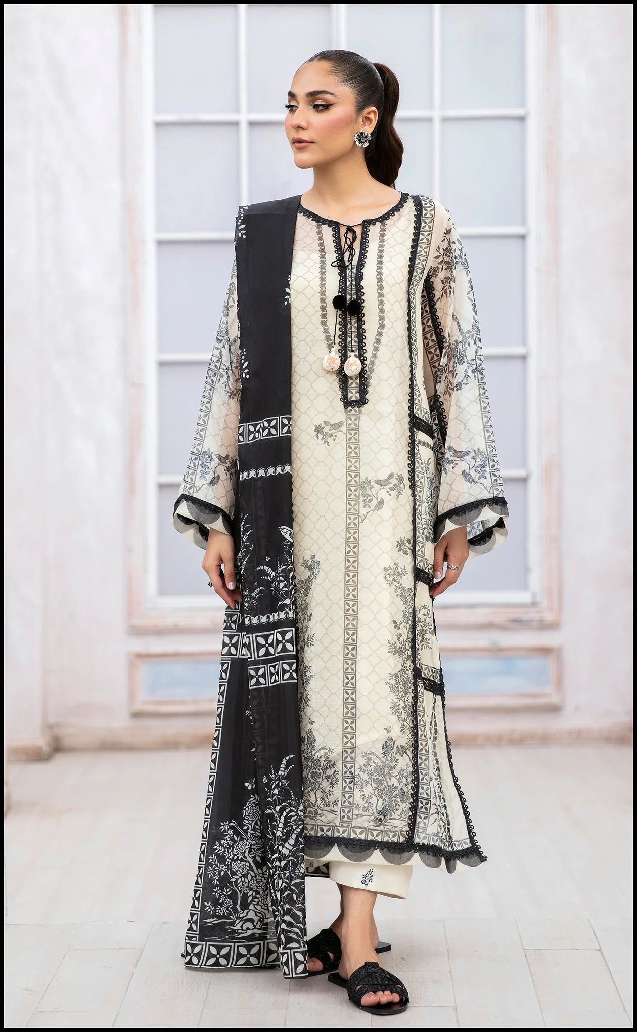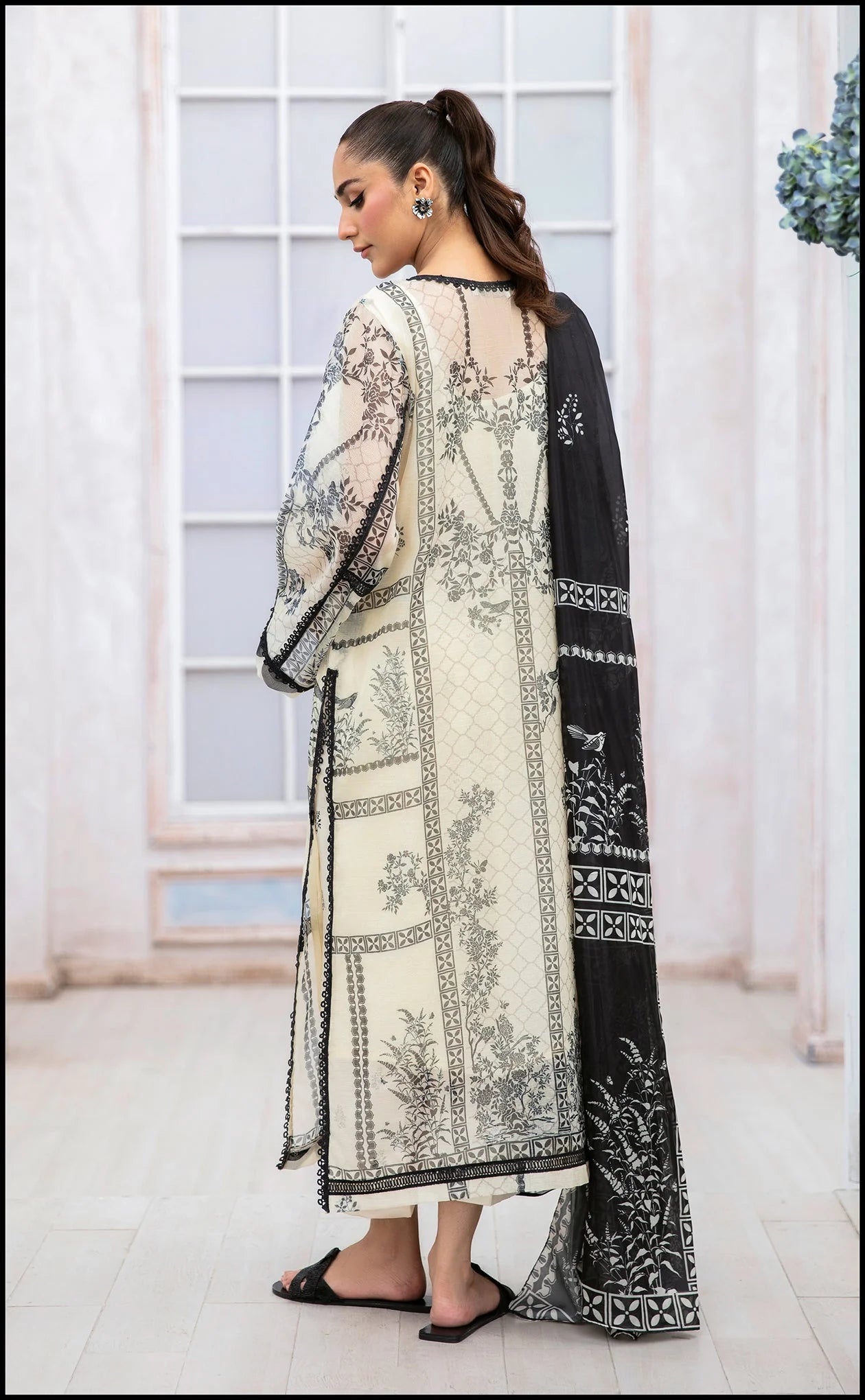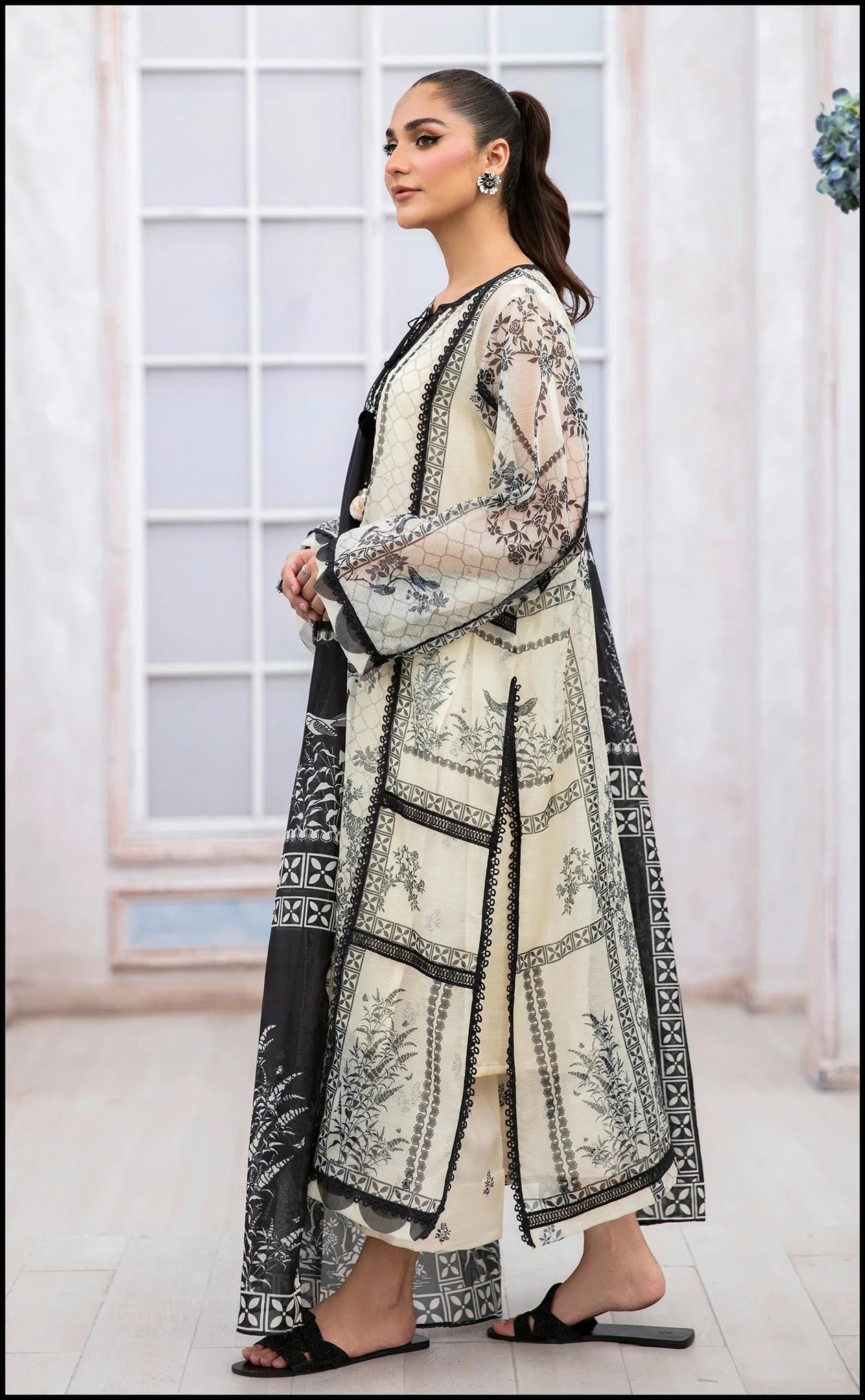 A monochrome printed shirt cut from organza fabric, put together with a black medium silk dupatta giving a flawless mix of elegance and allure.