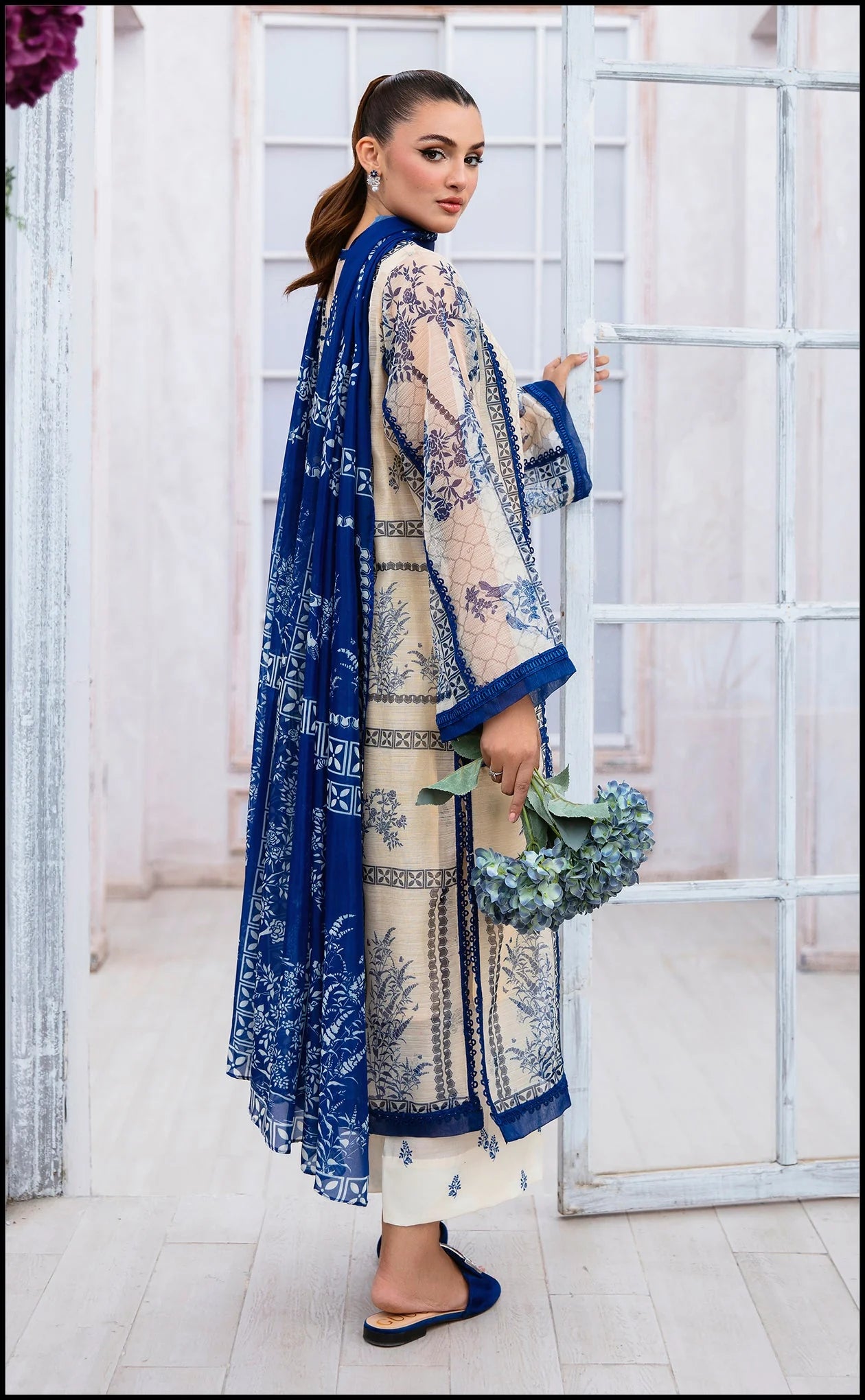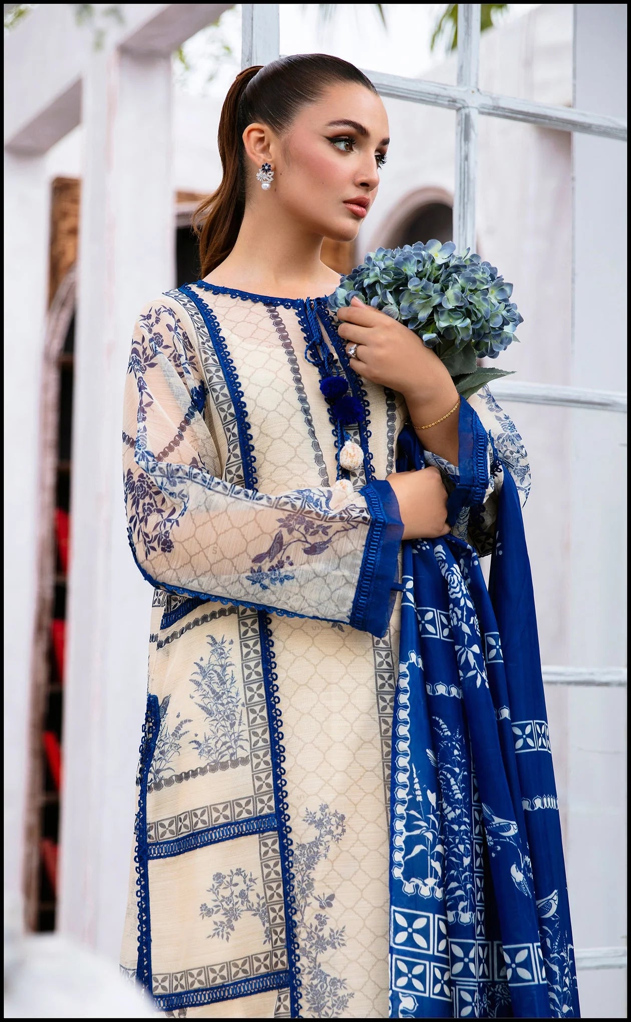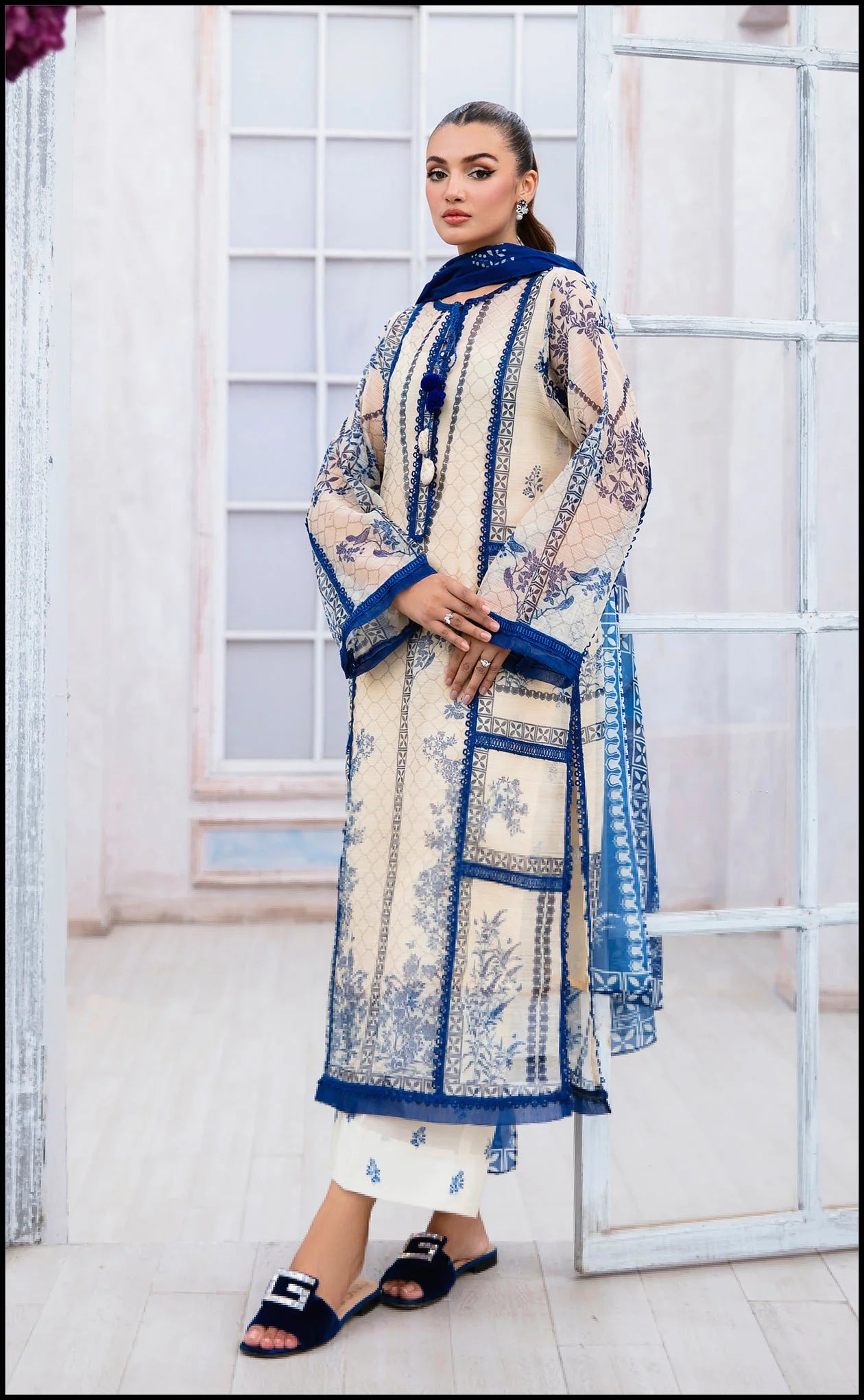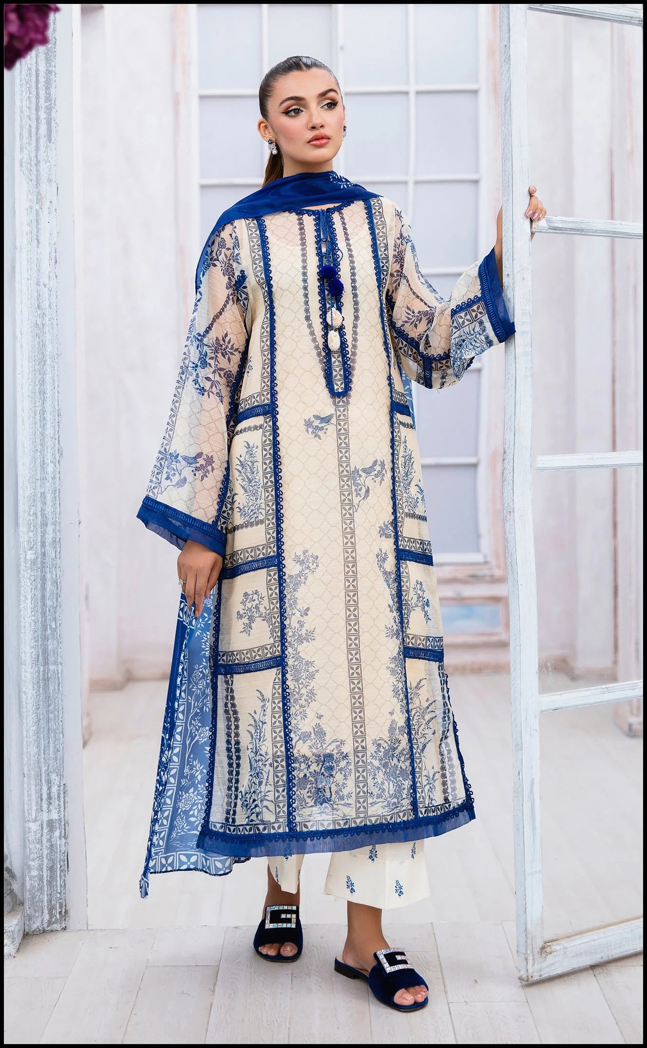A radiant blue printed shirt cut from organza, fused with a striking blue medium silk dupatta giving a flawless mix of elegance and allure.