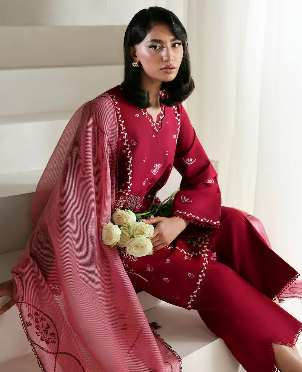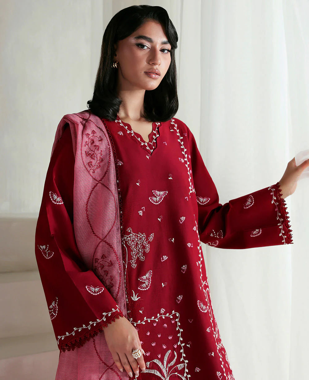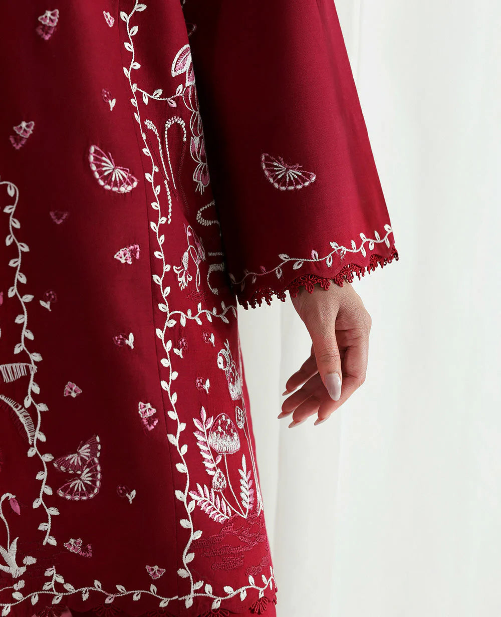 A mid-length boxy shirt inspired by the traditional Shikargah theme, featuring a structured, panelled silhouette brought to life with intricate white color-block embroidery. The design strikes a balance between heritage and modernity, offering a bold yet elegant look. It is paired with straight-fit pants for a clean, tailored finish. The ensemble is completed with a contrasting dusty pink dupatta, beautifully framed with a bold four-sided embroidered border — adding richness and definition to the overall look.