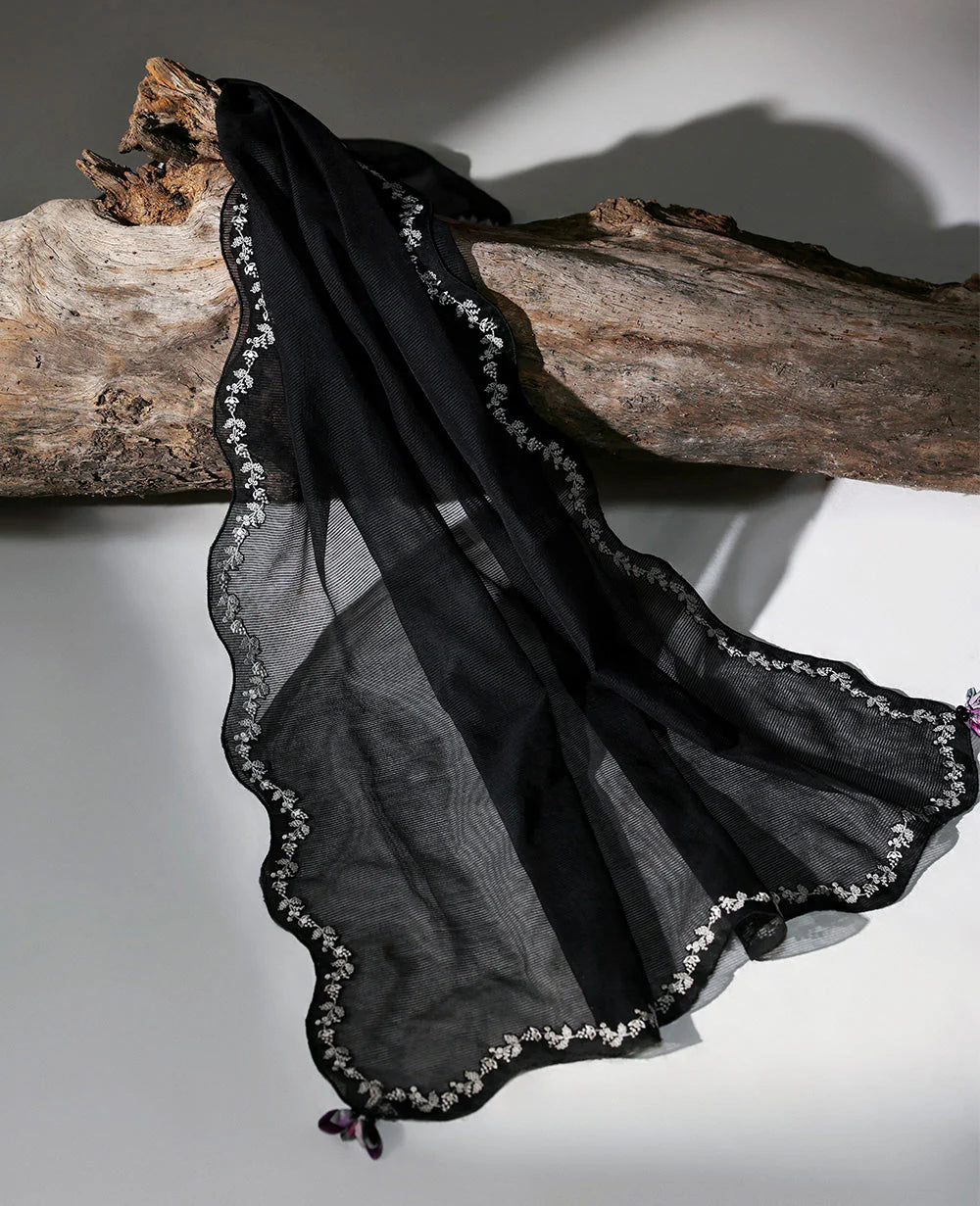 This long black shirt features crisp white structural details and bold color blocks with delicate embroidery in shades of hot pink and red. Paired with matching trousers and a black dupatta finished with a white embroidered border and tassels, it’s the perfect blend of modern style and subtle elegance.