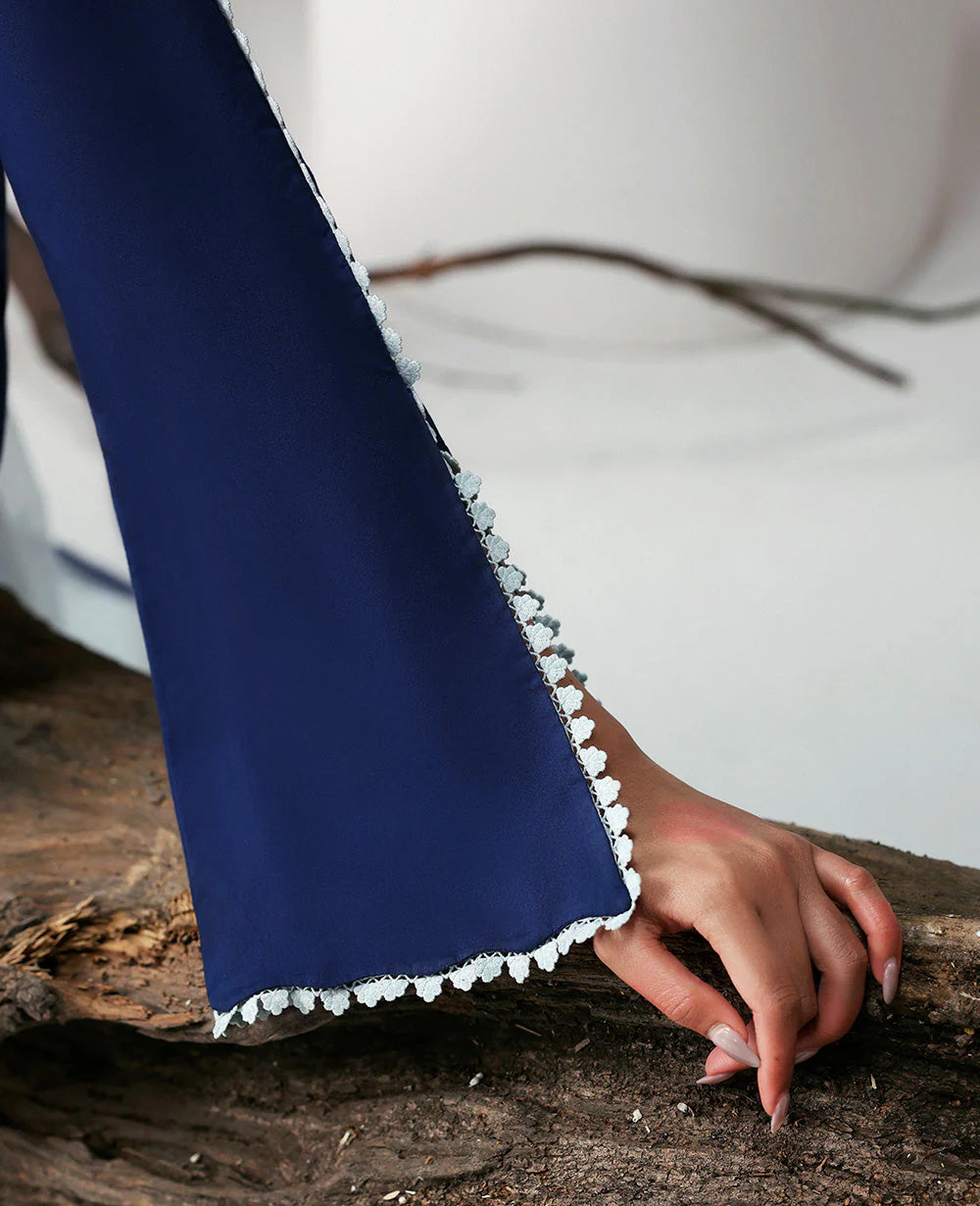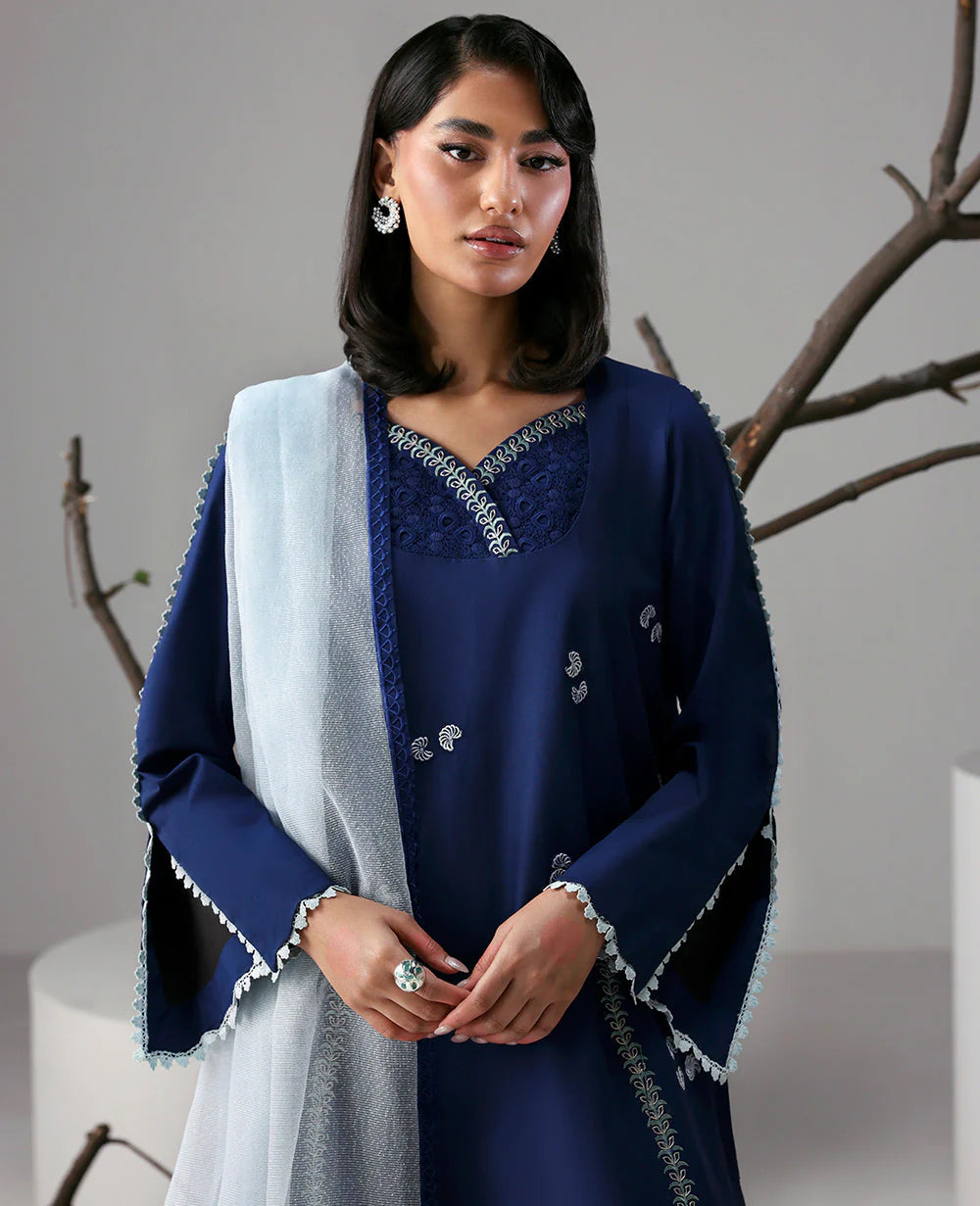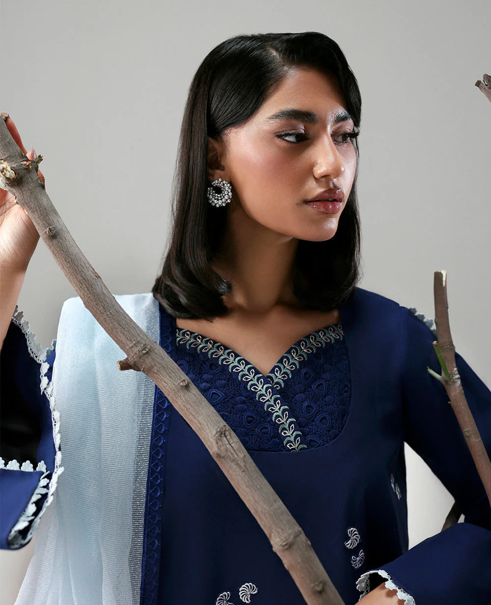 This long-length navy blue shirt features delicate floral embroidery and leafy vines, highlighted by a chic asymmetric neckline. Paired with a contrasting ice blue dupatta with navy color-block corners and detailed trousers, this ensemble blends tradition with contemporary style.